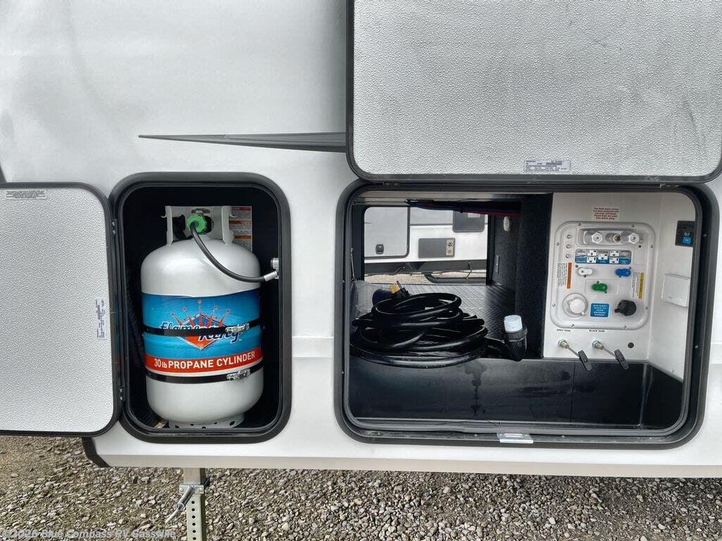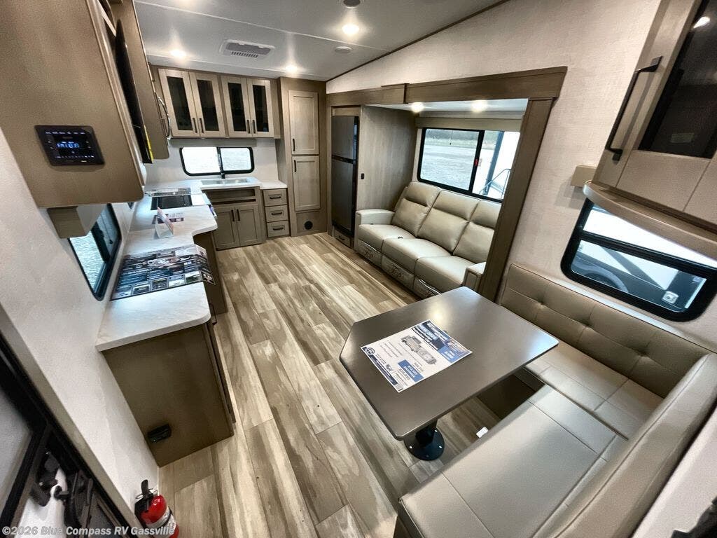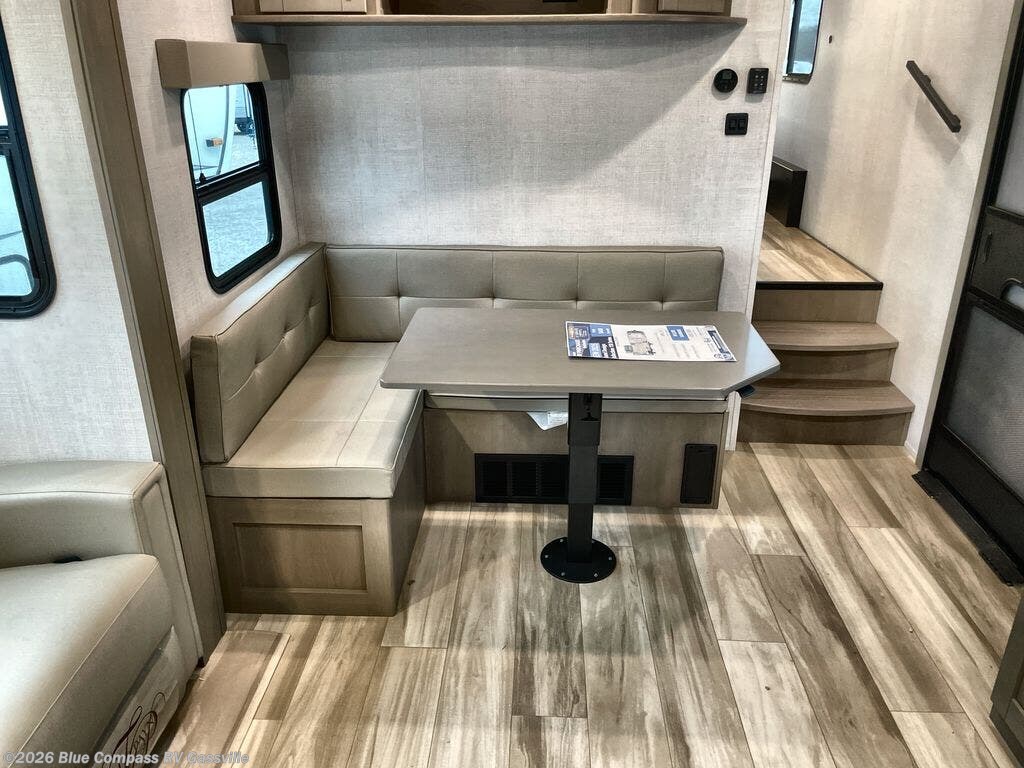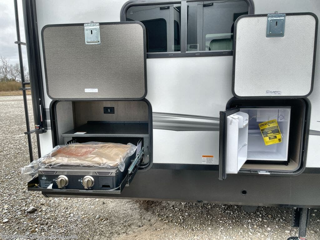 You will love this fifth wheel featuring a single slide for added interior living space and all the comforts and conveniences it provides you while you travel. The slide features a 78" theater seat plus there is a breakfast nook for more seating. Both can easily view the entertainment center with 40" TV. A rear kitchen indoors provides everything you need to create meals like home while on the road, and if you want to spend as much time outside as possible, then the outdoor griddle will certainly accommodate you for meals. Up front, a cozy private bedroom with queen bed, wardrobe, and overhead cabinets. Right next door, you will find a large walk-in shower, as well as a toilet, and a vanity with sink and linen cabinet for your towels and toiletries. You will also love the full unobstructed pass-through compartment for all of your gear, plus so much more!