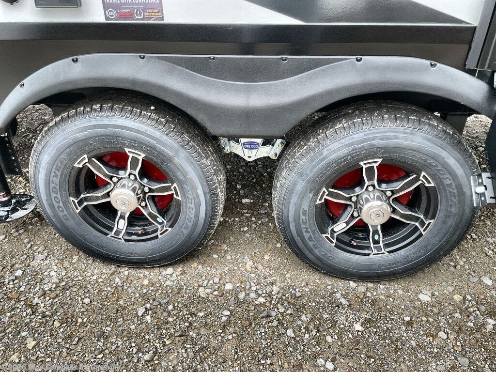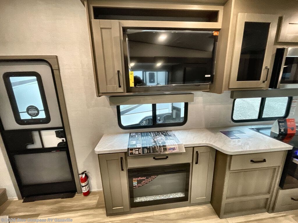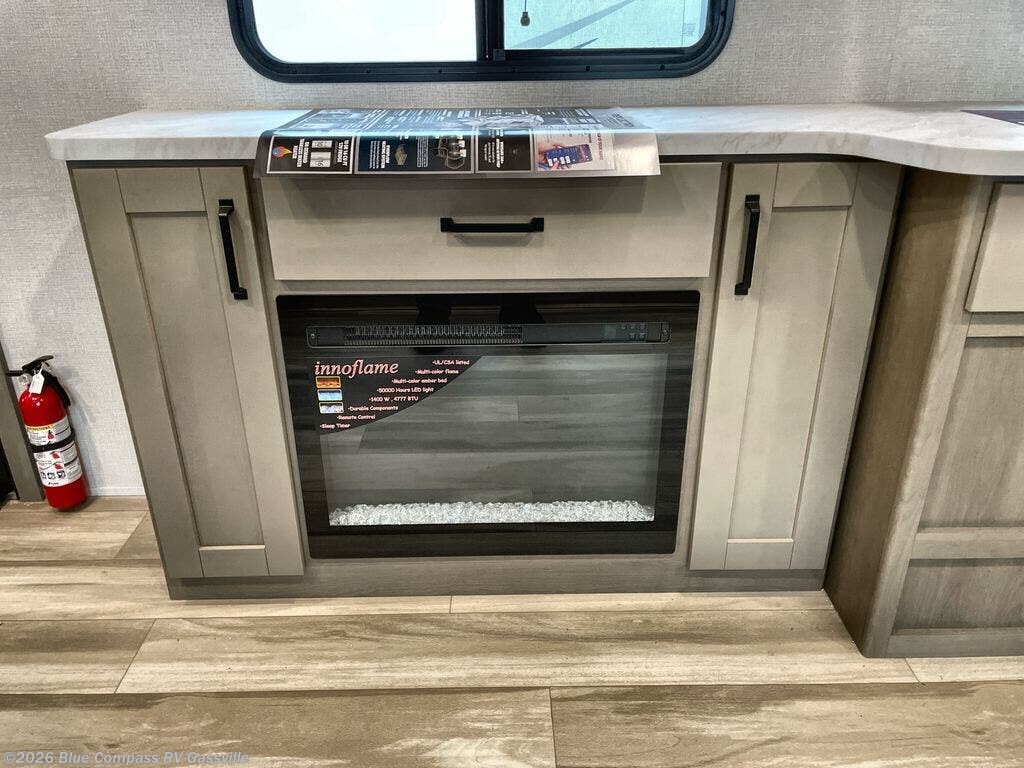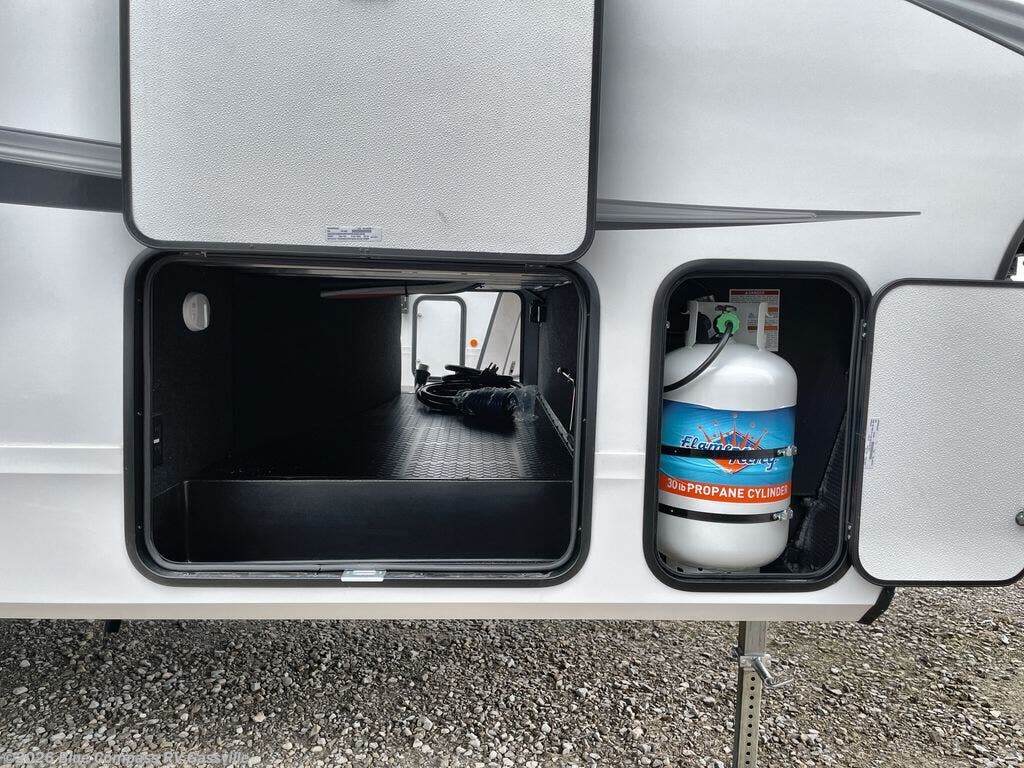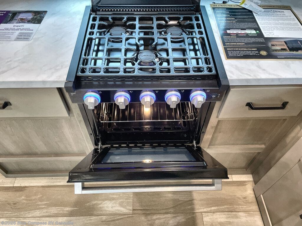 You will love this fifth wheel featuring a single slide for added interior living space and all the comforts and conveniences it provides you while you travel. The slide features a 78" theater seat plus there is a breakfast nook for more seating. Both can easily view the entertainment center with 40" TV. A rear kitchen indoors provides everything you need to create meals like home while on the road, and if you want to spend as much time outside as possible, then the outdoor griddle will certainly accommodate you for meals. Up front, a cozy private bedroom with queen bed, wardrobe, and overhead cabinets. Right next door, you will find a large walk-in shower, as well as a toilet, and a vanity with sink and linen cabinet for your towels and toiletries. You will also love the full unobstructed pass-through compartment for all of your gear, plus so much more!