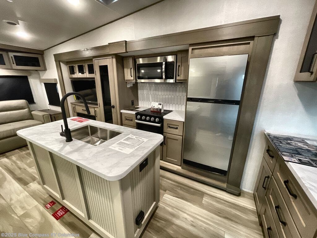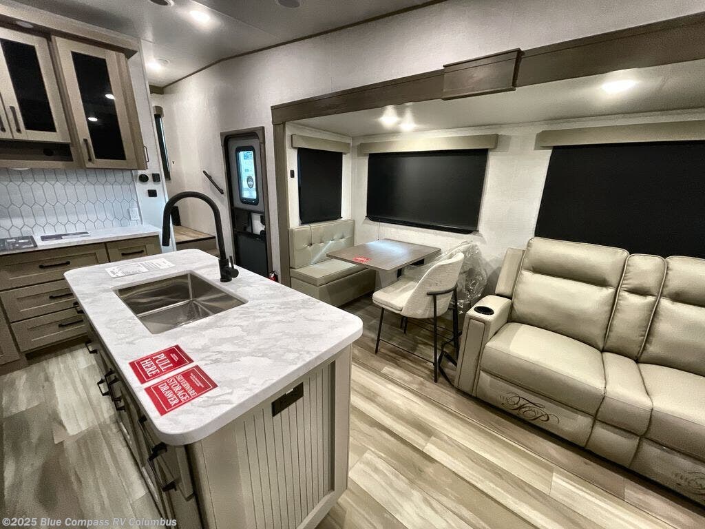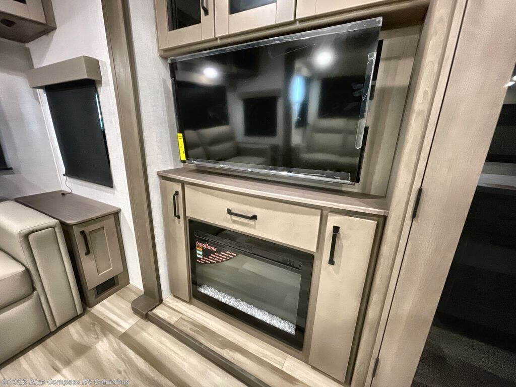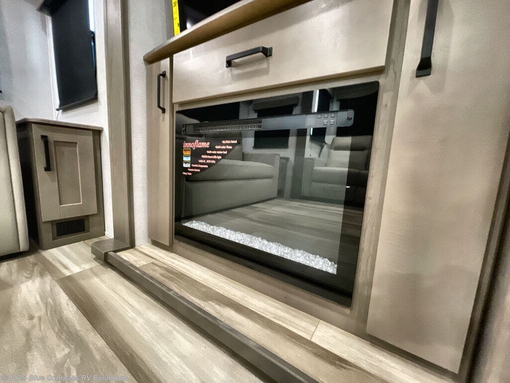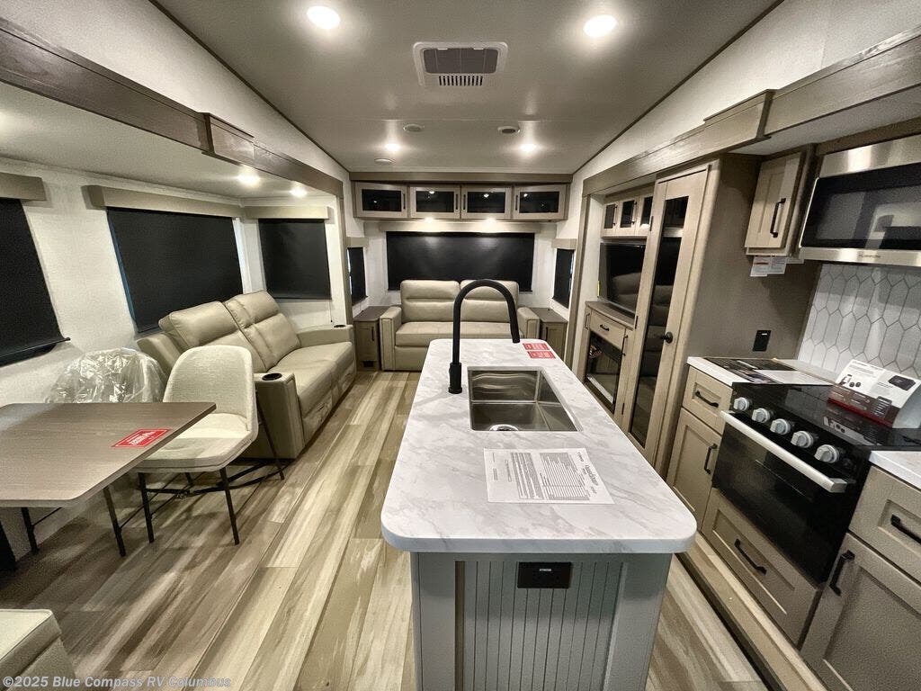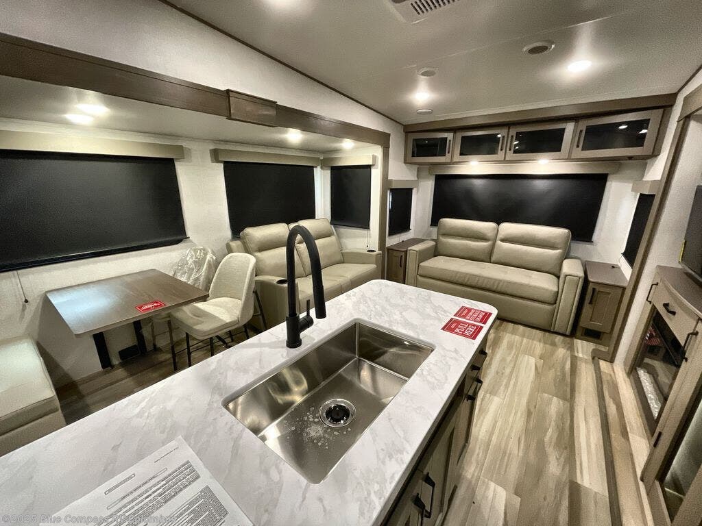 Get ready to enjoy everything the campgrounds and surrounding area has to offer when you are setup to camp in this fifth wheel! The two electric awnings offer protected areas creating outdoor living spaces; just grab your camping chairs from the unobstructed pass-through storage. And the interior offers a spacious living area and kitchen combination with dual opposing slides for maximum space. You can sit on the tri-fold sofa or the booth dinette with an option for a swivel dinette. The hutch and kitchen island offer counter space to prepare and serve meals, and there is a large pantry for goodies. The 40" LED HDTV with a fireplace below provides entertainment before bedtime or on a rainy day. And the front bedroom offers privacy, a walk-around queen bed, and plenty of storage!