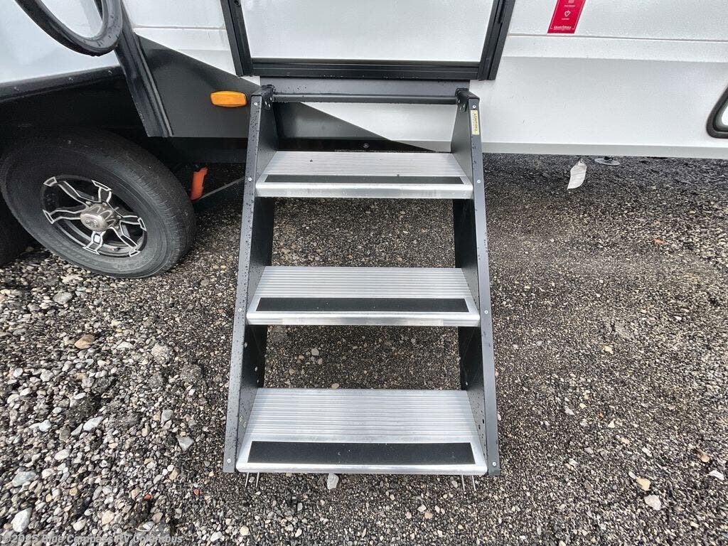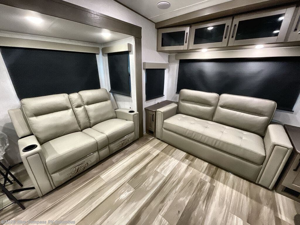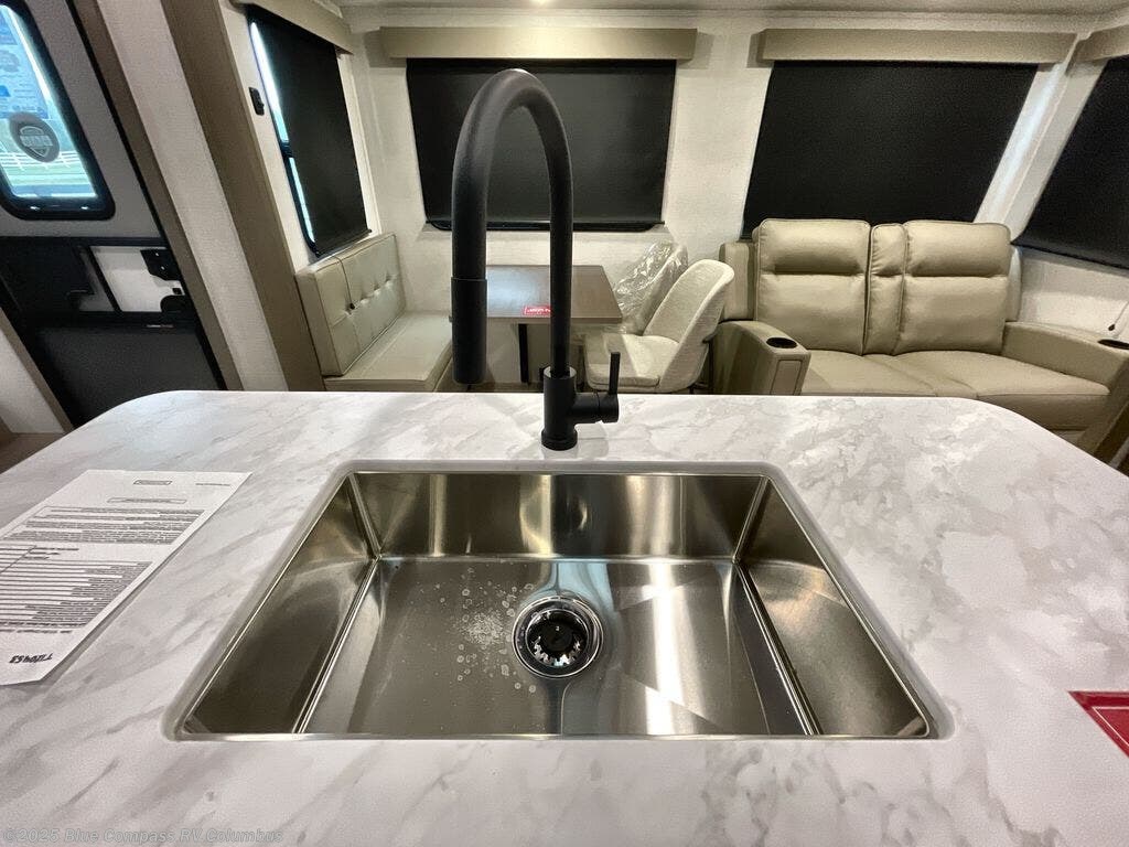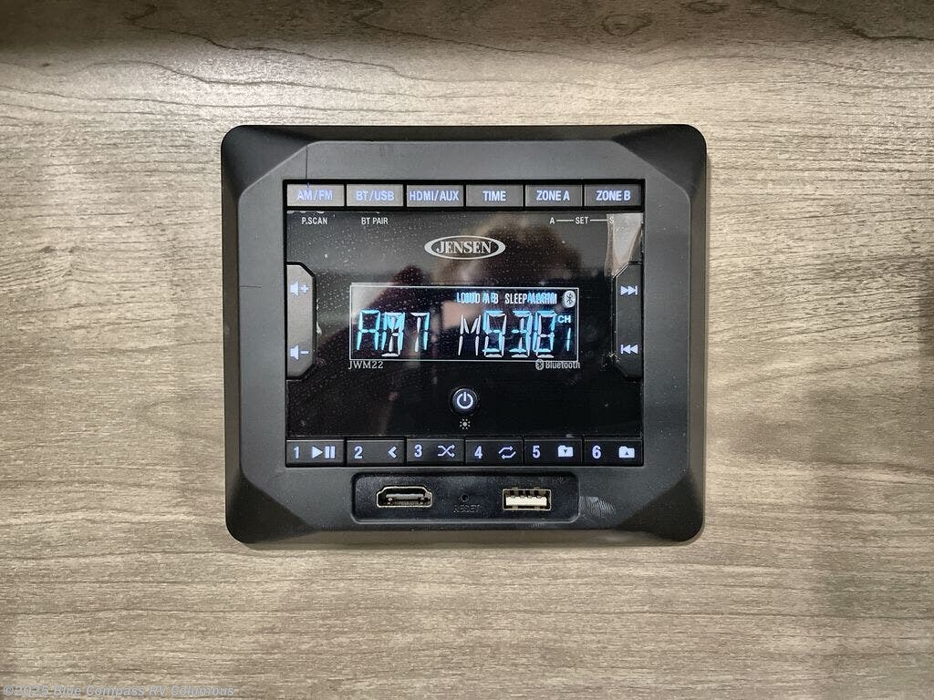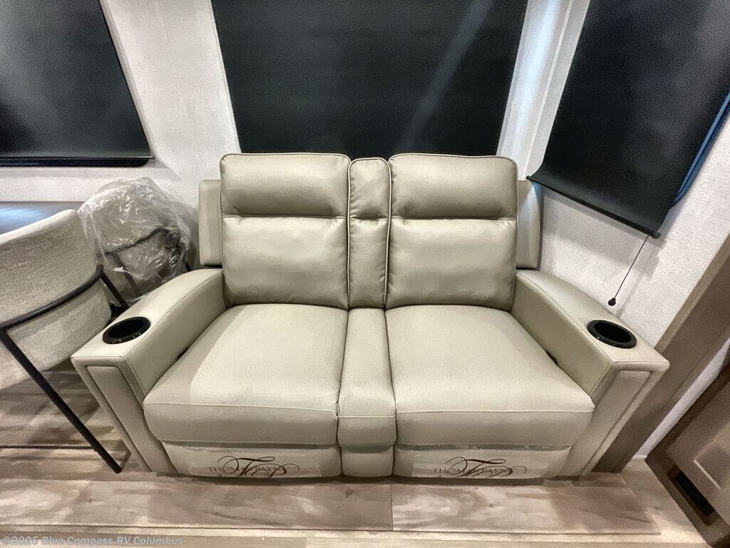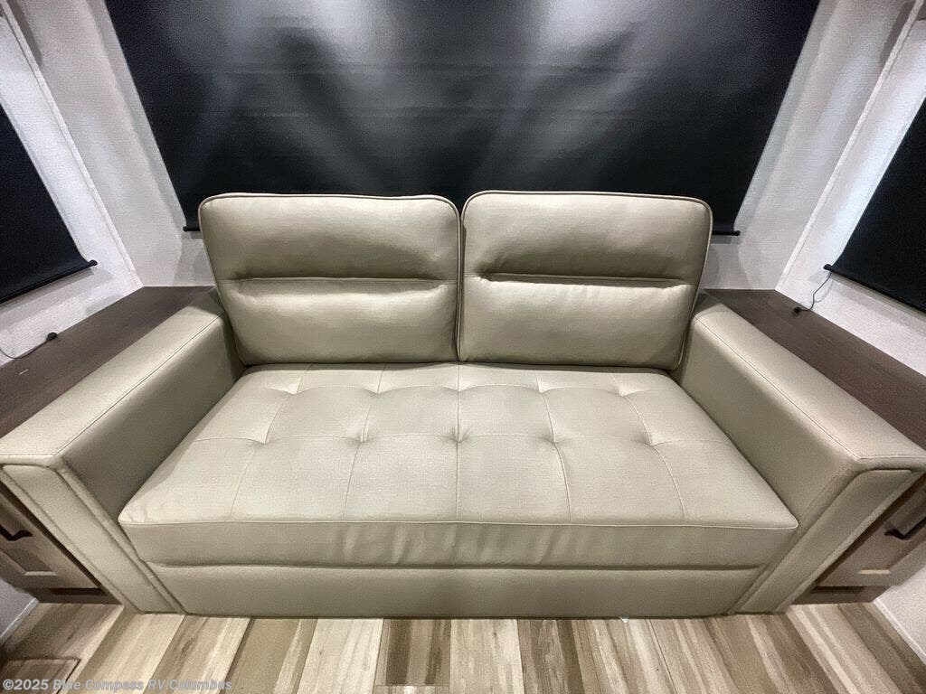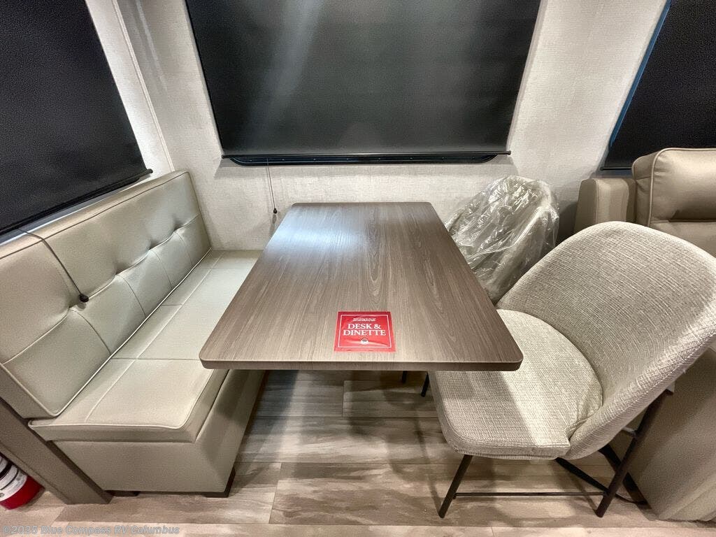 Get ready to enjoy everything the campgrounds and surrounding area has to offer when you are setup to camp in this fifth wheel! The two electric awnings offer protected areas creating outdoor living spaces; just grab your camping chairs from the unobstructed pass-through storage. And the interior offers a spacious living area and kitchen combination with dual opposing slides for maximum space. You can sit on the tri-fold sofa or the booth dinette with an option for a swivel dinette. The hutch and kitchen island offer counter space to prepare and serve meals, and there is a large pantry for goodies. The 40" LED HDTV with a fireplace below provides entertainment before bedtime or on a rainy day. And the front bedroom offers privacy, a walk-around queen bed, and plenty of storage!