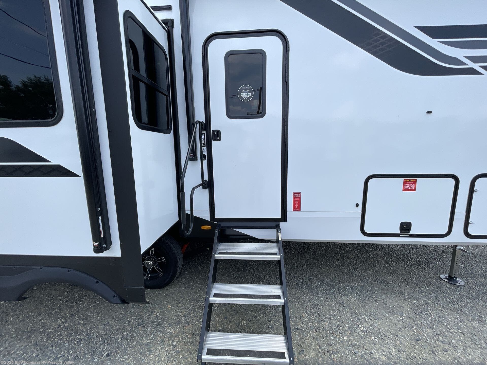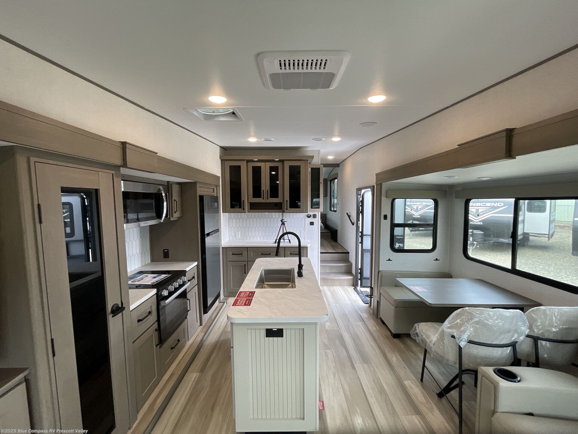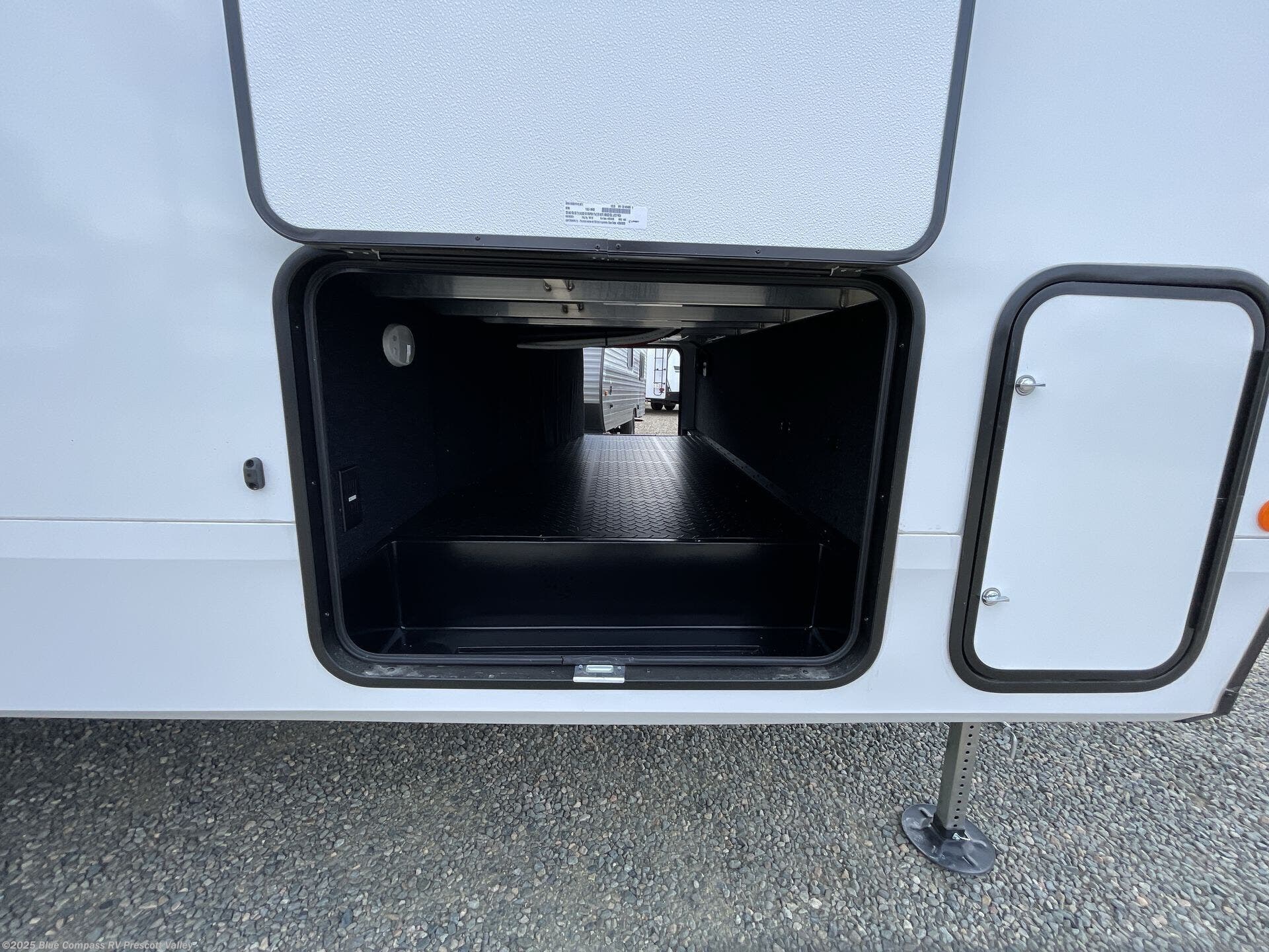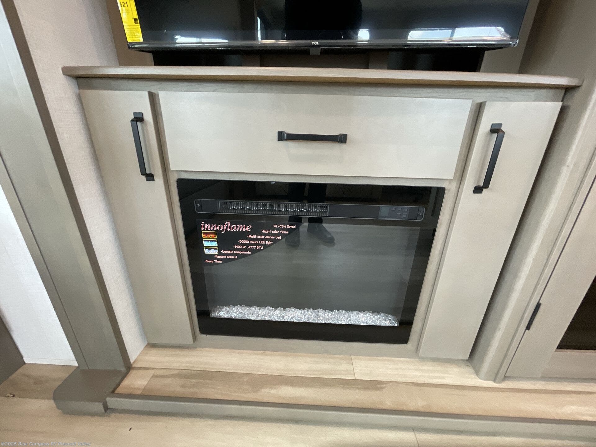 Get ready to enjoy everything the campgrounds and surrounding area has to offer when you are setup to camp in this fifth wheel! The two electric awnings offer protected areas creating outdoor living spaces; just grab your camping chairs from the unobstructed pass-through storage. And the interior offers a spacious living area and kitchen combination with dual opposing slides for maximum space. You can sit on the tri-fold sofa or the booth dinette with an option for a swivel dinette. The hutch and kitchen island offer counter space to prepare and serve meals, and there is a large pantry for goodies. The 40" LED HDTV with a fireplace below provides entertainment before bedtime or on a rainy day. And the front bedroom offers privacy, a walk-around queen bed, and plenty of storage!