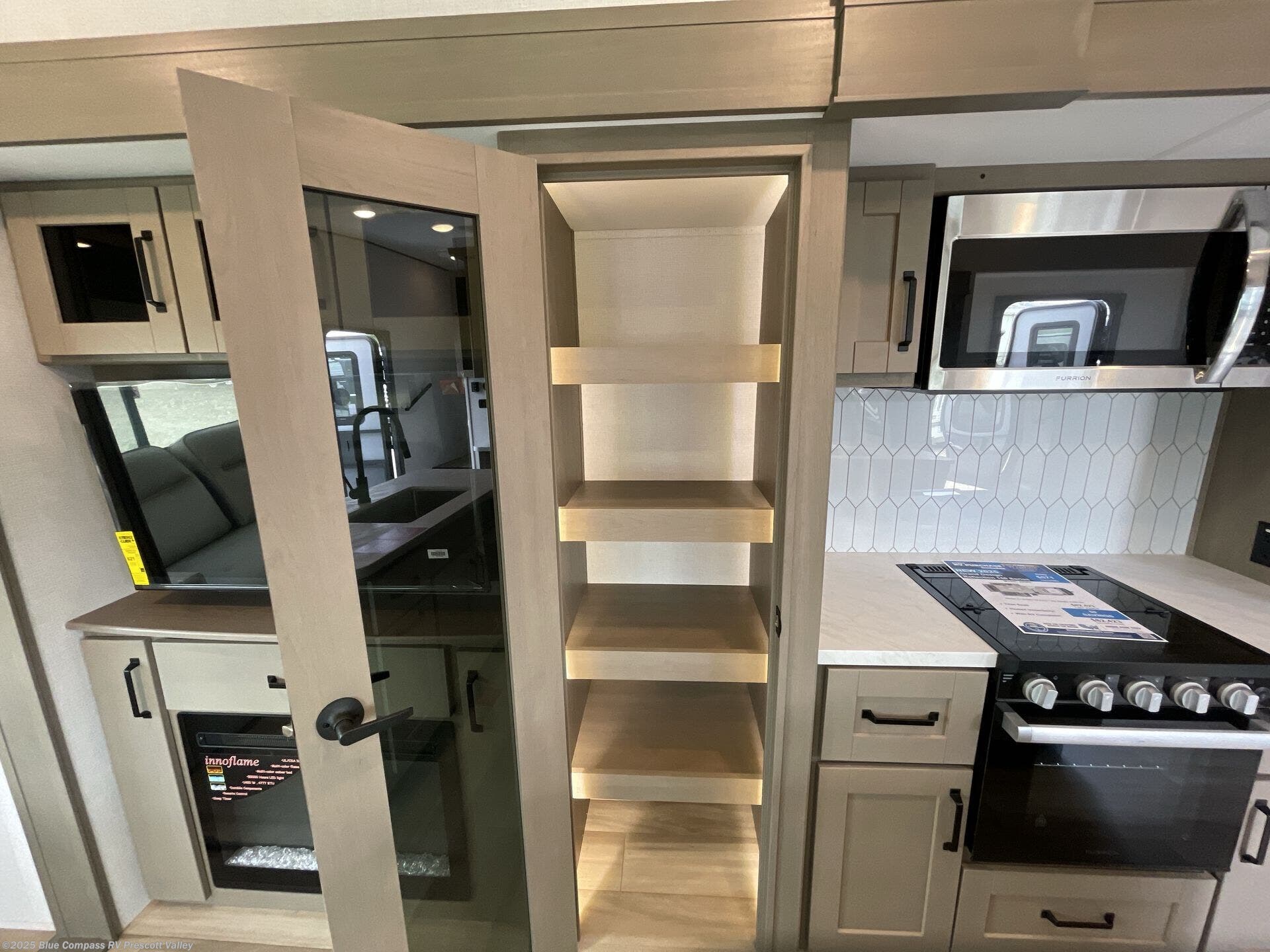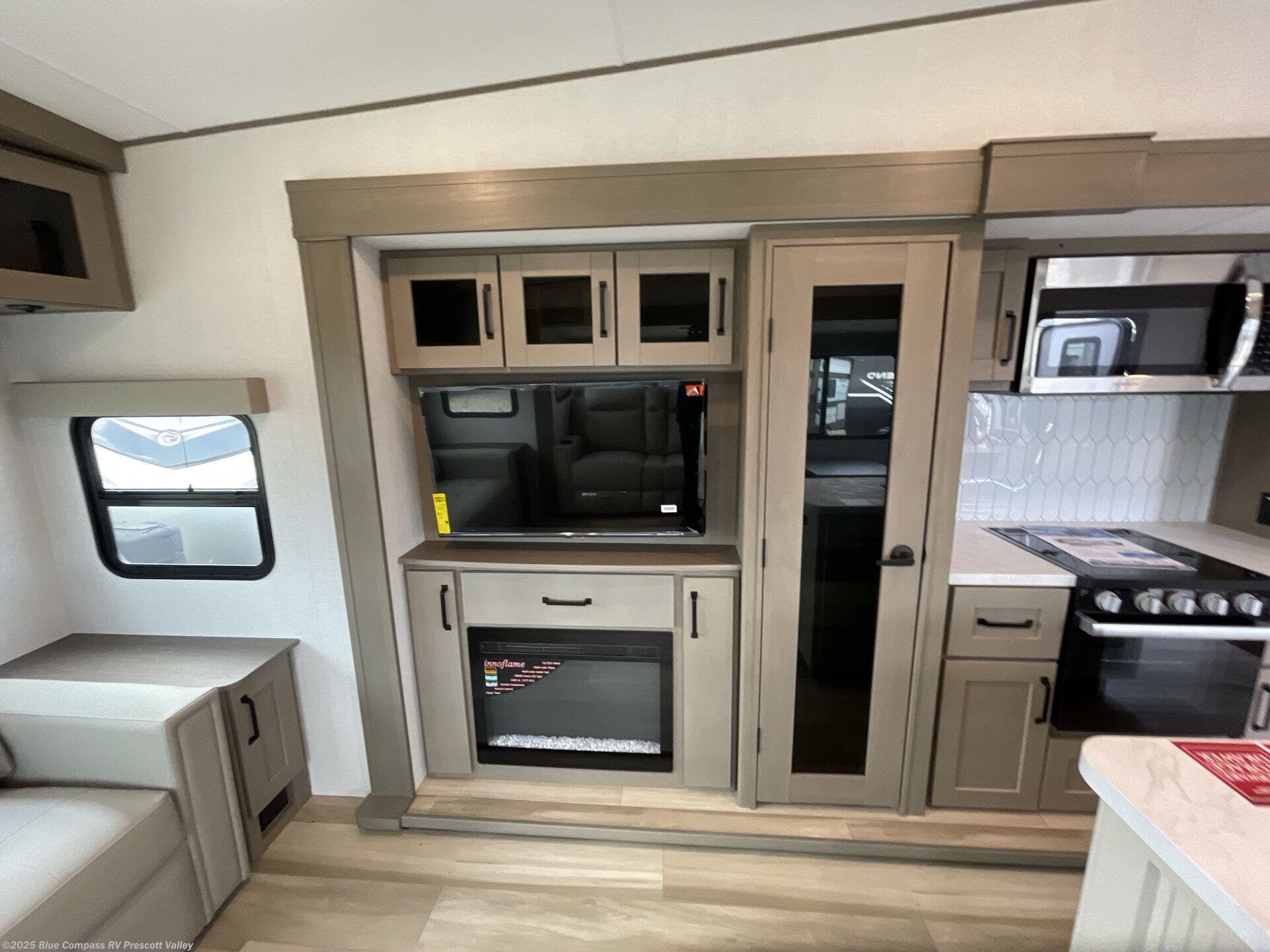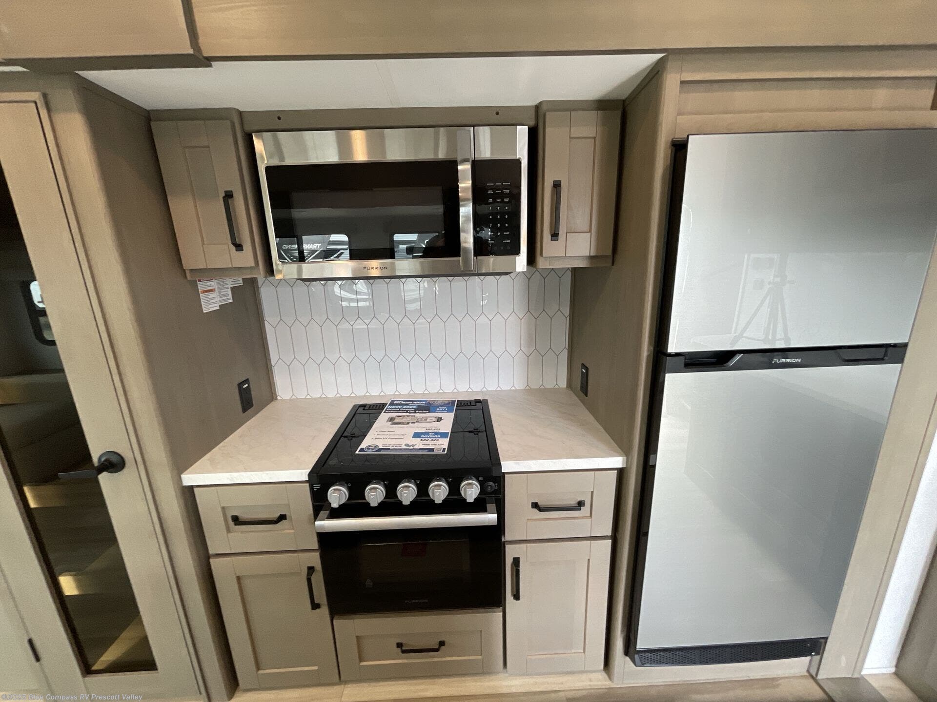 Get ready to enjoy everything the campgrounds and surrounding area has to offer when you are setup to camp in this fifth wheel! The two electric awnings offer protected areas creating outdoor living spaces; just grab your camping chairs from the unobstructed pass-through storage. And the interior offers a spacious living area and kitchen combination with dual opposing slides for maximum space. You can sit on the tri-fold sofa or the booth dinette with an option for a swivel dinette. The hutch and kitchen island offer counter space to prepare and serve meals, and there is a large pantry for goodies. The 40" LED HDTV with a fireplace below provides entertainment before bedtime or on a rainy day. And the front bedroom offers privacy, a walk-around queen bed, and plenty of storage!