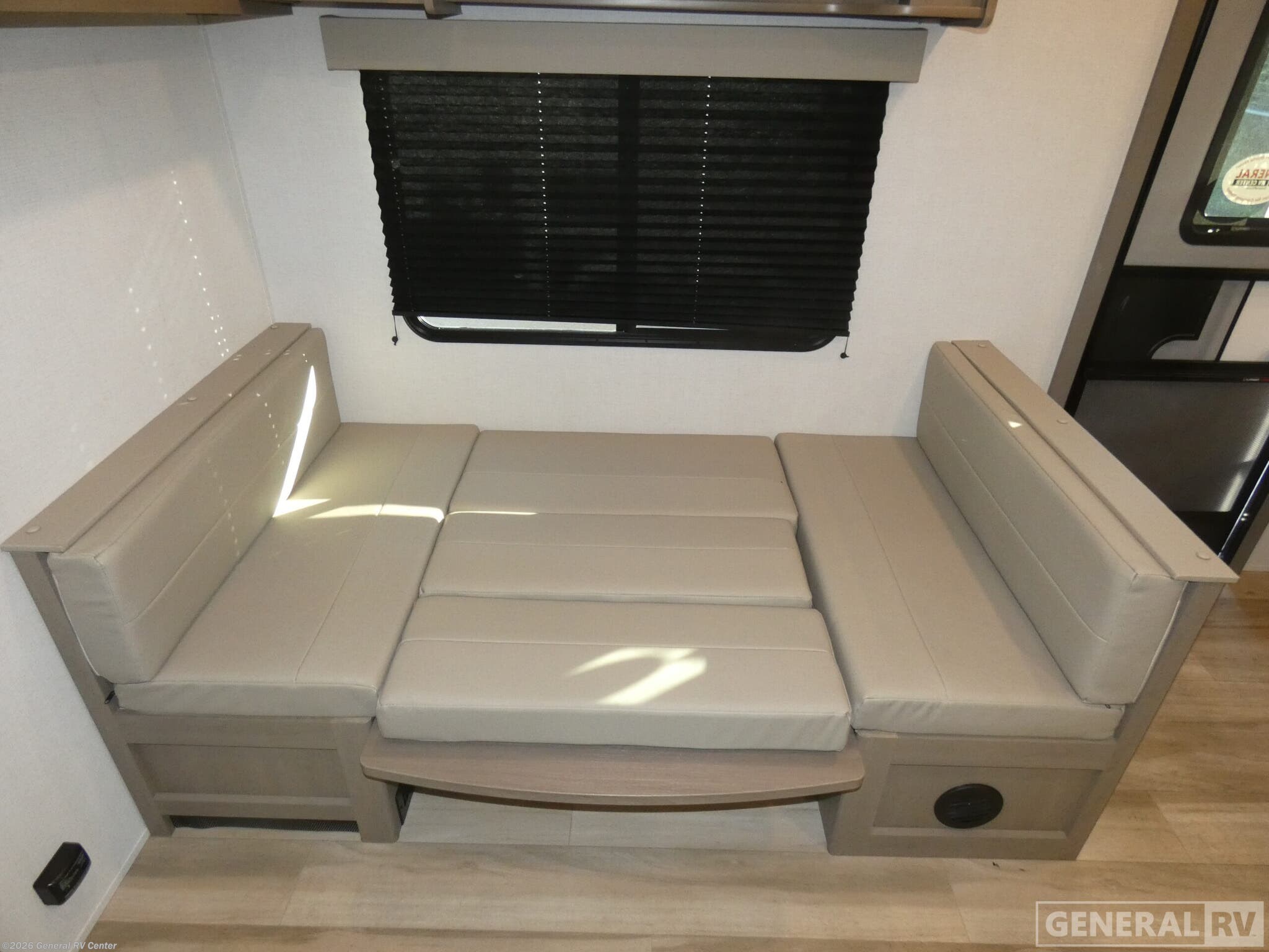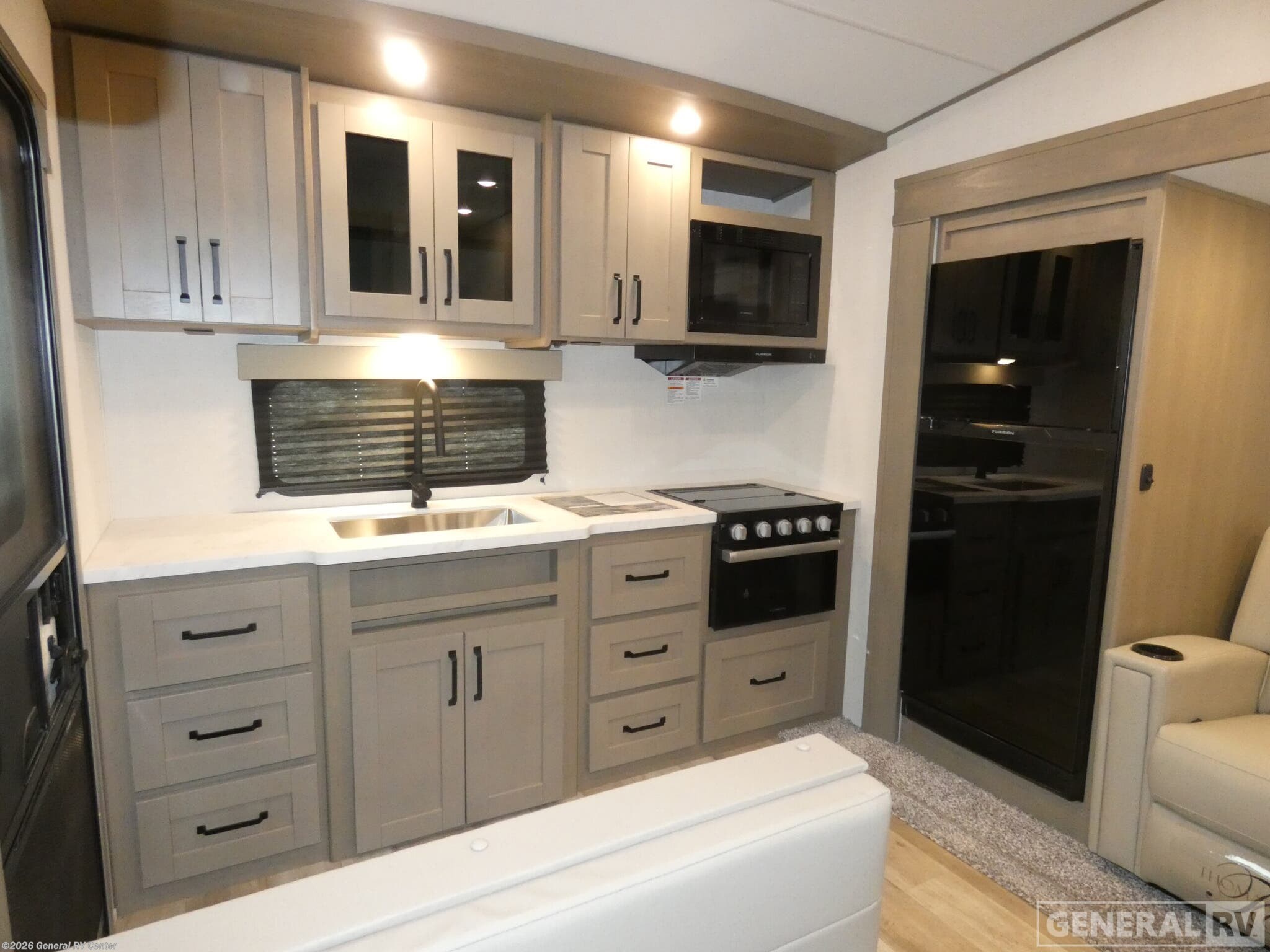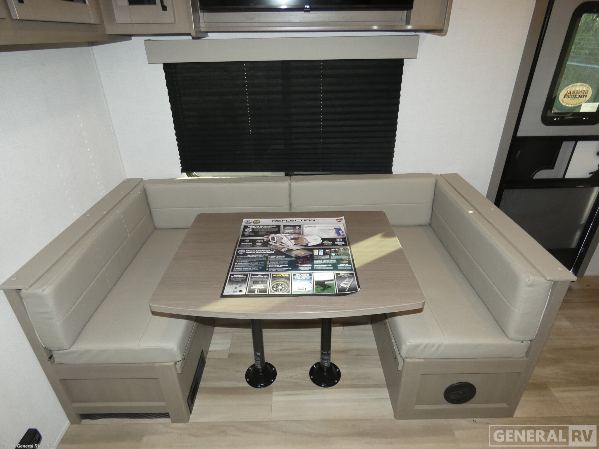 This rear kitchen fifth wheel is sure to meet all of your camping needs! Since the exterior length is only 26' 11", you can easily maneuver in and out of campgrounds. The rear kitchen includes ample counter space to prep meals, a three burner cooktop, and overhead storage for all your necessities. There is a 10 cu. ft. 12V refrigerator within the slide out that also includes the theater seating, and the U-shaped dinette provides a place to dine or play a card game. You will appreciate having convenient storage by the entry door, along with pull-out pet bowls, a functional wardrobe closet in the bedroom and an exterior pass-thru for belongings and camping gear. When you're ready to turn in for the night, the queen bed is sure to bring a great night's rest, while your guests sleep on the booth dinette! Each Reflection 100 Series fifth wheel by Grand Design is affordable and packed with luxury for unforgettable camping memories! The MorRyde CRE3000 suspension system and Goodyear Endurance tires will provide smooth towing from home to campground. And the solar package with a 180W solar panel, 60 Amp charge controller and 12V refrigerator will allow you to camp for longer periods of time and in more locations! A heated and enclosed underbelly with circulating heat is included in the Arctic 4-Seasons Protection Package, along with a double insulated roof and front cap, and thermofoil insulation under the holding tanks so you can camp all year long if you choose. You will appreciate having an on-demand water heater for hot showers after exploring, and the universal all-in-one docking station will let you monitor your RVs tanks levels and functions with ease. These models also include many luxurious interior features, such as premium Congoleum flooring, pleated shades, residential cabinetry, and matte black fixtures and hardware. Don't let the Reflection 100 Series fifth wheels pass you by!