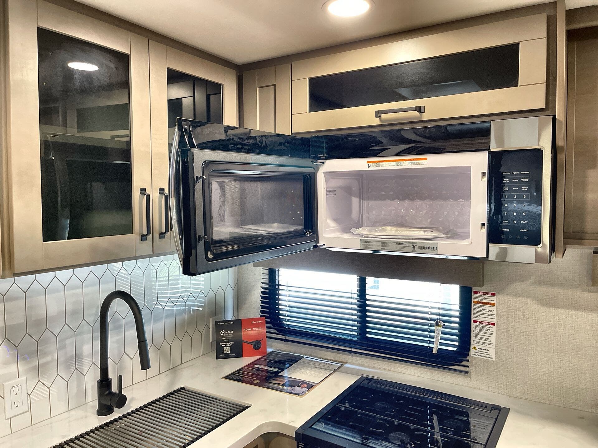 - Full kitchen setup including microwave, oven, refrigerator, and stove top burner