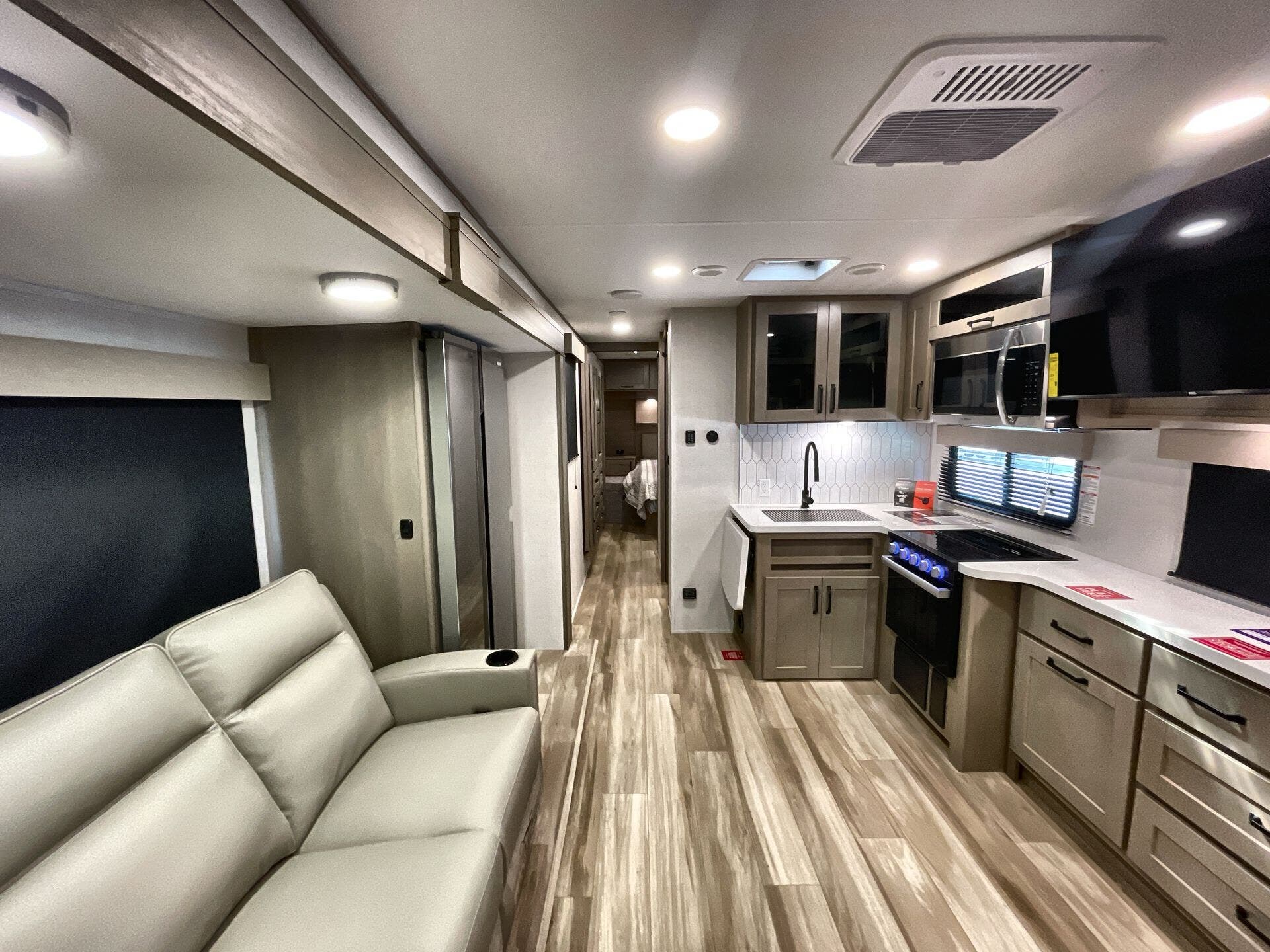 The 2025 Reflection travel trailer boasts a length of approximately 34 feet, with a width suitable for easy towing. It can comfortably sleep up to four people, making it perfect for small families or couples. The trailer features a fresh water capacity of 54 gallons, along with black and grey water tanks measuring 43 and 86 gallons respectively, ensuring ample water storage for extended trips. The gross vehicle weight is 10,000 pounds, with a payload capacity of 1,900 pounds and a hitch weight of 1,000 pounds, making it compatible with many half-ton trucks.