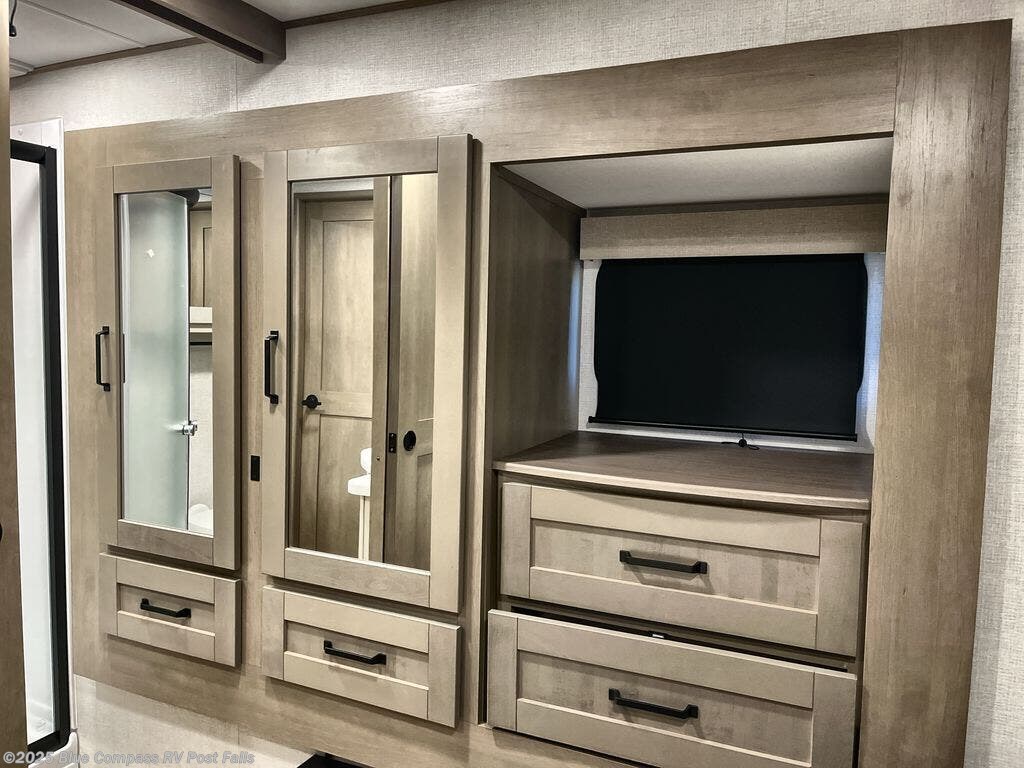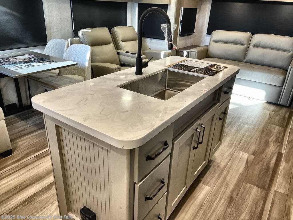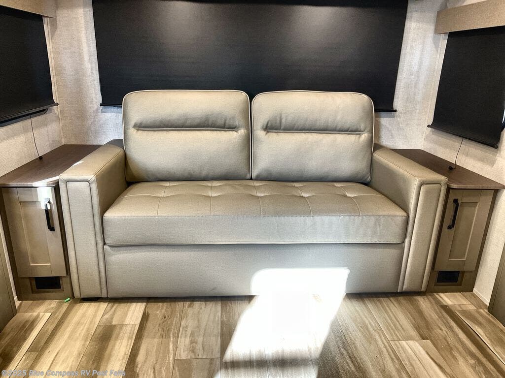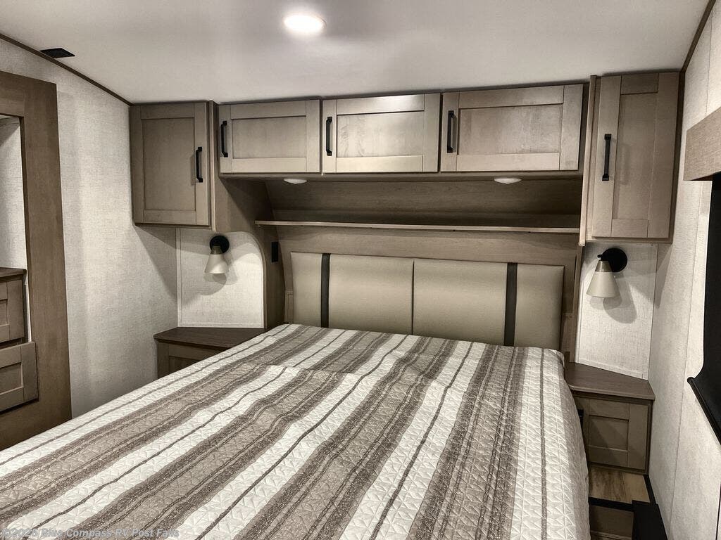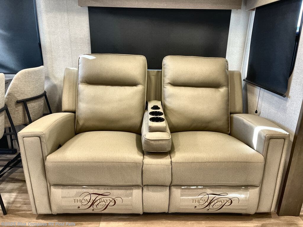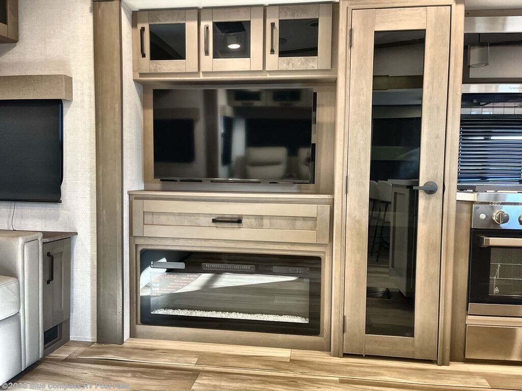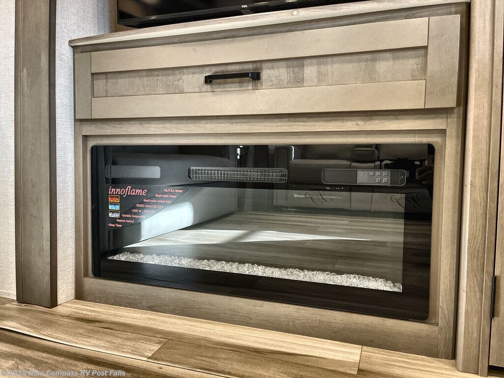 Whether you travel for pleasure or work, you will love the spacious main living and kitchen area with a rear tri-fold sofa that doubles as extra sleeping space, and the theater seating directly across from the entertainment center with a 40" LED HDTV and a fireplace below. The kitchen island will make meal prepping and drying the dishes easier and the hutch is the perfect place to place your picture frames, nice dishes, and extra cooking items. There is even a pantry that is big enough to store all of your favorite snacks, dry ingredients and such. Outside you can enjoy two electric awnings that provide protection from the elements as you relax and visit with other RVers, and your camping chairs can easily be stored in the pass-through compartment. The double entry bathroom is convenient especially at night when you can slide the door to enter from the front master bedroom. You will find plenty of storage for your clothing and gear, plus the bedroom slide out gives you drawers and linen storage that stretches into the full bathroom.