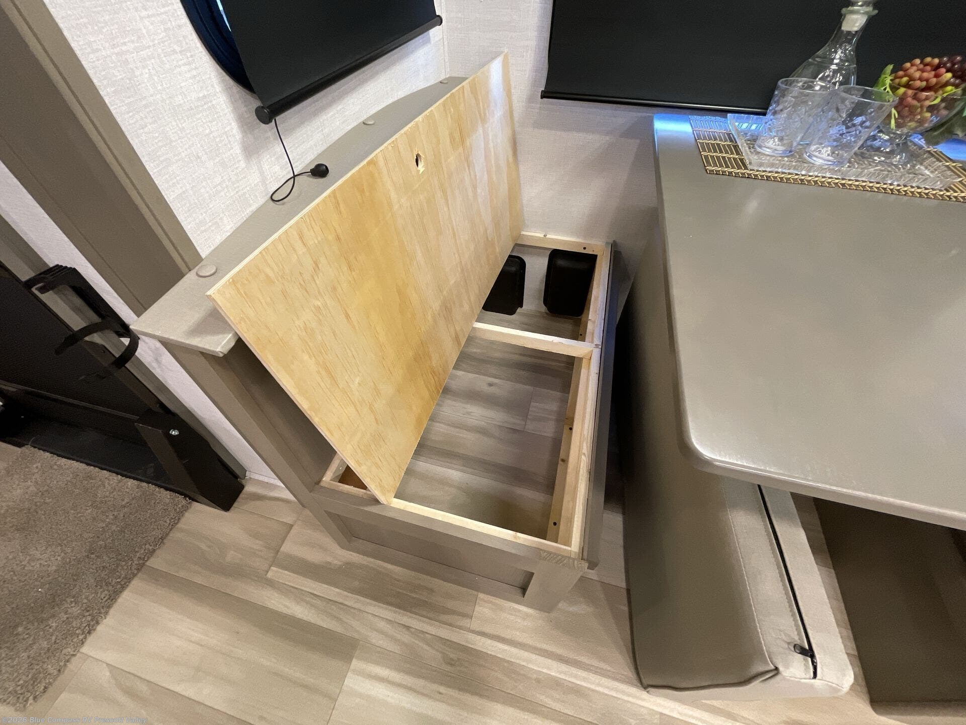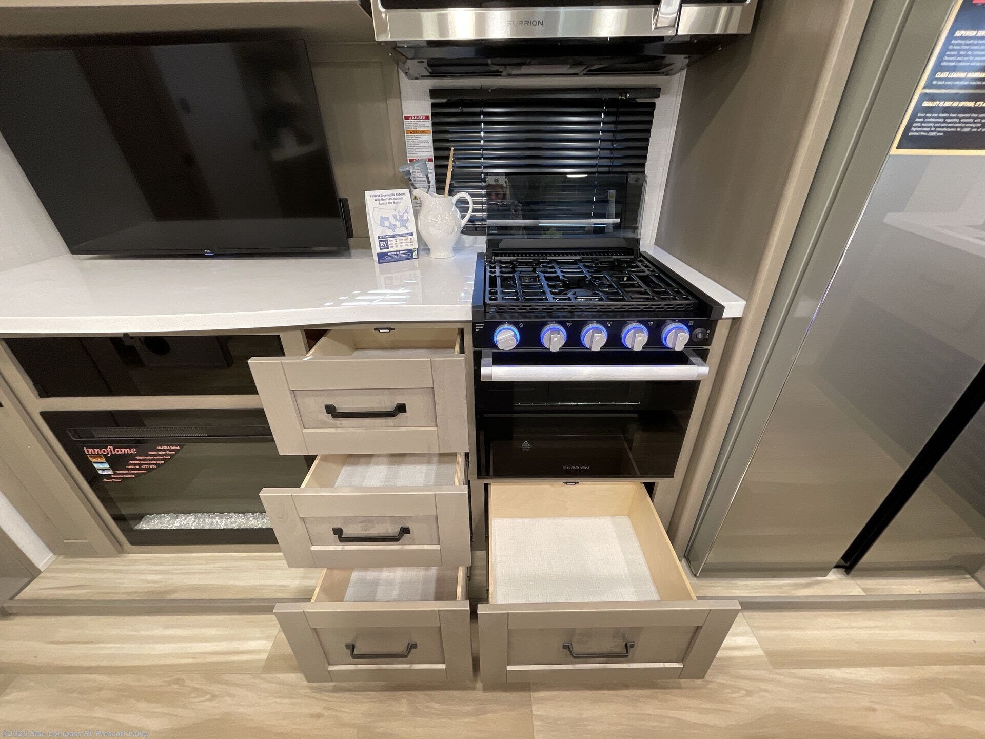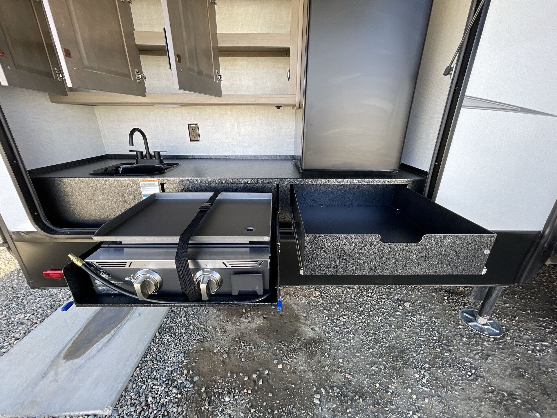 Finding the perfect trailer for a larger group is simple, take a look at this one for your next RV! The rear bunkhouse might be the first reason you fall in love because of the slide out with a flip bunk above a tri-fold sofa, the second bunk bed with a window on the opposite side and storage below, and the large rear window for great views. The outside kitchen might be another reason allowing you to enjoy the outdoors while providing meals for everyone, and/or the inside gourmet kitchen with a 16 cu. ft. refrigerator, an island, and two hutches. Everyone can gather together and relax on the theater seating with cupholders and the booth dinette or optional swivel dinette, or watch the 40" LED HDTV with fireplace below. The full bathroom includes a space savings sliding door and linen storage, and the bedroom gives you a front walk-around queen bed with storage for your clothes on each side, plus there is an additional wardrobe with drawers for your clothes!