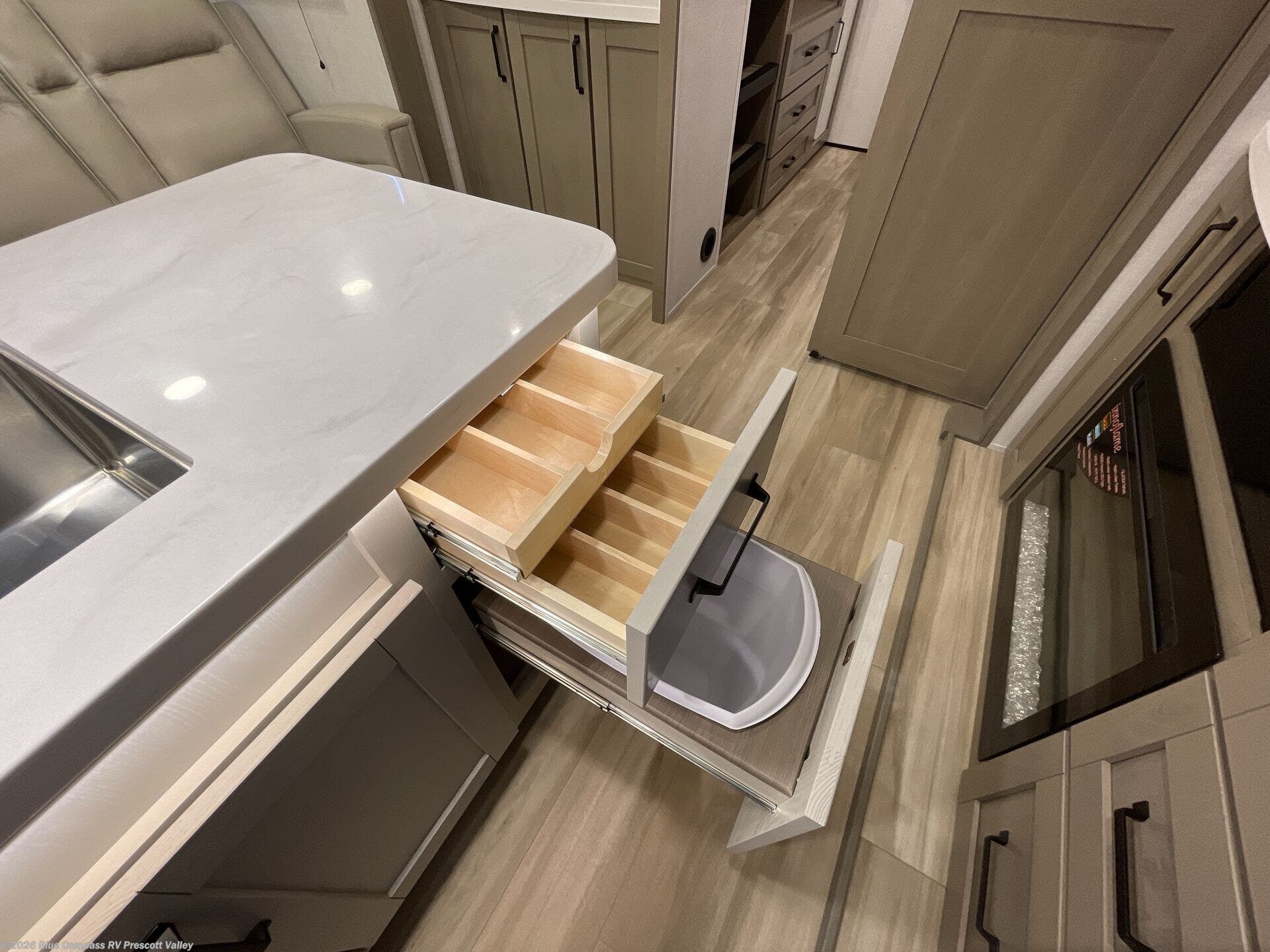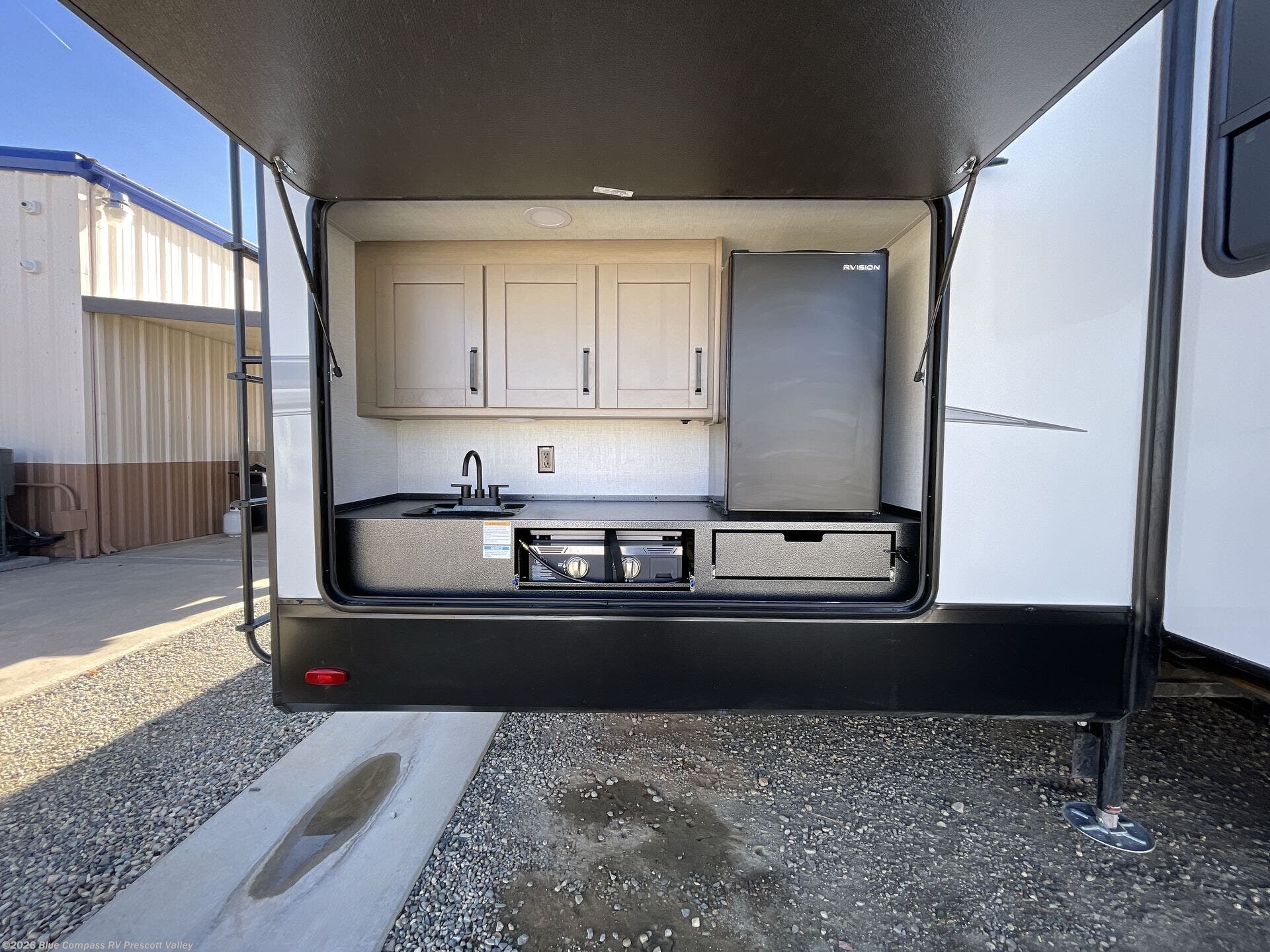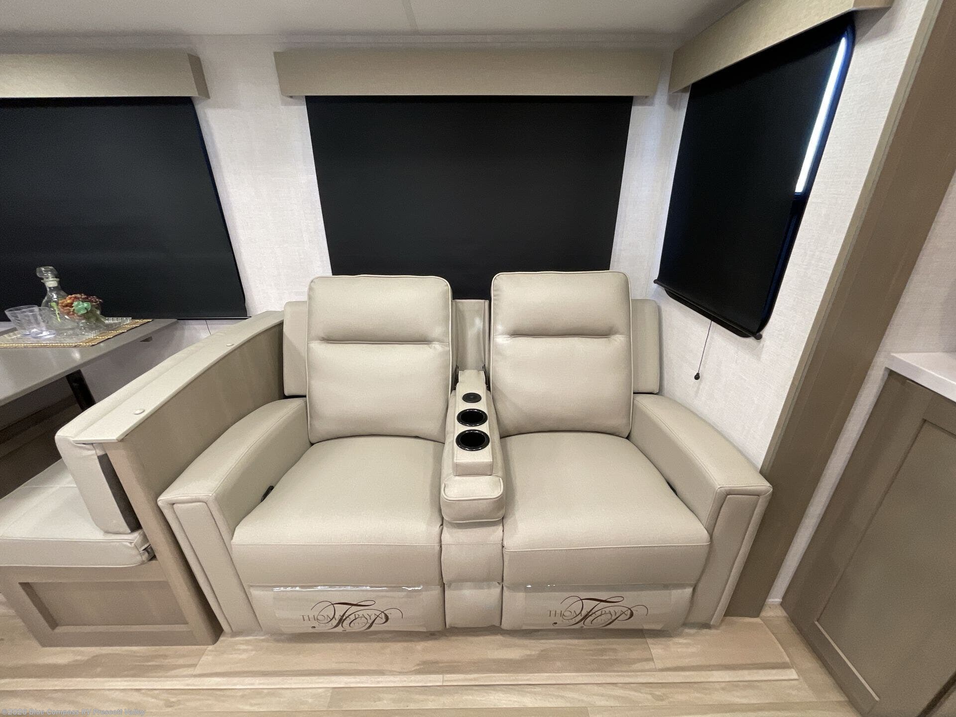 Finding the perfect trailer for a larger group is simple, take a look at this one for your next RV! The rear bunkhouse might be the first reason you fall in love because of the slide out with a flip bunk above a tri-fold sofa, the second bunk bed with a window on the opposite side and storage below, and the large rear window for great views. The outside kitchen might be another reason allowing you to enjoy the outdoors while providing meals for everyone, and/or the inside gourmet kitchen with a 16 cu. ft. refrigerator, an island, and two hutches. Everyone can gather together and relax on the theater seating with cupholders and the booth dinette or optional swivel dinette, or watch the 40" LED HDTV with fireplace below. The full bathroom includes a space savings sliding door and linen storage, and the bedroom gives you a front walk-around queen bed with storage for your clothes on each side, plus there is an additional wardrobe with drawers for your clothes!