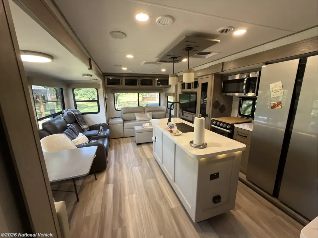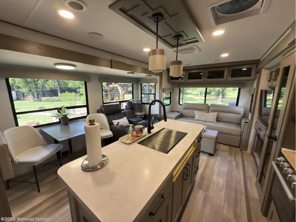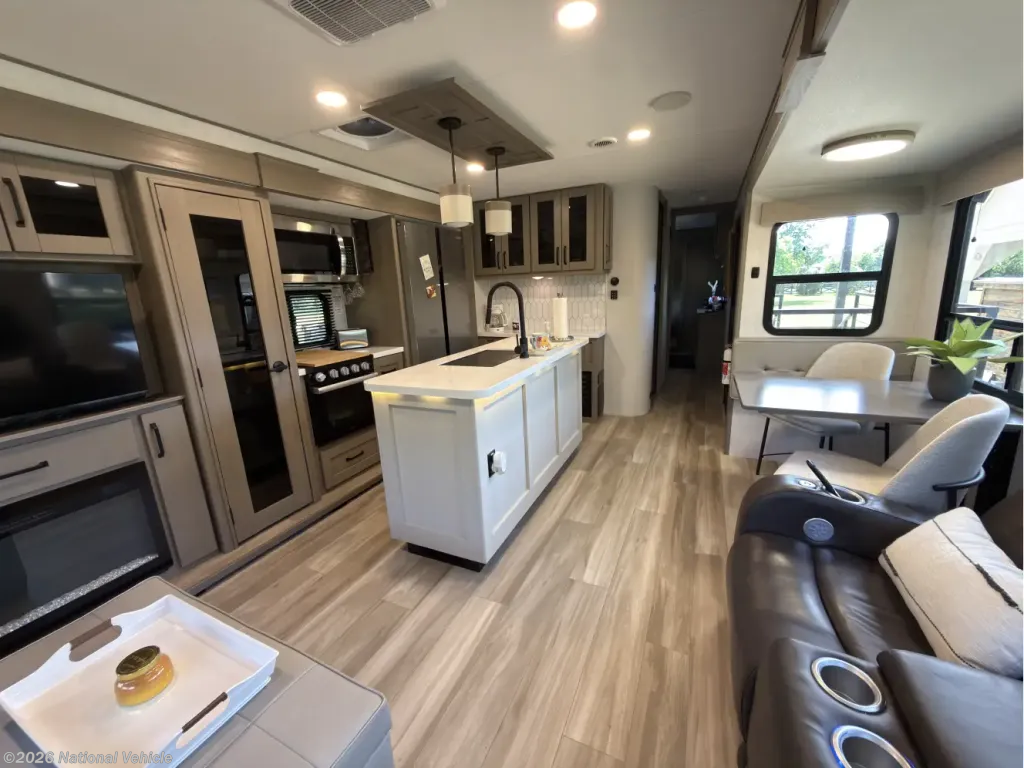 The kitchen is both stylish and practical, centered around a functional island that adds prep space and storage. Highlights include solid-surface countertops, a deep stainless sink, a 16 cu ft 12V refrigerator, 3-burner range with oven, plus a built-in hutch and generous pantry.