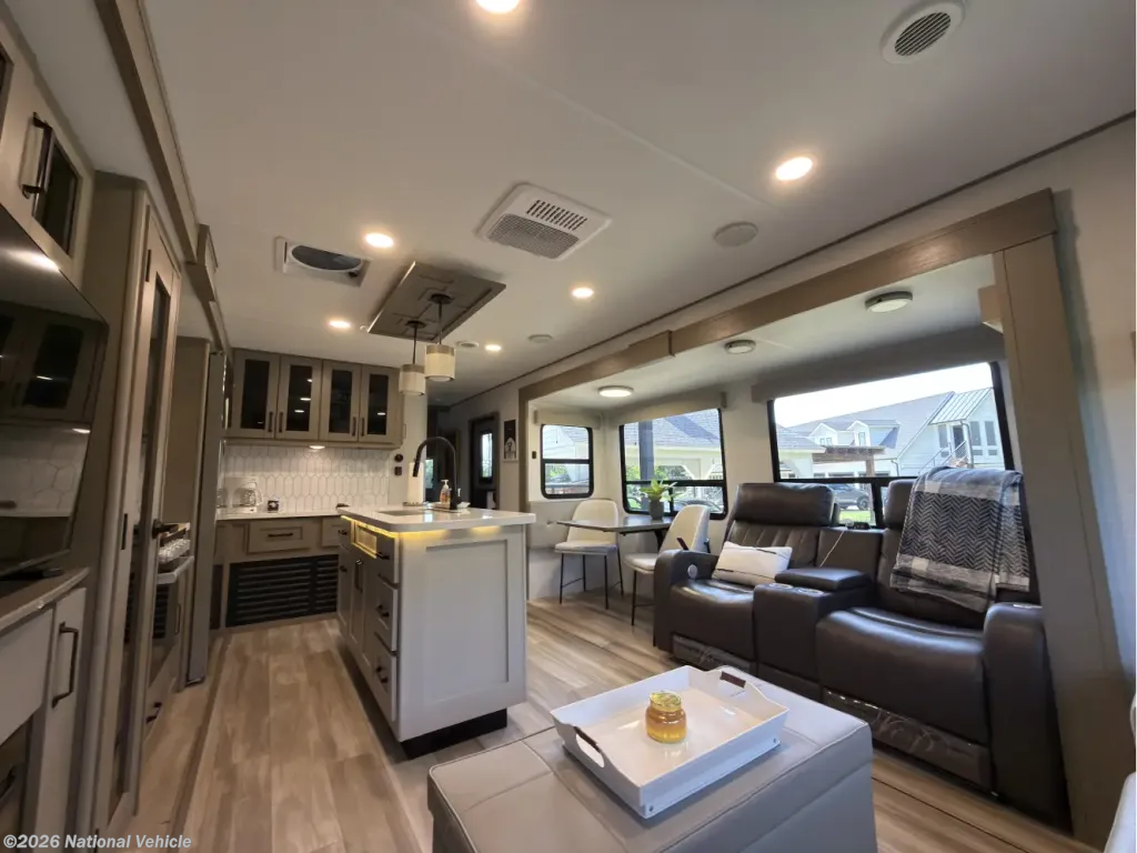 Inside, the expansive living area features opposing slide-outs, premium theater seating, and a rear tri-fold sleeper sofa-perfect for relaxing or hosting guests. Panoramic windows fill the space with natural light, while the fireplace and LED TV create a true ?at-home? atmosphere wherever you travel.