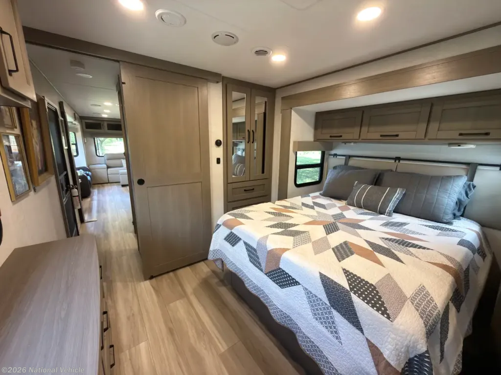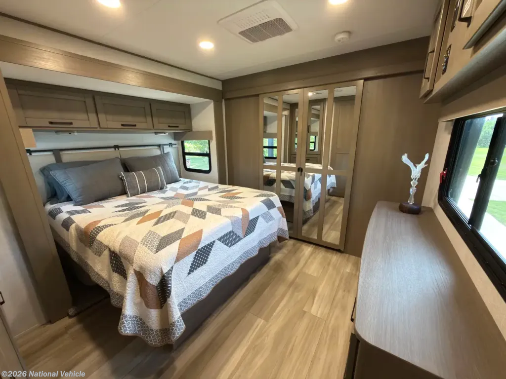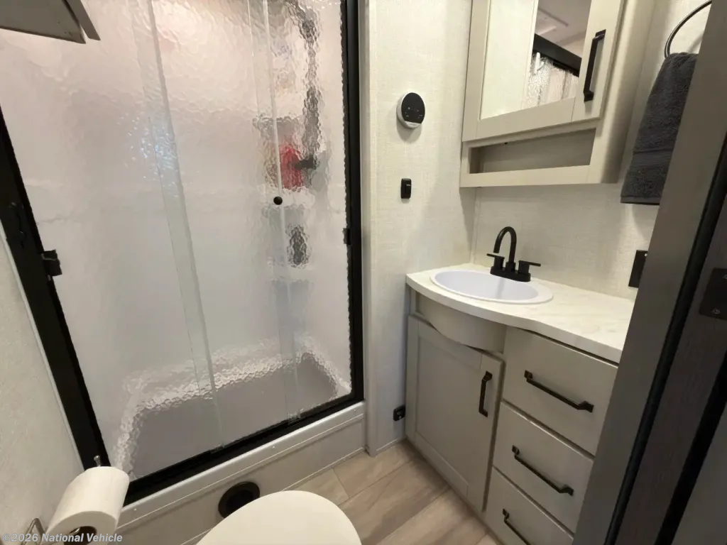 Up front, the private master suite offers a rare level of comfort with a standard king bed, ample wardrobe storage, and washer/dryer prep-ideal for long-term stays. The bathroom features a spacious 30" x 36" residential-style shower, skylight, and linen storage.