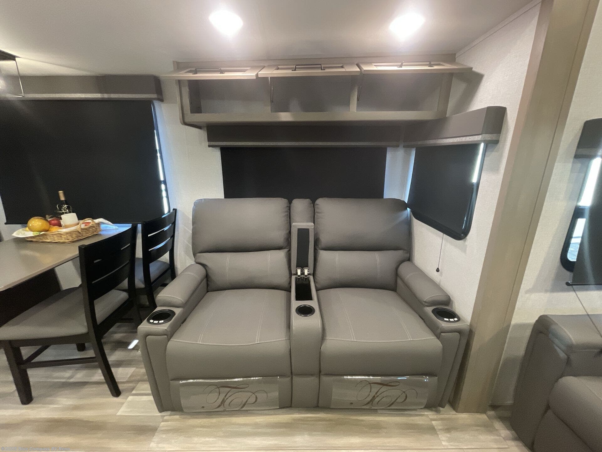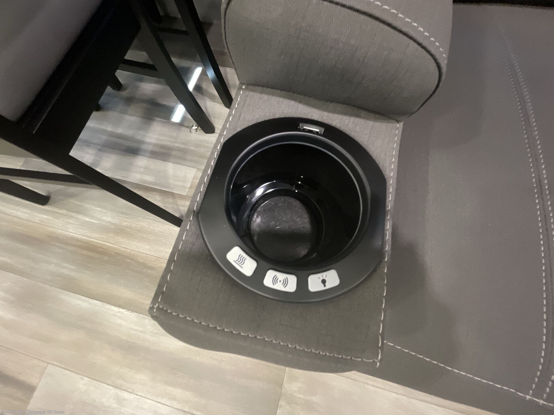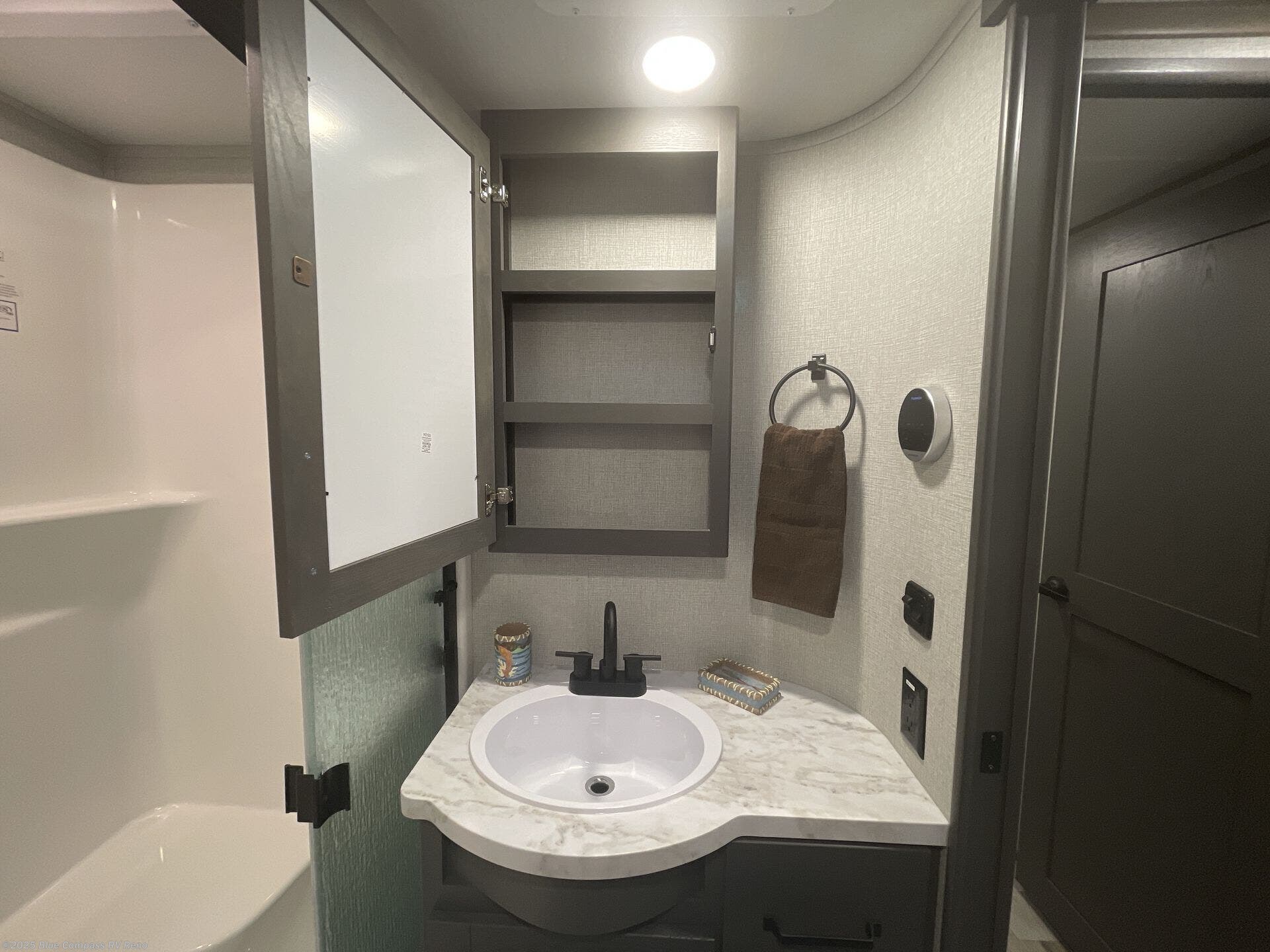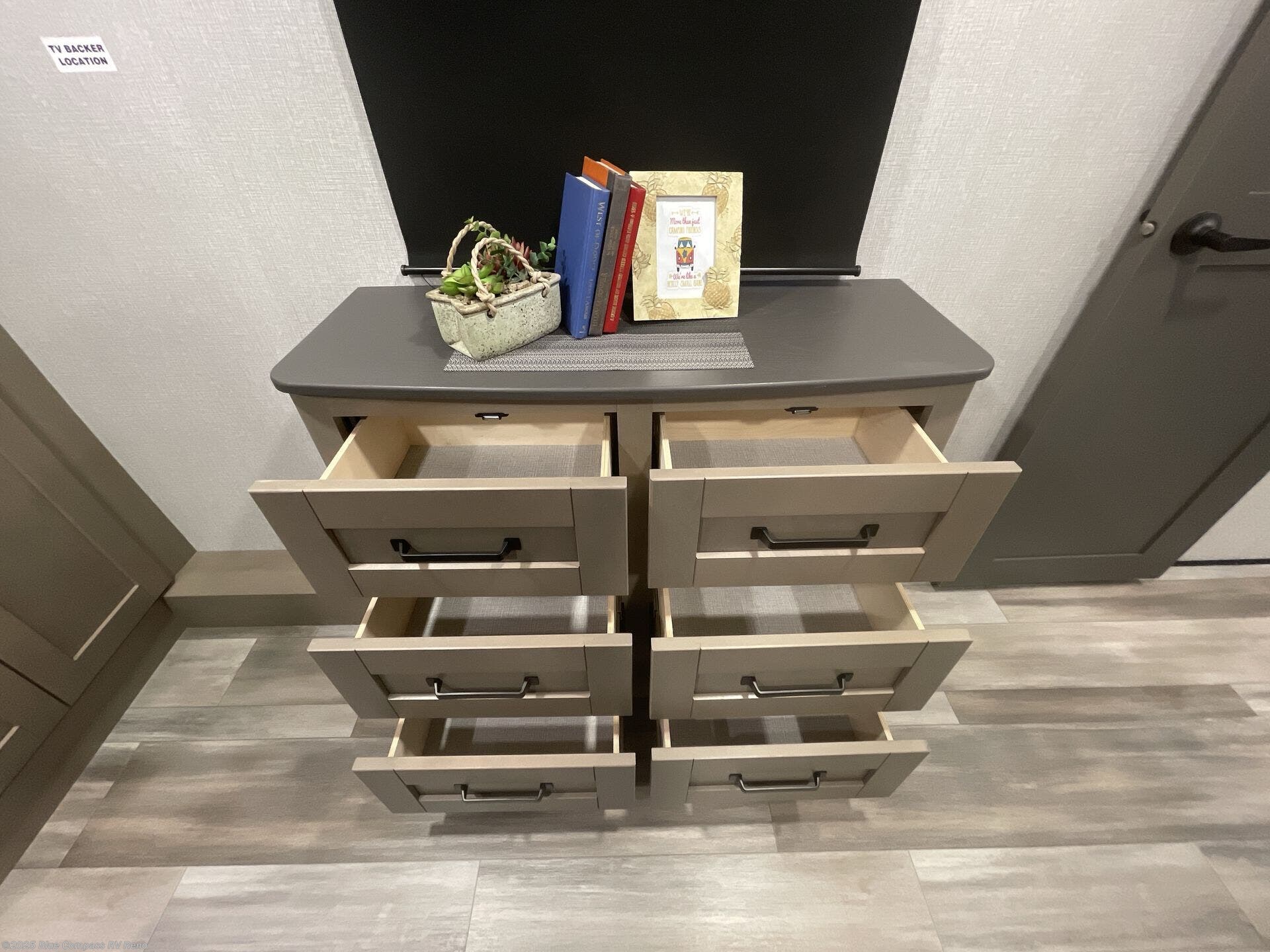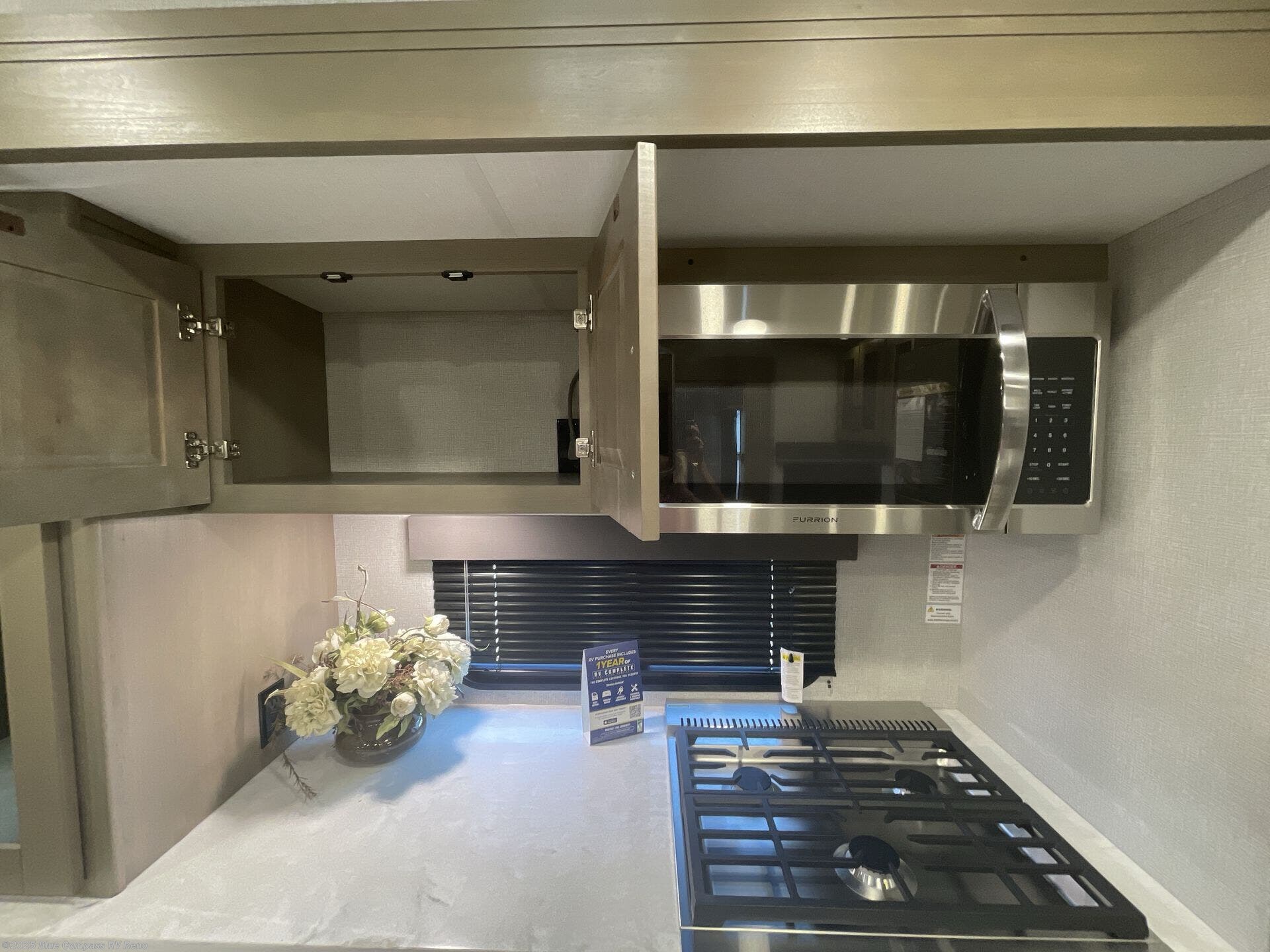 Comfortable accommodations are found throughout this fifth wheel so you can relax, unwind and enjoy your vacation be it for a weekend or a month and even when you have to work! Thanks to the rear desk with a chair and the bedroom with washer and dryer prep, you could stay in this RV as long as you like and keep all your clothes and linens clean. The front bedroom also provides a front wall wardrobe, a slide out queen bed and a dresser. The spacious shower has a glass door and there is linen storage in the full bathroom. The spacious main living and kitchen area has two slide outs with full kitchen amenities and seating with theater seats including cupholders, a booth dinette, and a tri-fold sofa. And the exterior offers an outside kitchen with a griddle, a 1.6 cu ft. refrigerator, and two power awnings!