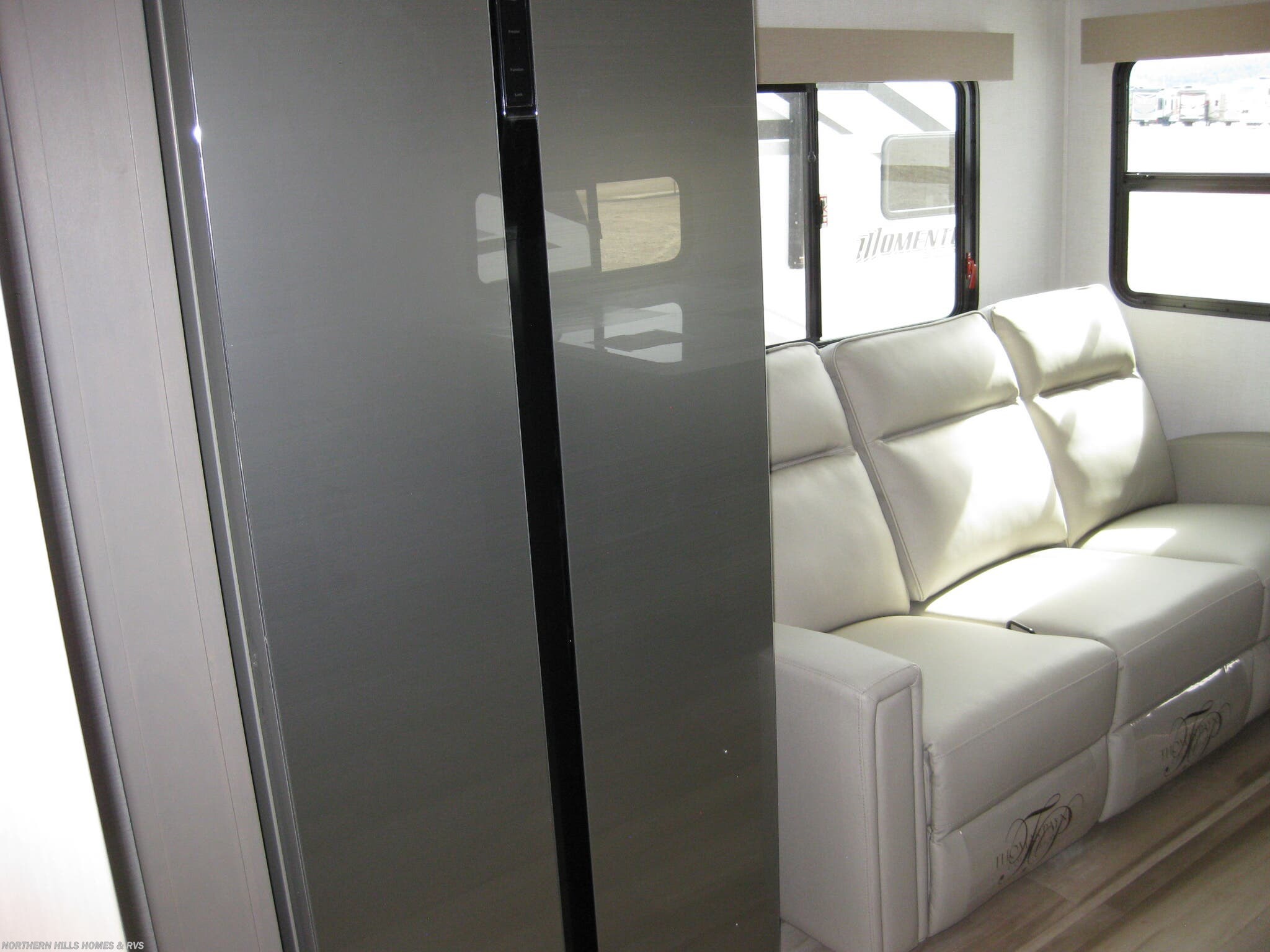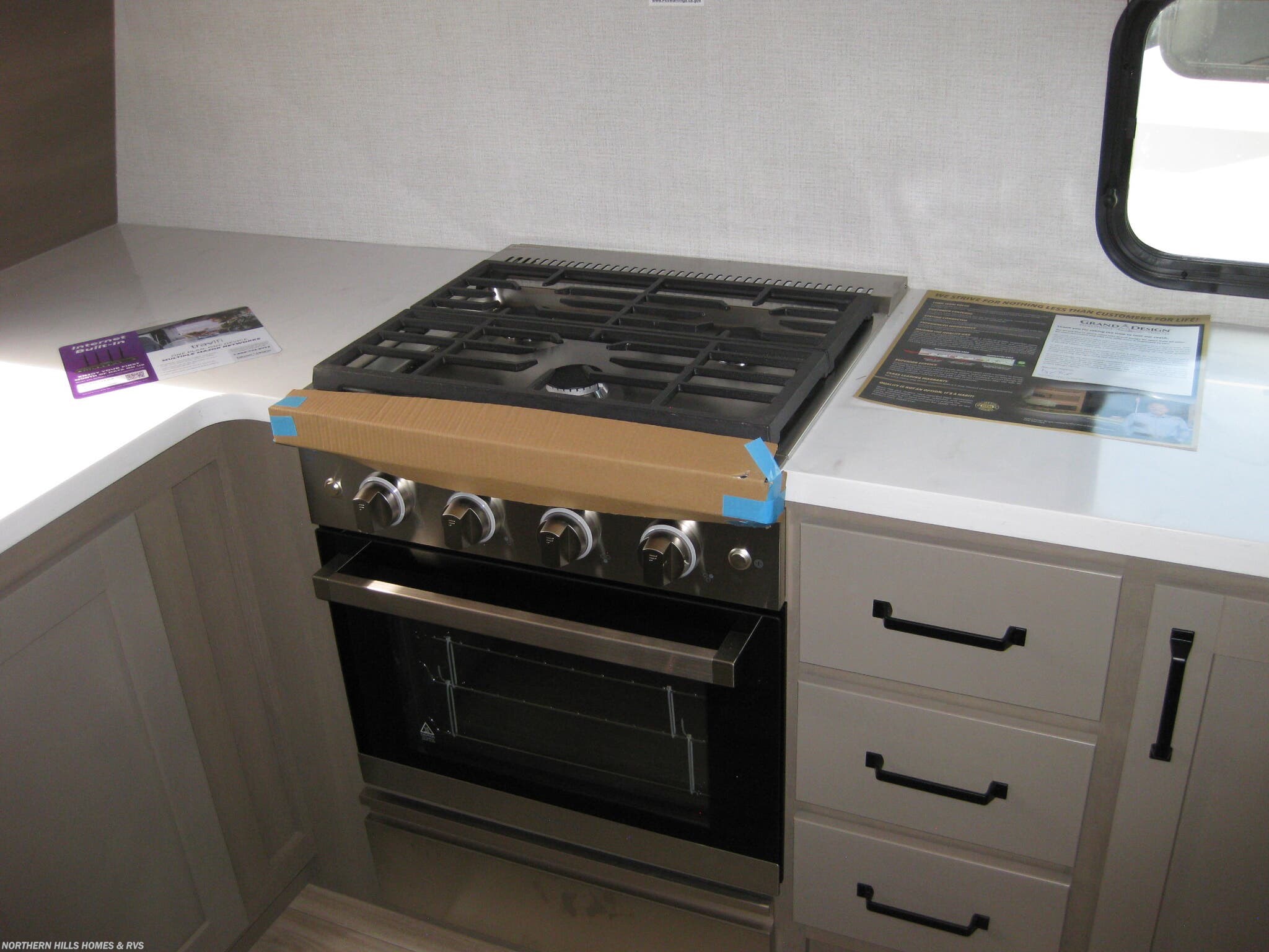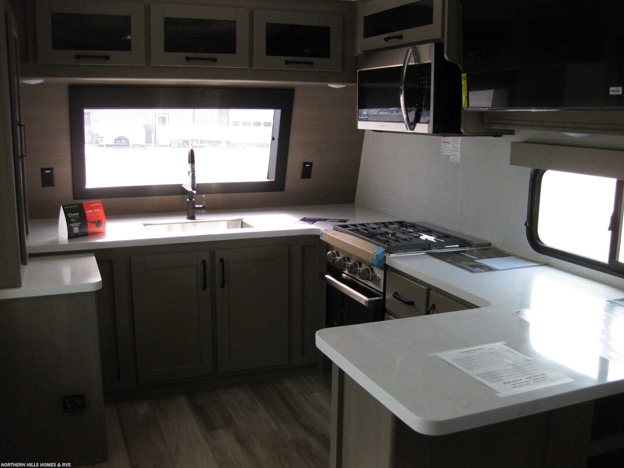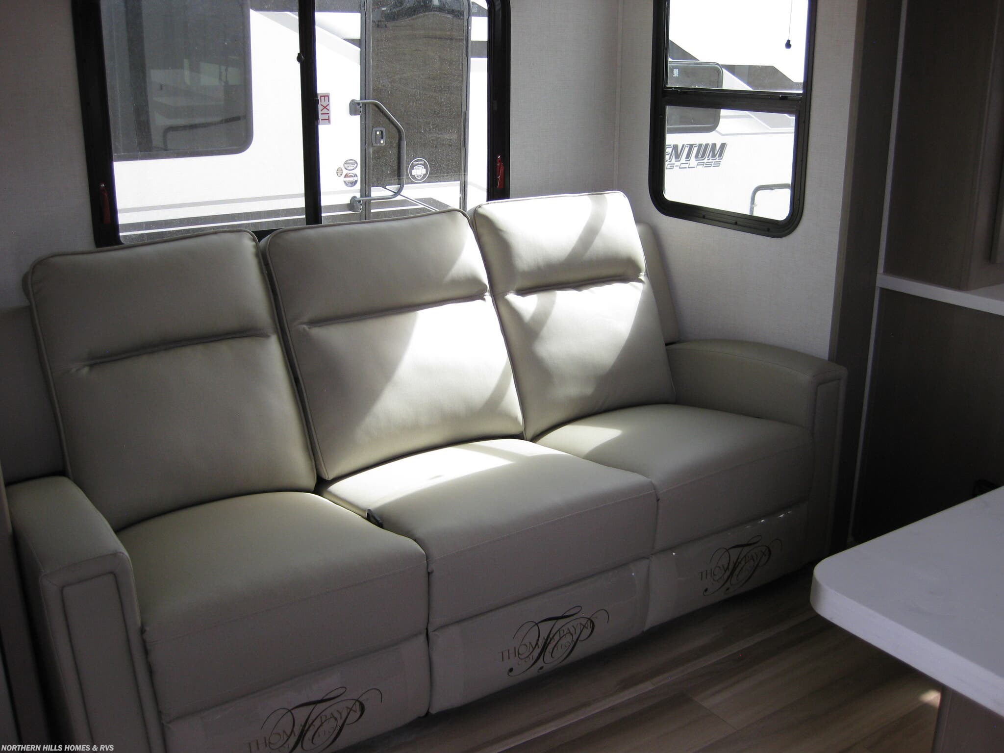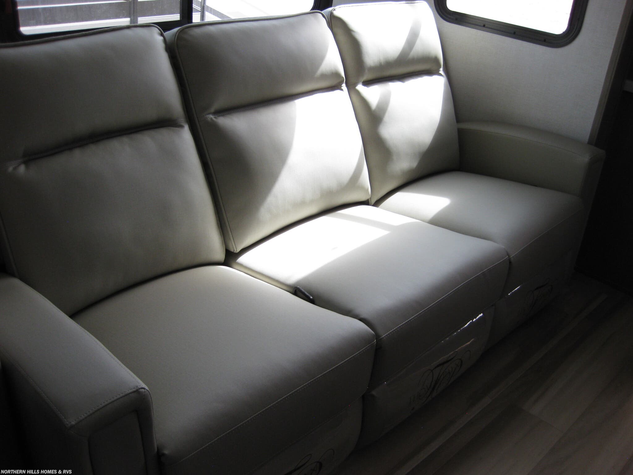 The Reflection travel trailer boasts a thoughtfully designed floor plan featuring a length of approximately 35 feet 9 inches, providing ample space to relax and unwind. It comfortably sleeps four people, making it perfect for family getaways or group adventures. Inside, you'll find a queen-sized bed, cozy rocker recliners, and multiple ceiling roof vents and skylights to flood the interior with natural light. The RV's interior ensures comfort with two efficient air conditioners (15,000 BTUs each) and a range of modern appliances including a microwave, oven, refrigerator, and stove top burner—perfect for preparing home-cooked meals on the road.