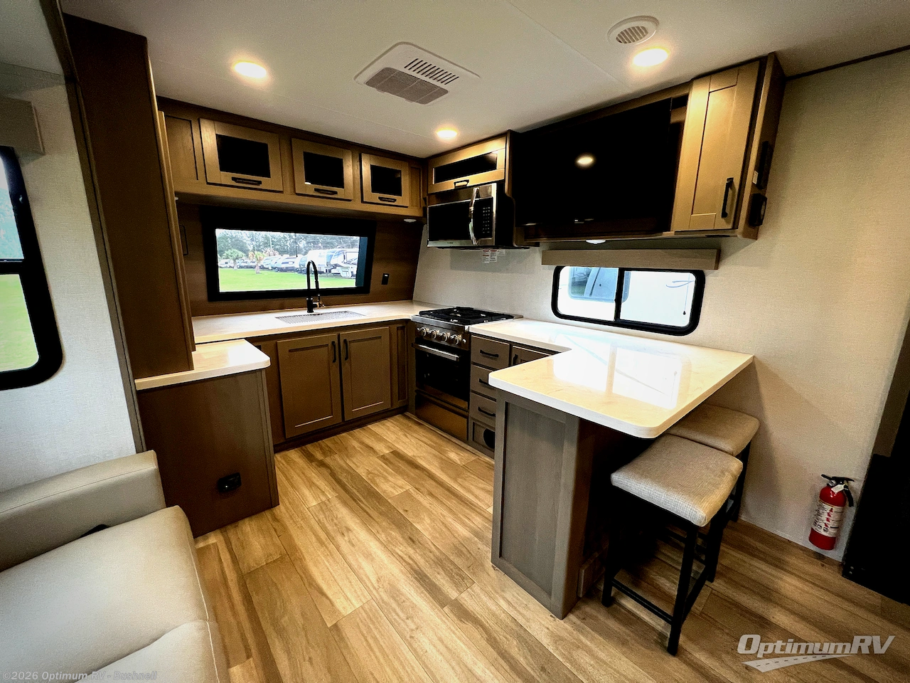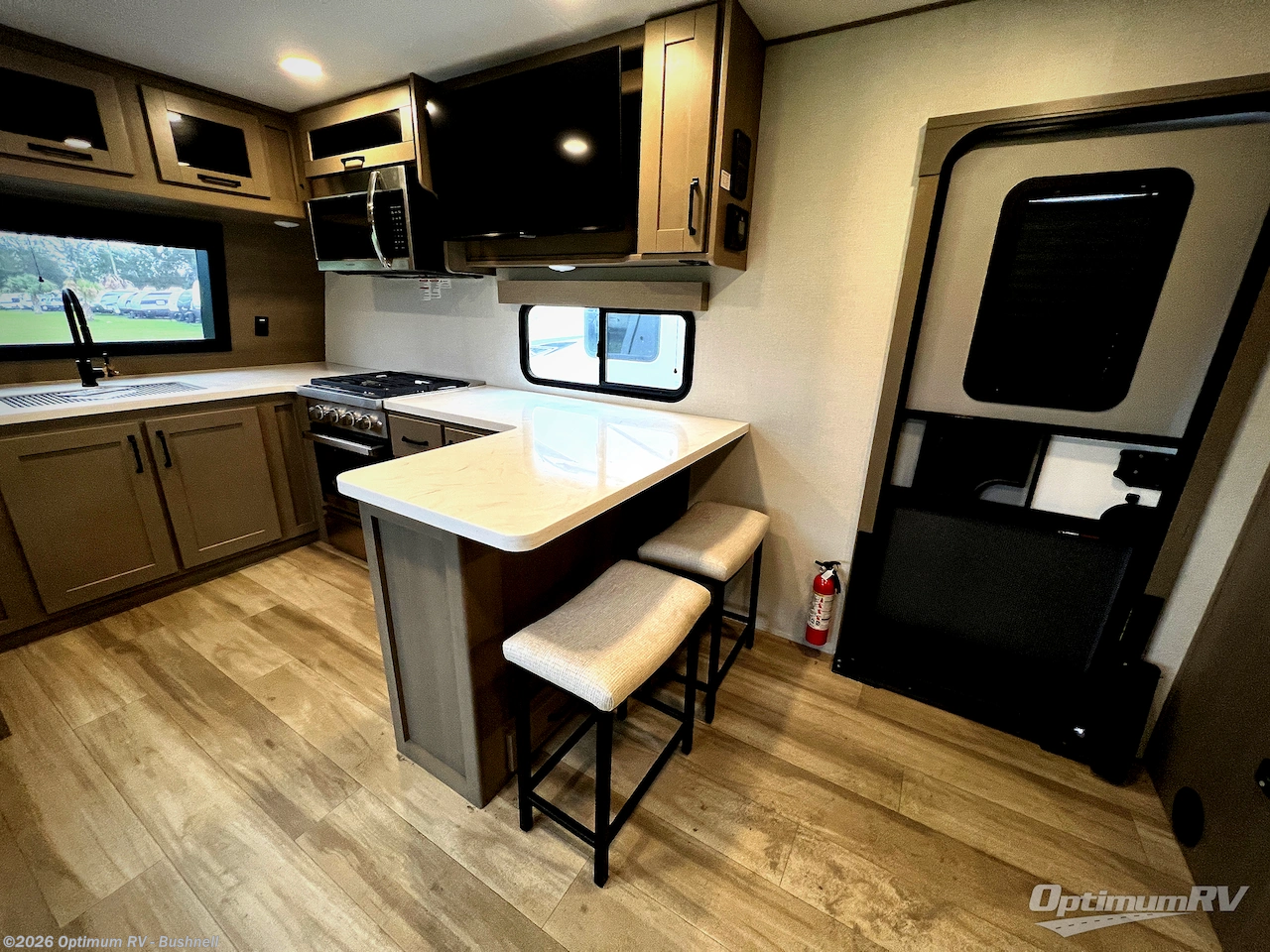 This front kitchen travel trailer will be perfect for camping trips to the lake or woods! There is ample counter space to prep your best meals, including an L-shaped kitchen counter with a bar stool to enjoy your coffee at. The theater seating is inviting, and you can choose the optional tri-fold sofa and end table or optional U-shaped dinette if you need more sleeping space for guests. This unit features a massive master bedroom with a queen bed slide and optional king bed, two closets, and a spacious rear bath. There are two bath sinks here, a 30" x 48" shower, plus washer and dryer prep if you choose to add these appliances!