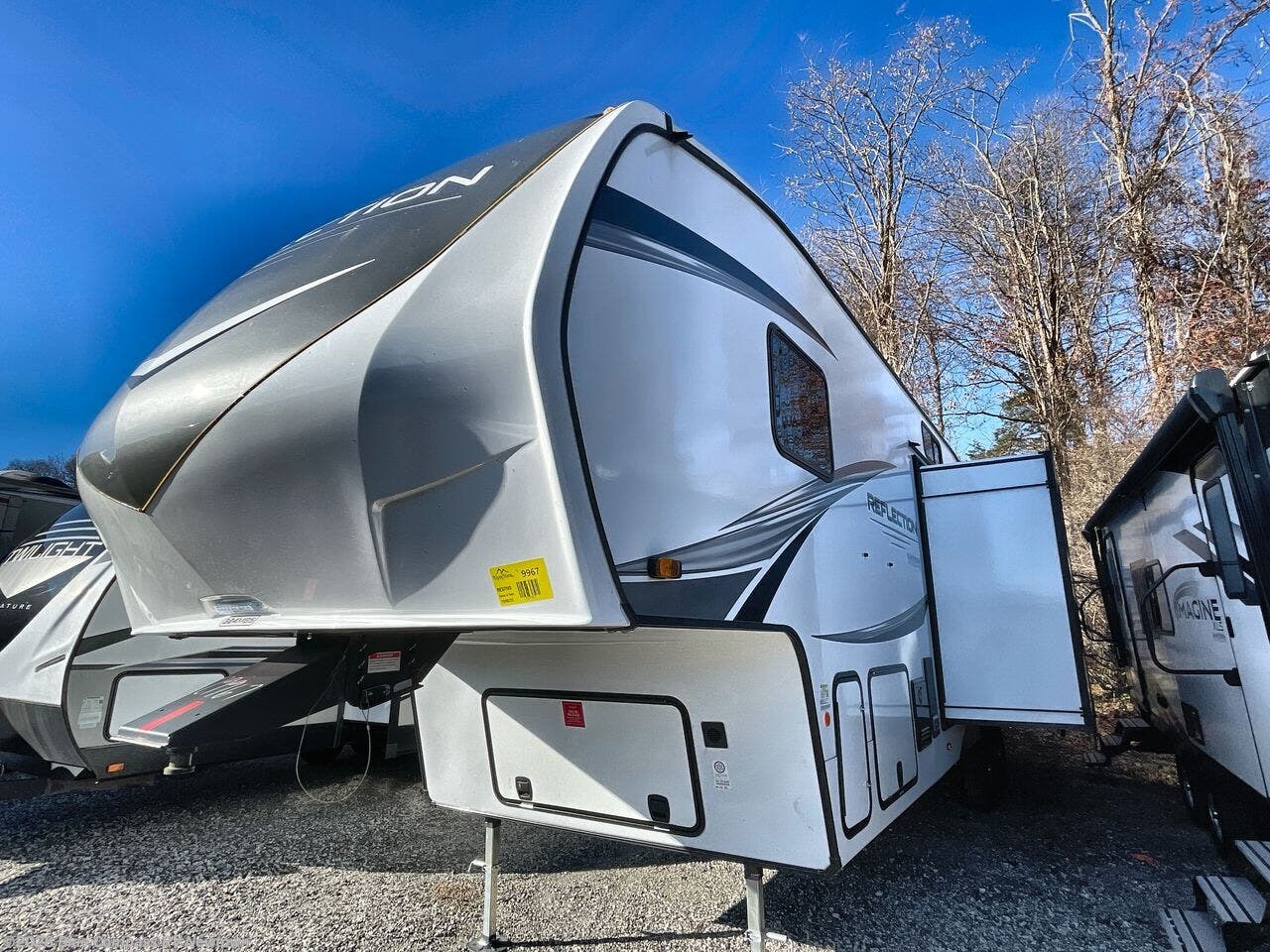 With any Reflection fifth wheel by Grand Design, you will have a solar panel for off-grid camping and a 60 amp charge controller and inverter prep, a Universal All-In-One docking station, unobstructed pass-through storage, and Goodyear Endurance tires. Each is constructed of gel coat exterior sidewalls, residential 5" truss rafters, walk-on roof decking, a fiberglass and radiant foil roof and front cap insulation plus laminated aluminum framed side walls, roof and end walls in slide rooms. Head inside to enjoy residential hardwood cabinet doors, premium Congoleum flooring, a spacious shower with a glass door, and many more comforts!