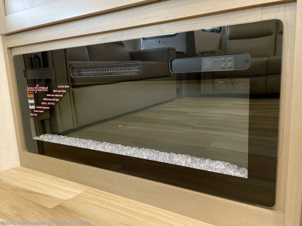 You can enjoy a spacious rear living area in this RV with dual opposing slides offering you entertainment, kitchen amenities, seating and windows for great views! The rear tri-fold sofa also converts into extra sleeping space for an extra guest or two, just like the booth dinette does. Yet you might like to add the swivel dinette option. There are theater seats to enjoy while you place your drinks in the cupholders and watch the entertainment center with a 40" LED HDTV and fireplace. The pantry is big enough to store your favorite snacks, and the kitchen island will make meal prepping easier, plus there is a 16 cu. ft. refrigerator to store any leftovers. The full bathroom has a 30" x 48" fiberglass shower and a linen closet to store your towels. The front private bedroom has a comfortable queen bed slide that can be switched out for the optional king bed, a dresser with overhead cabinets, and a full wall wardrobe that is prepped to add the optional washer and dryer so that you can extend your camping trip with clean clothes!