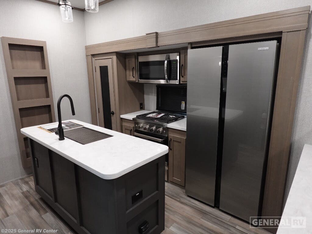 Experience the ultimate in luxury and comfort with the 2025 Grand Design Reflection 360FLS. This fifth wheel is designed for those who crave space and sophistication on the road. With its expansive front living area, you’ll find two tri-fold sofas and theater seating, perfect for entertaining or relaxing after a day of adventure. The center kitchen is a culinary enthusiast's dream, featuring a full-size electric refrigerator and a three-burner cooktop, all framed by elegant cabinetry and a spacious island for meal prep. Venture towards the rear, and you'll discover a serene bedroom retreat with a plush queen bed, with an optional king upgrade, offering a restful night's sleep. The cleverly designed center bath ensures convenience, while the washer/dryer prep adds a touch of home-like practicality. With a generous cargo capacity and a 19-foot powered retractable awning, this RV is ready for both short getaways and extended stays. To explore this exceptional model further, visit your nearest General RV dealership.