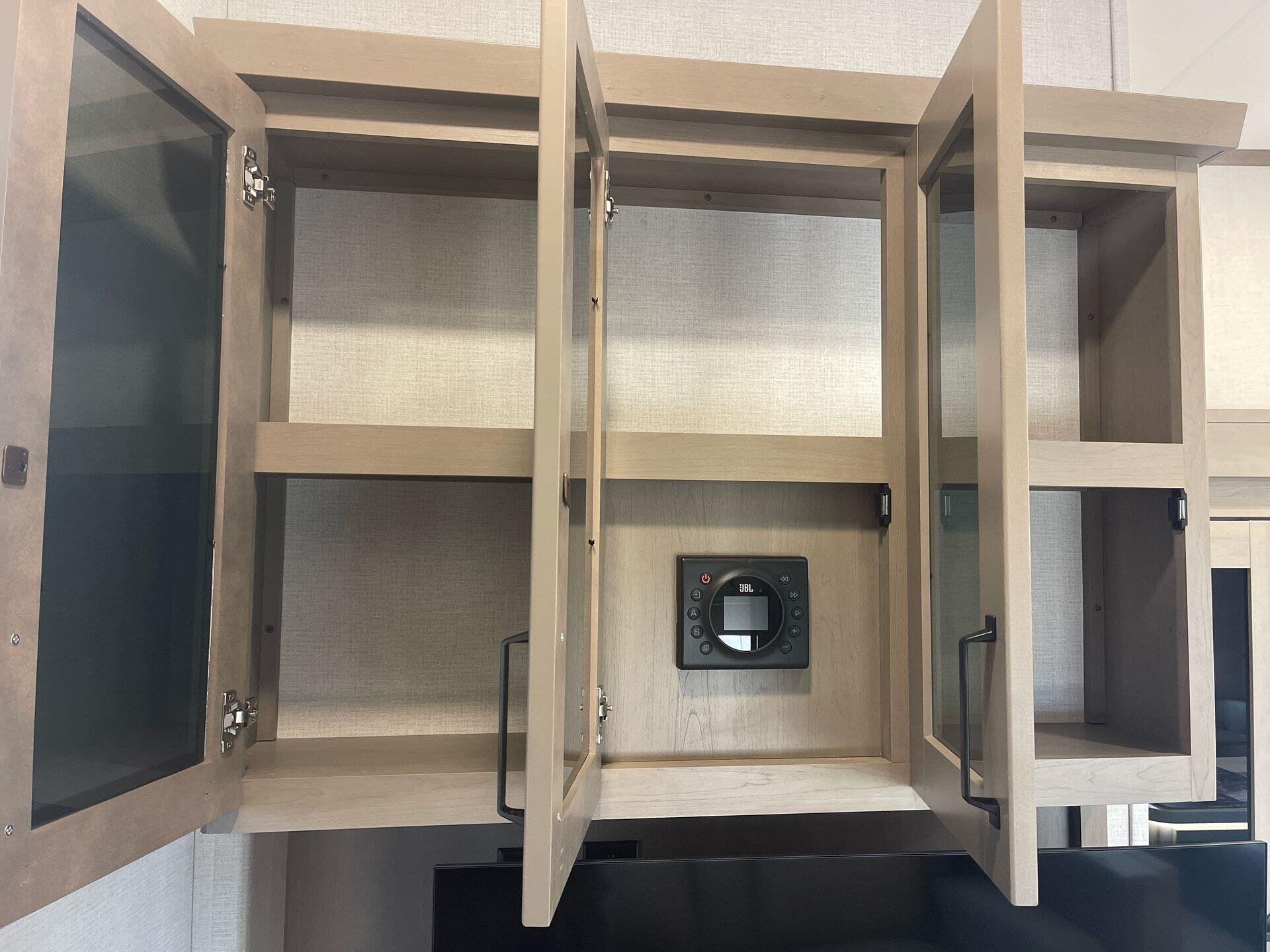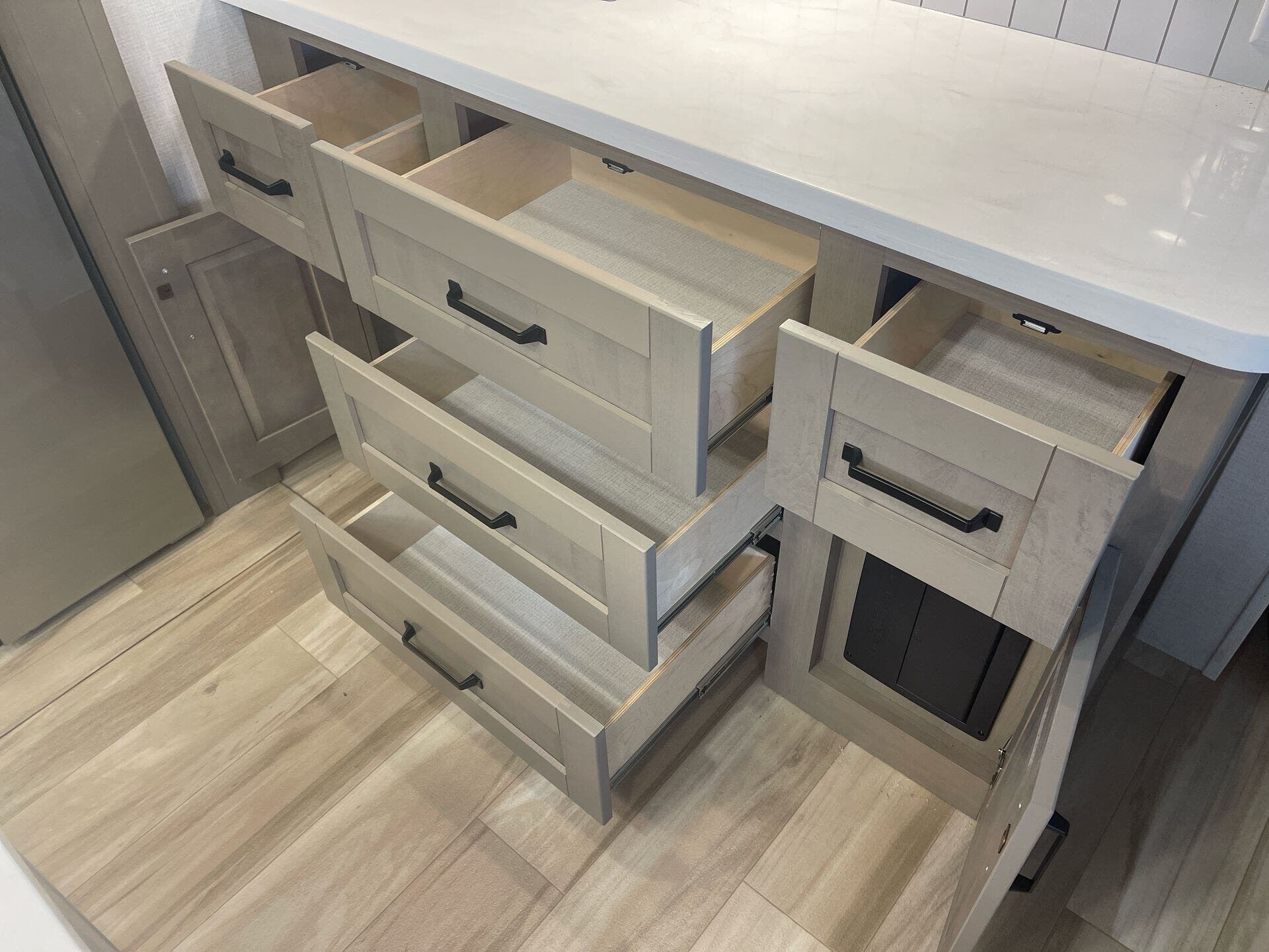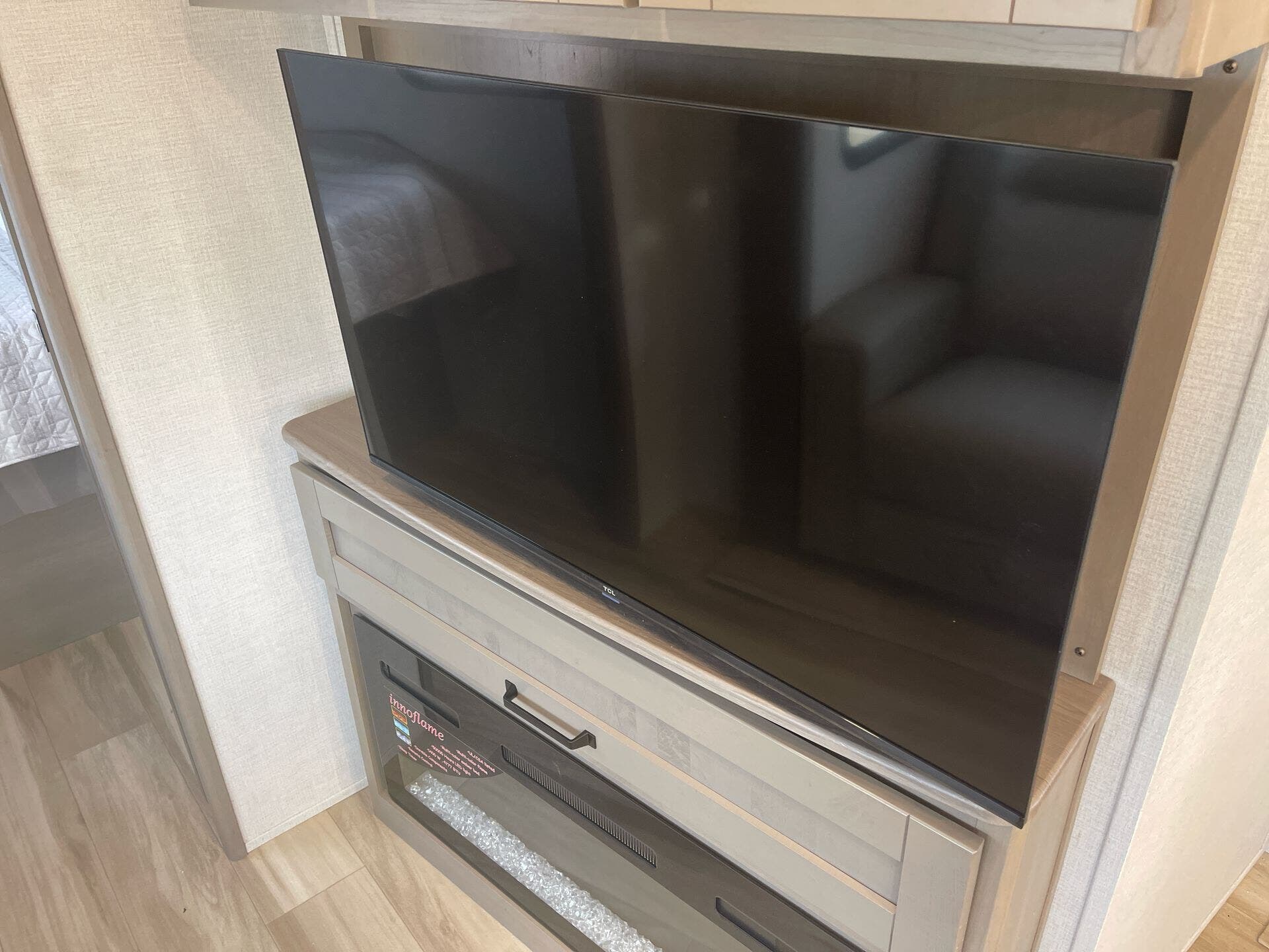 The central living area is designed for relaxation and entertainment, equipped with theater seating, a booth dinette, and a 40-inch LED TV above a cozy fireplace. The kitchen boasts a functional island, a three-burner cooktop, oven, microwave, and a 16-cubic-foot 12V refrigerator, providing ample space for meal preparation and storage. ?cite?turn0search2?