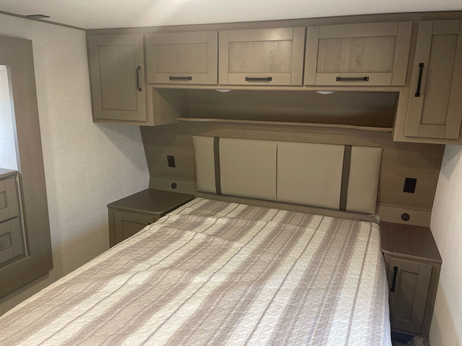 Additional amenities include two electric awnings (13' and 10'6") with LED lighting, an on-demand tankless water heater, a 35,000 BTU furnace, and a 15,000 BTU air conditioner, ensuring comfort in various climates. The exterior features an outdoor kitchen with a 4.1-cubic-foot refrigerator and griddle, enhancing the outdoor living experience. ?cite?turn0search2?