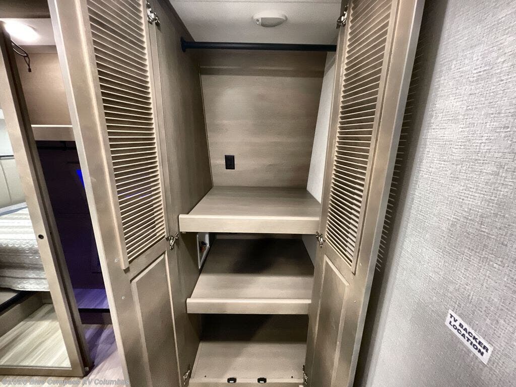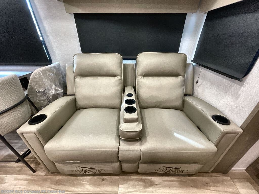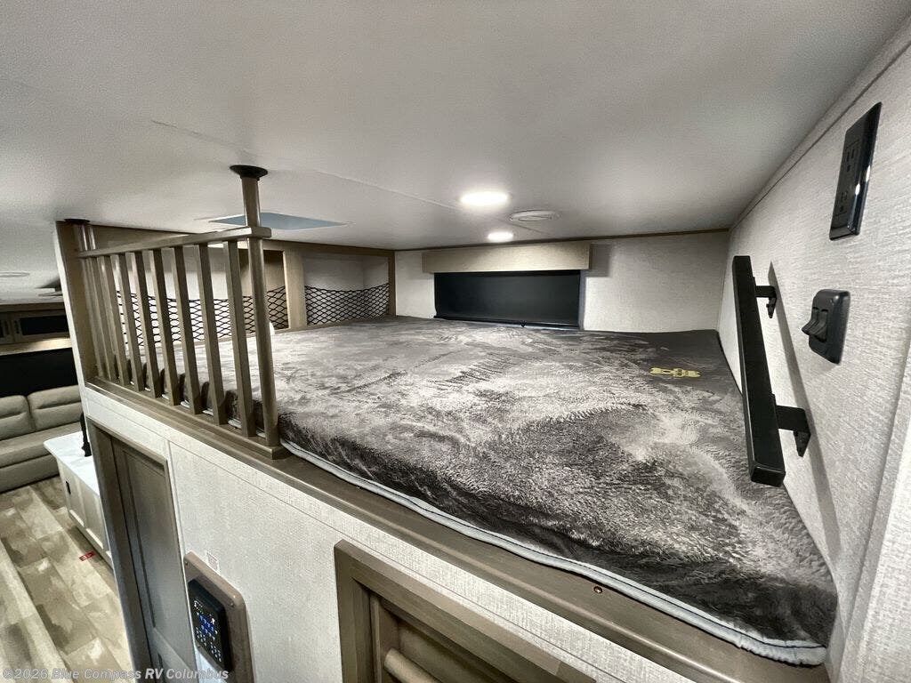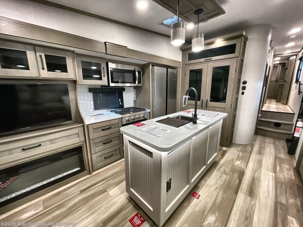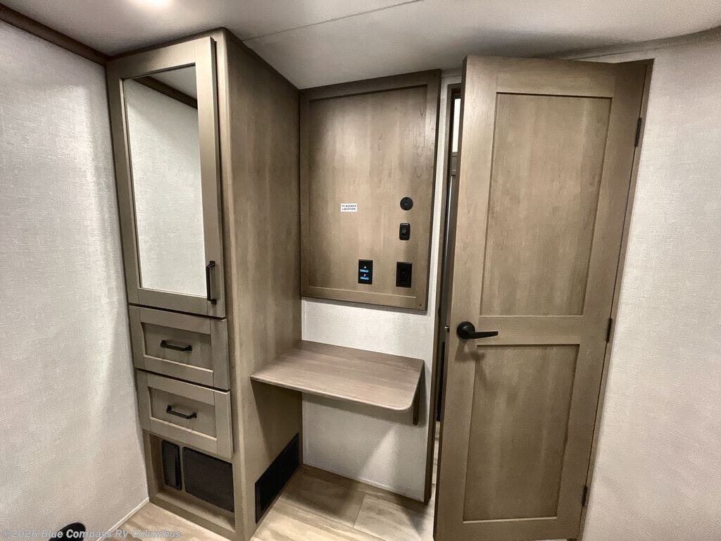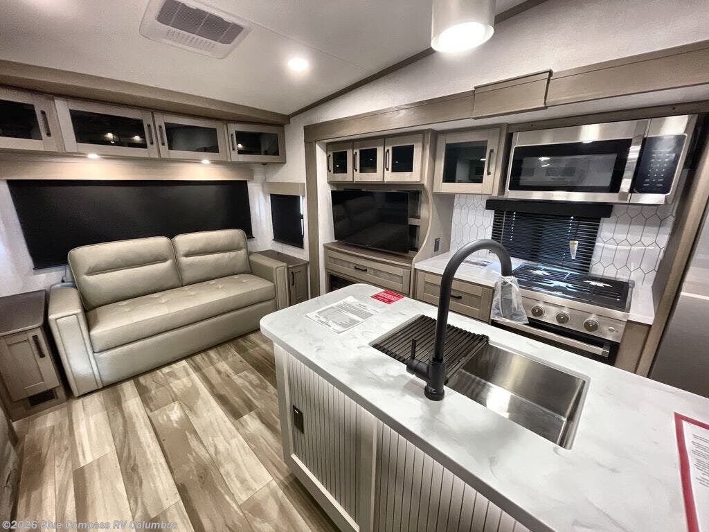 Travel to see new state parks, RV resorts or your family in other states as you tow this fifth wheel to each destination! You will enjoy comfort and convenience, plus a place to work, and be able to offer extra sleeping space for friends and family when they visit. The middle extra room provides a tri-fold sofa slide, a desk, a wardrobe, plus a 64" x 88" upper bed loft area with access from the hallway. The full bathroom will keep everyone refreshed, and the front bedroom allows you to sleep on a queen bed slide or choose the king option. And you will love the front wardrobe, the dresser, and the option to add a washer/dryer. The main living and kitchen area provides plenty of seating from the rear tri-fold sofa, the booth dinette or swivel dinette option, and the theater seats with cupholders. And the kitchen island, appliances, and large pantry allow you to take everything you need with you.