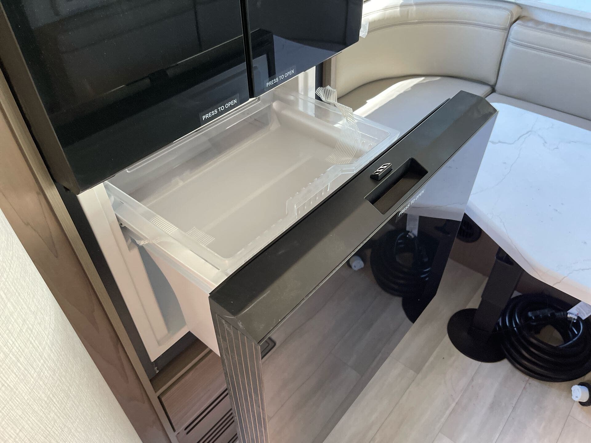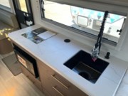 Inside, the 160LG features a rear queen-size bed with wraparound overhead storage, providing a comfortable sleeping area. The front U-shaped dinette converts into an additional sleeping space, accommodating up to four occupants. The kitchen is well-appointed with a convection microwave, induction cooktop, 8 cu. ft. 12V French door refrigerator, and solid-surface countertops, ensuring all the conveniences of home. The mid-bathroom includes a 24" x 32" shower, toilet, and flip-up sink, providing all the comforts of home.