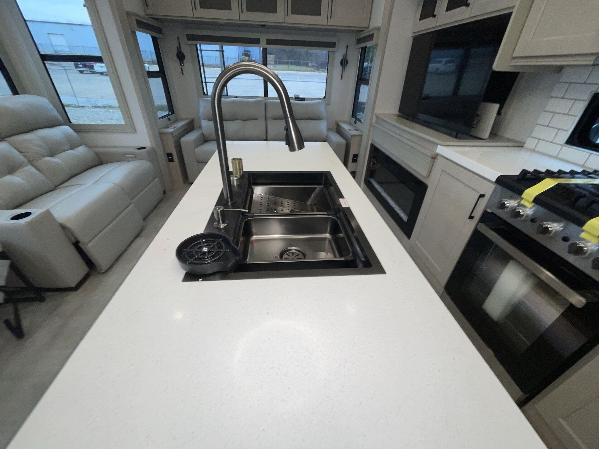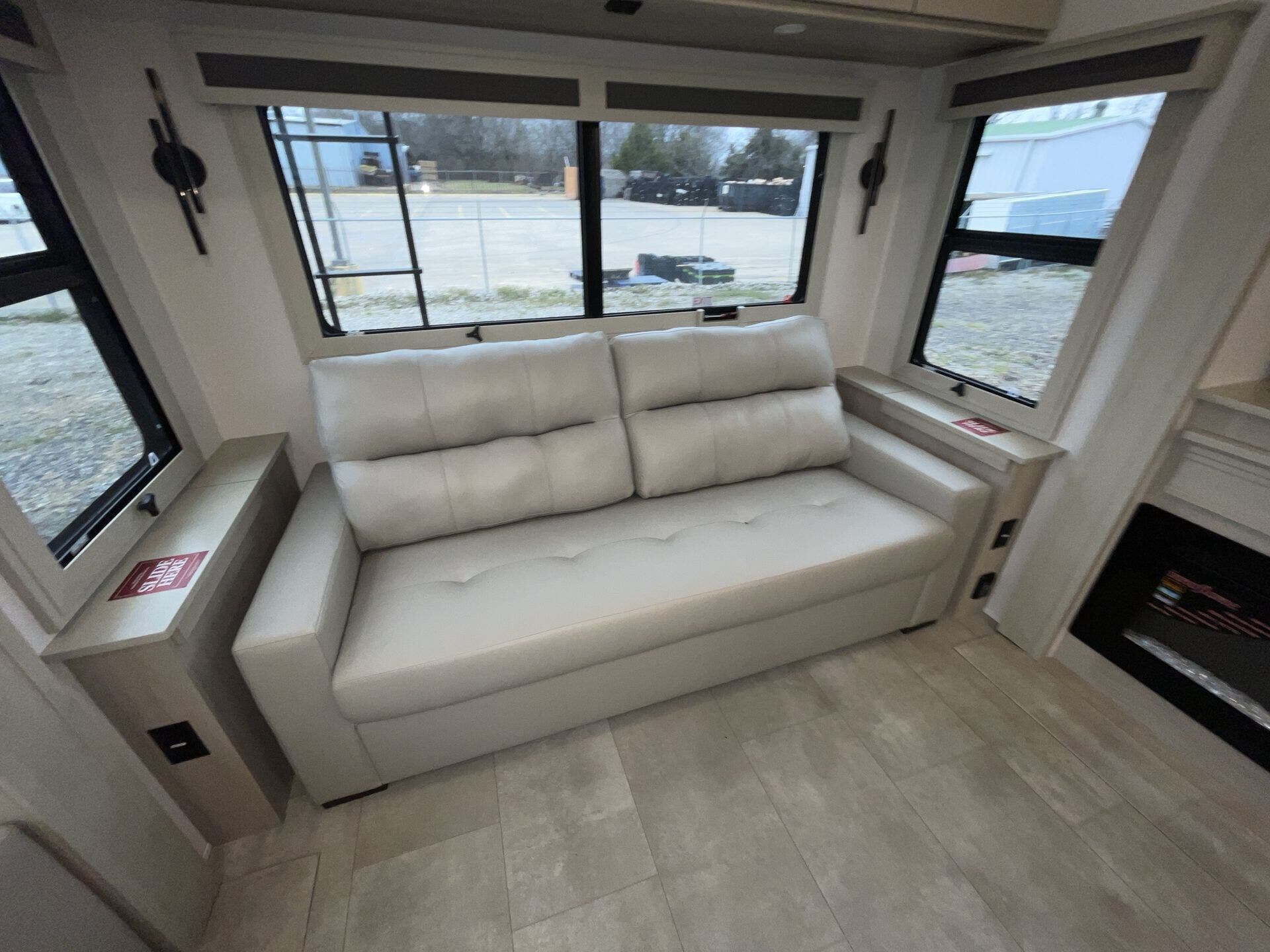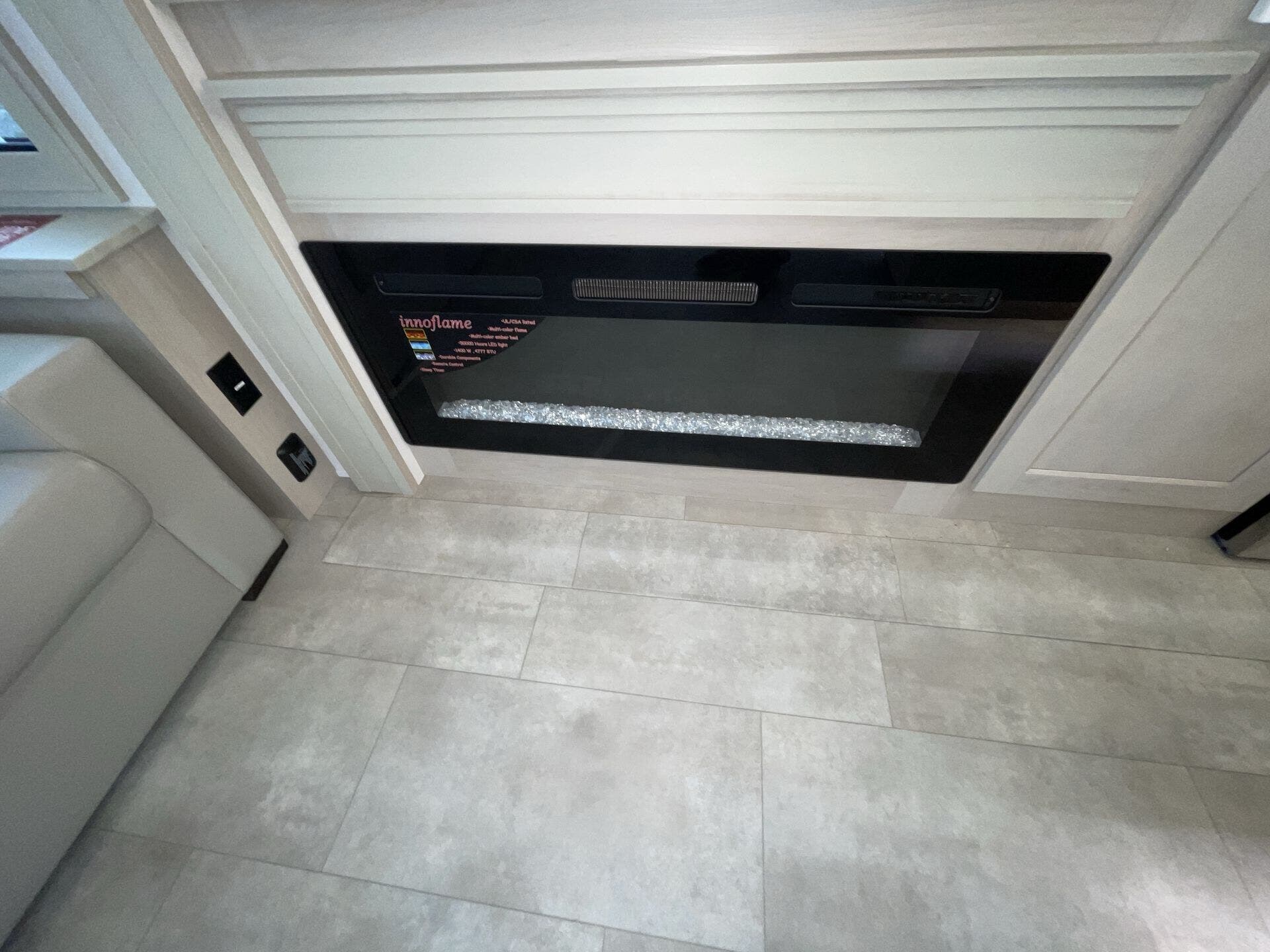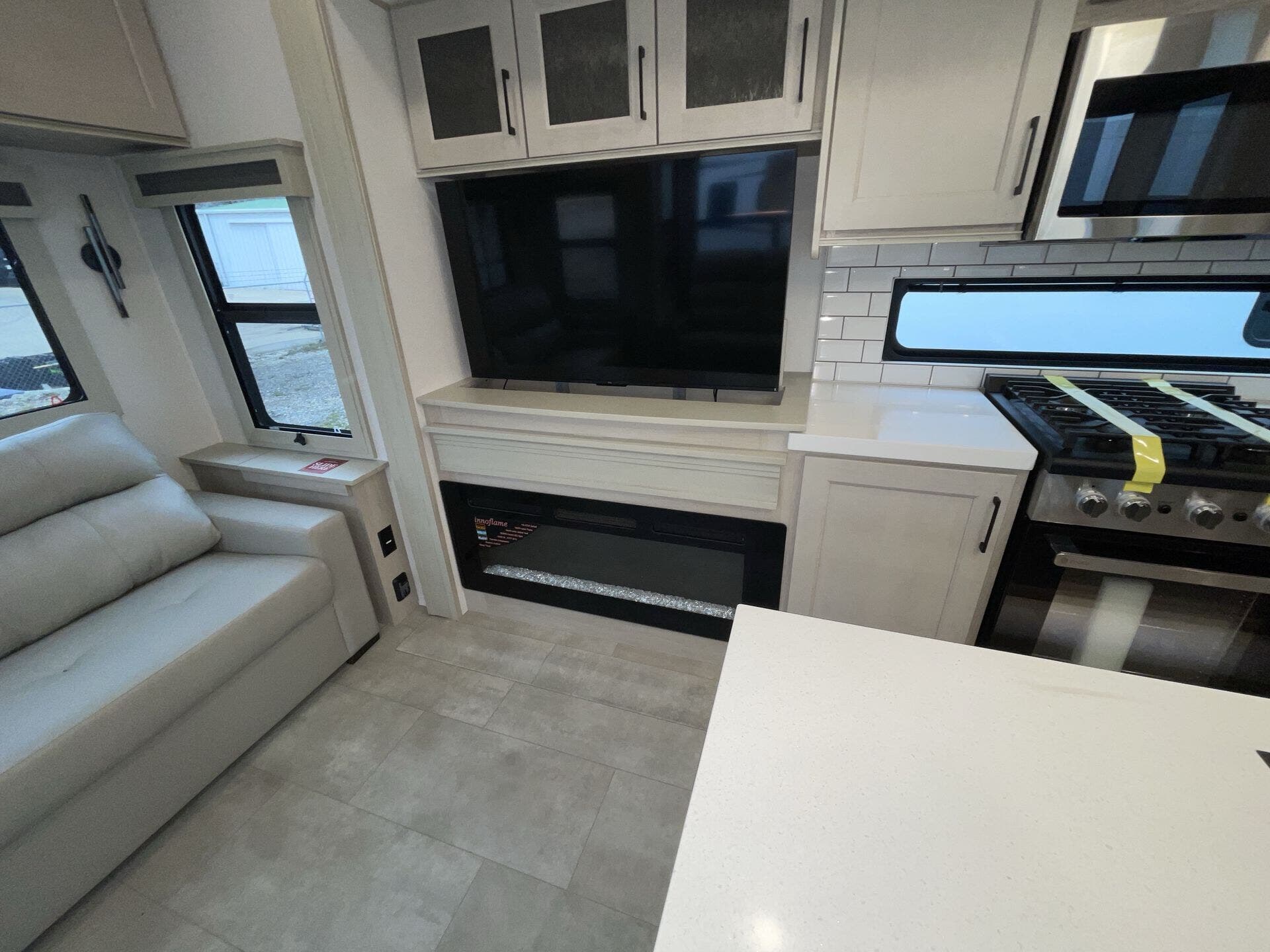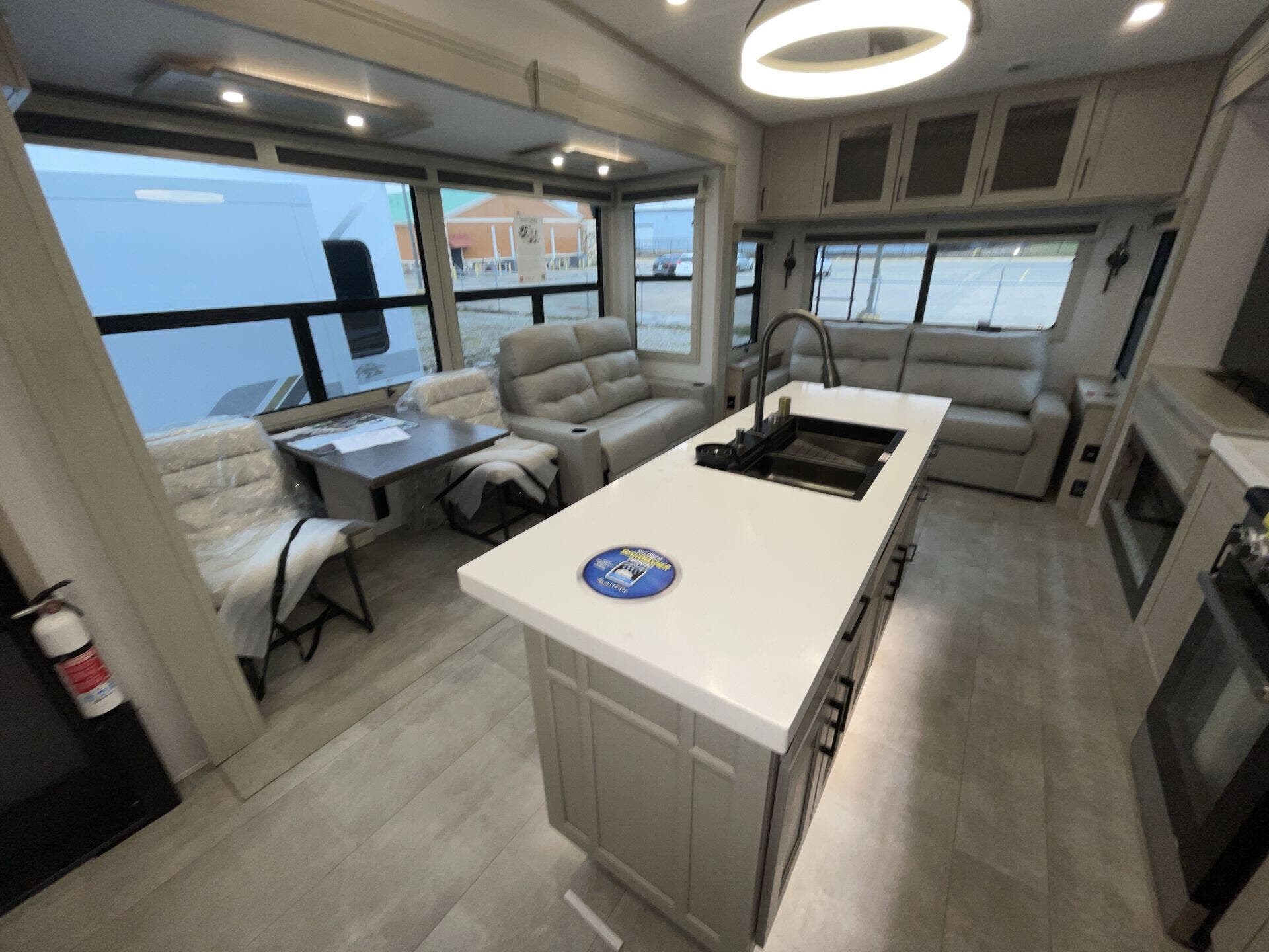 Relax in the cozy living area, featuring power reclining theater seats, a tri-fold sofa, an electric fireplace, and a large LED TV with a premium sound system. The master suite offers a king-size bed, ample storage, and washer/dryer prep, while the luxury bathroom includes a one-piece fiberglass shower with glass doors and a skylight. Built for all-season travel, the heated and enclosed underbelly, high-performance insulation, and dual 15,000 BTU A/Cs ensure comfort in any climate.