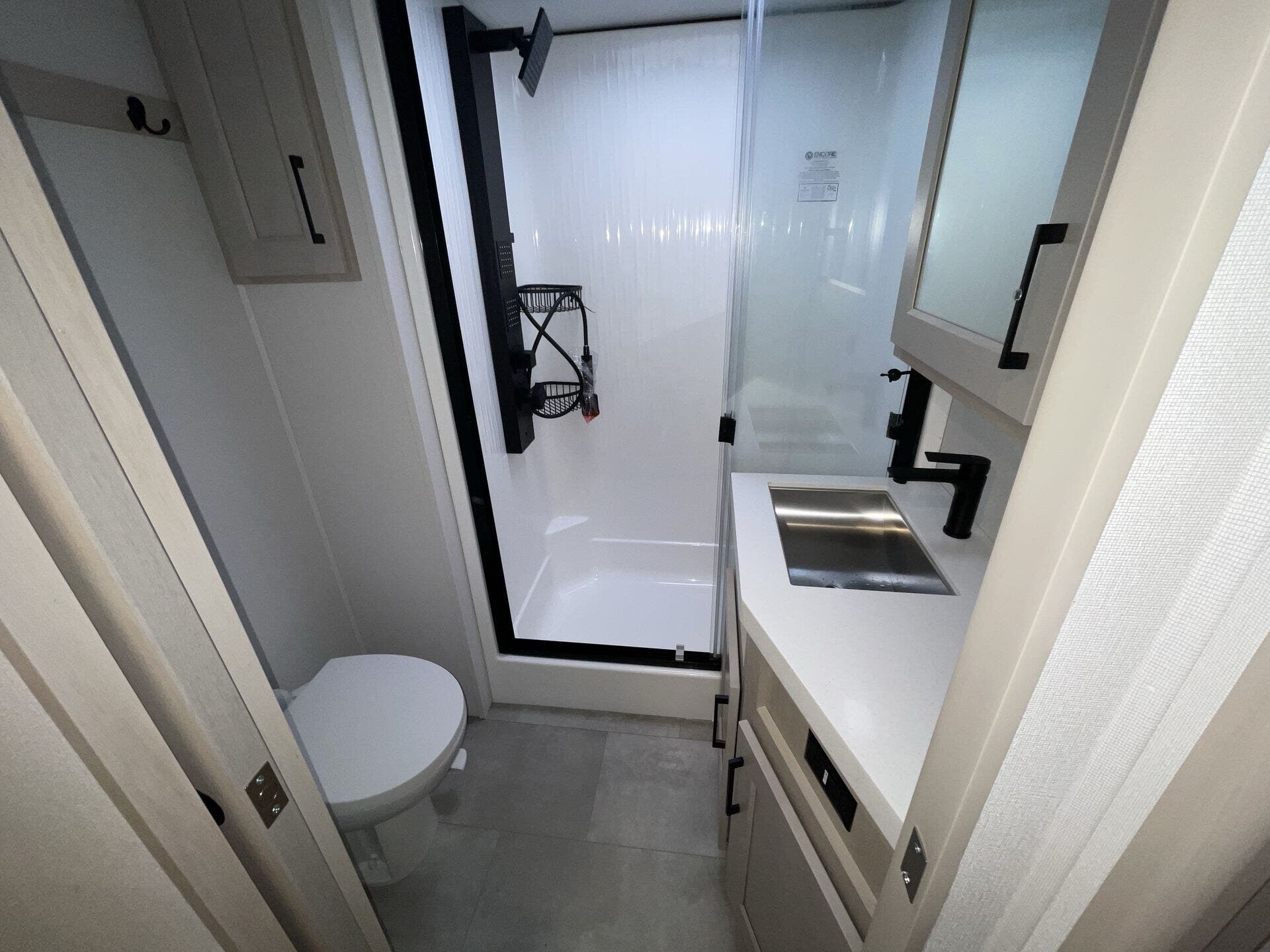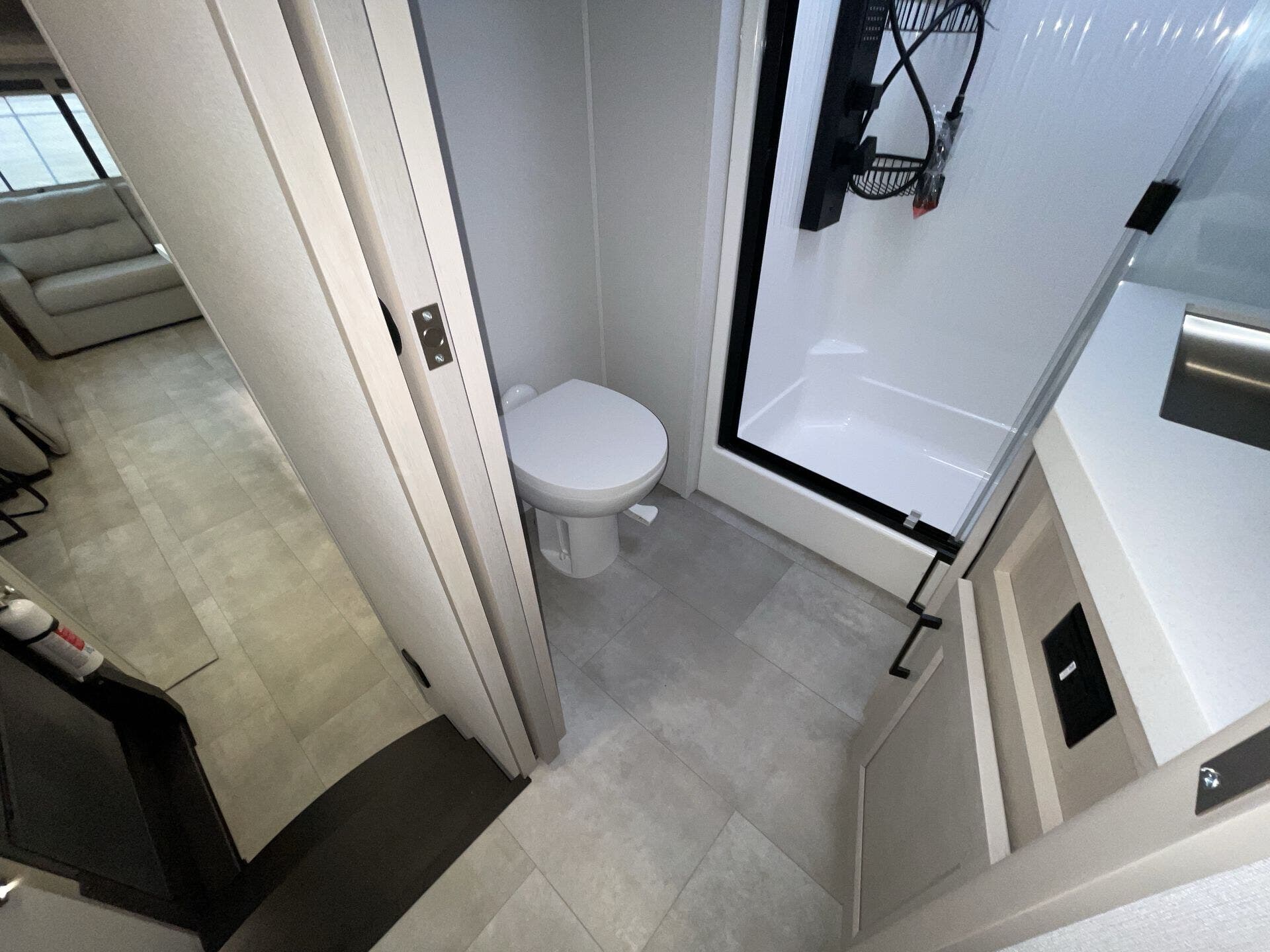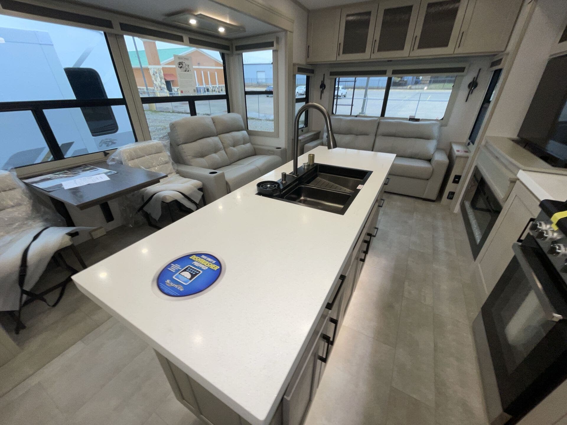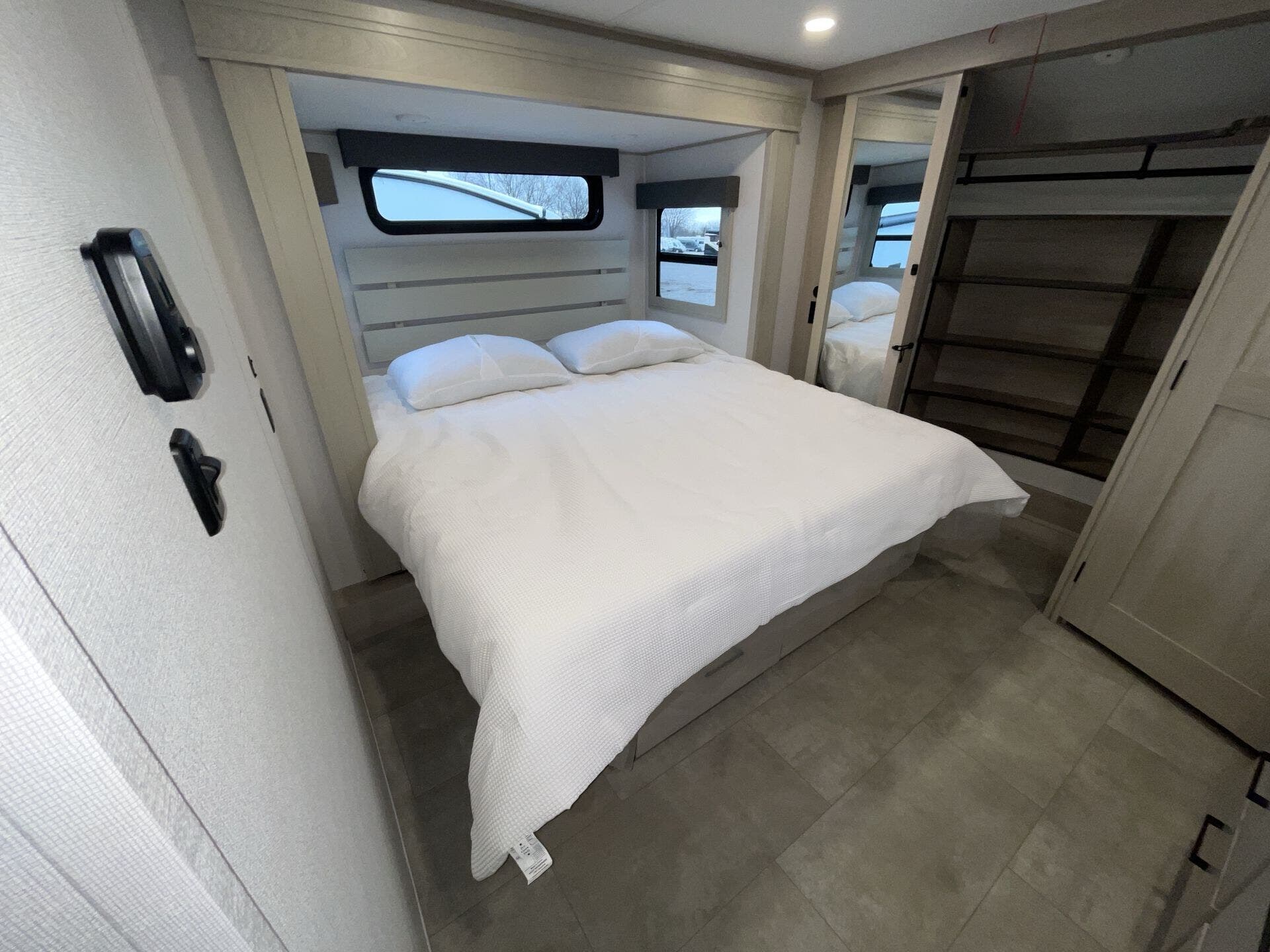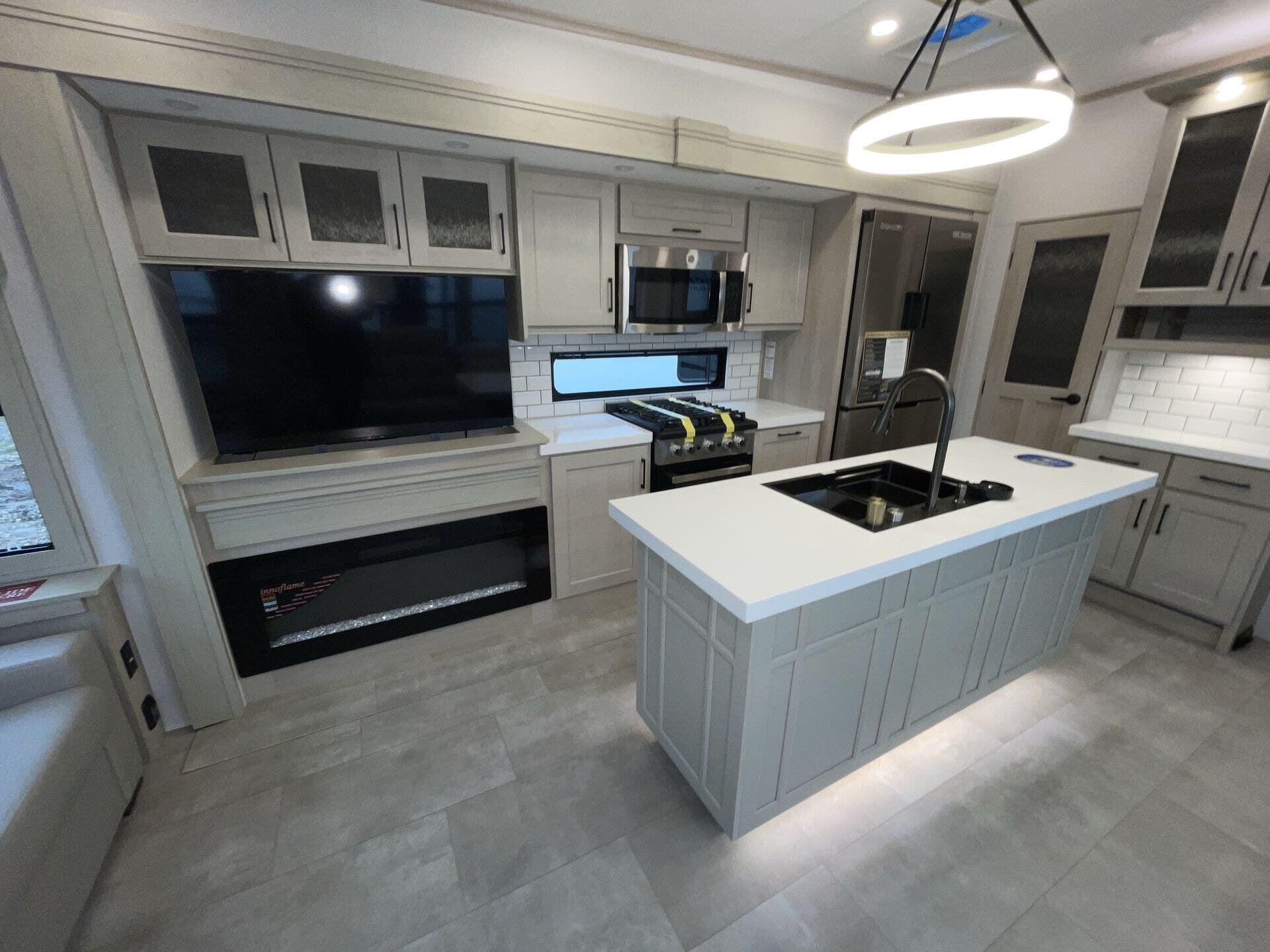 Relax in the cozy living area, featuring power reclining theater seats, a tri-fold sofa, an electric fireplace, and a large LED TV with a premium sound system. The master suite offers a king-size bed, ample storage, and washer/dryer prep, while the luxury bathroom includes a one-piece fiberglass shower with glass doors and a skylight. Built for all-season travel, the heated and enclosed underbelly, high-performance insulation, and dual 15,000 BTU A/Cs ensure comfort in any climate.