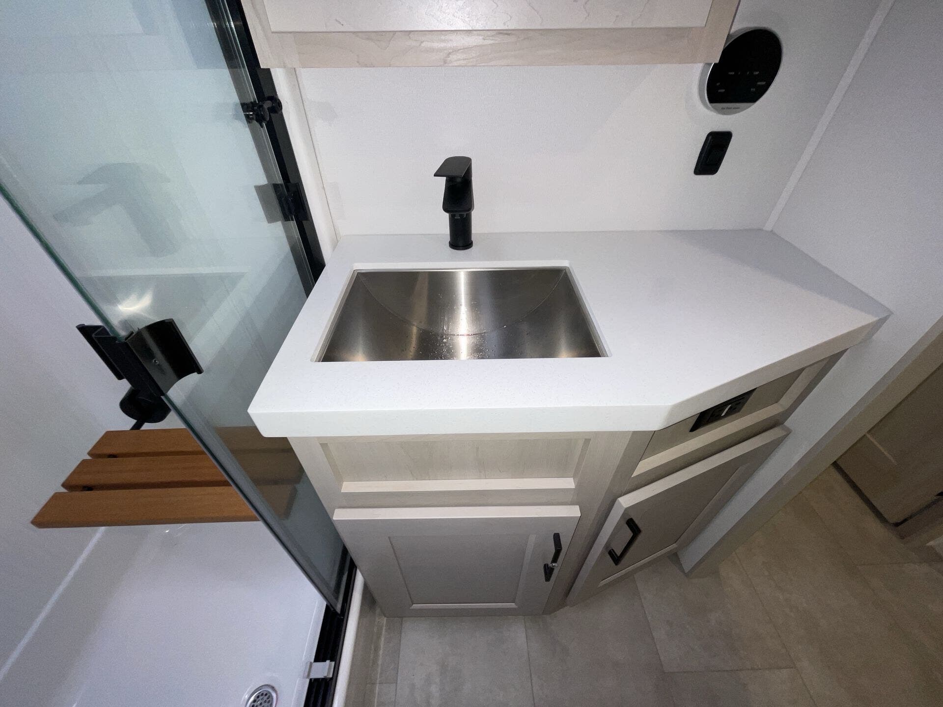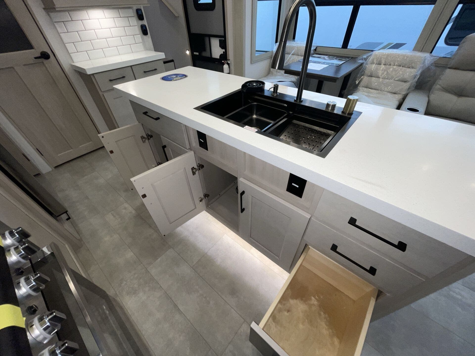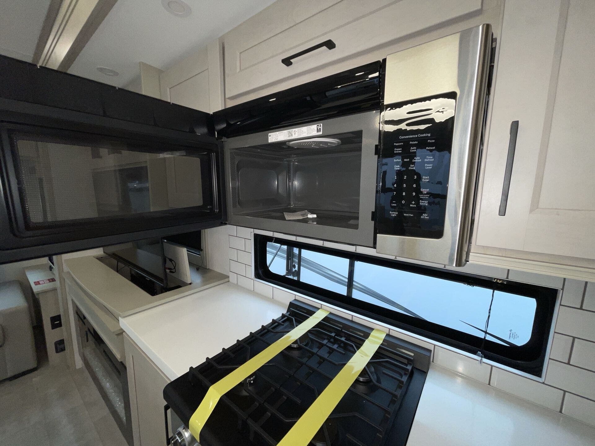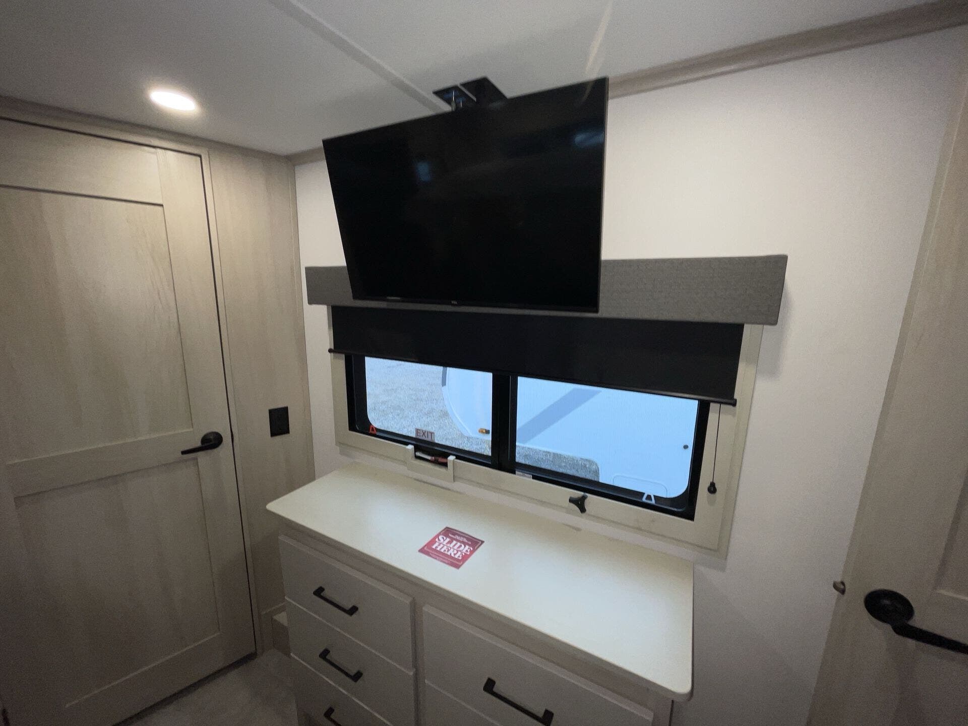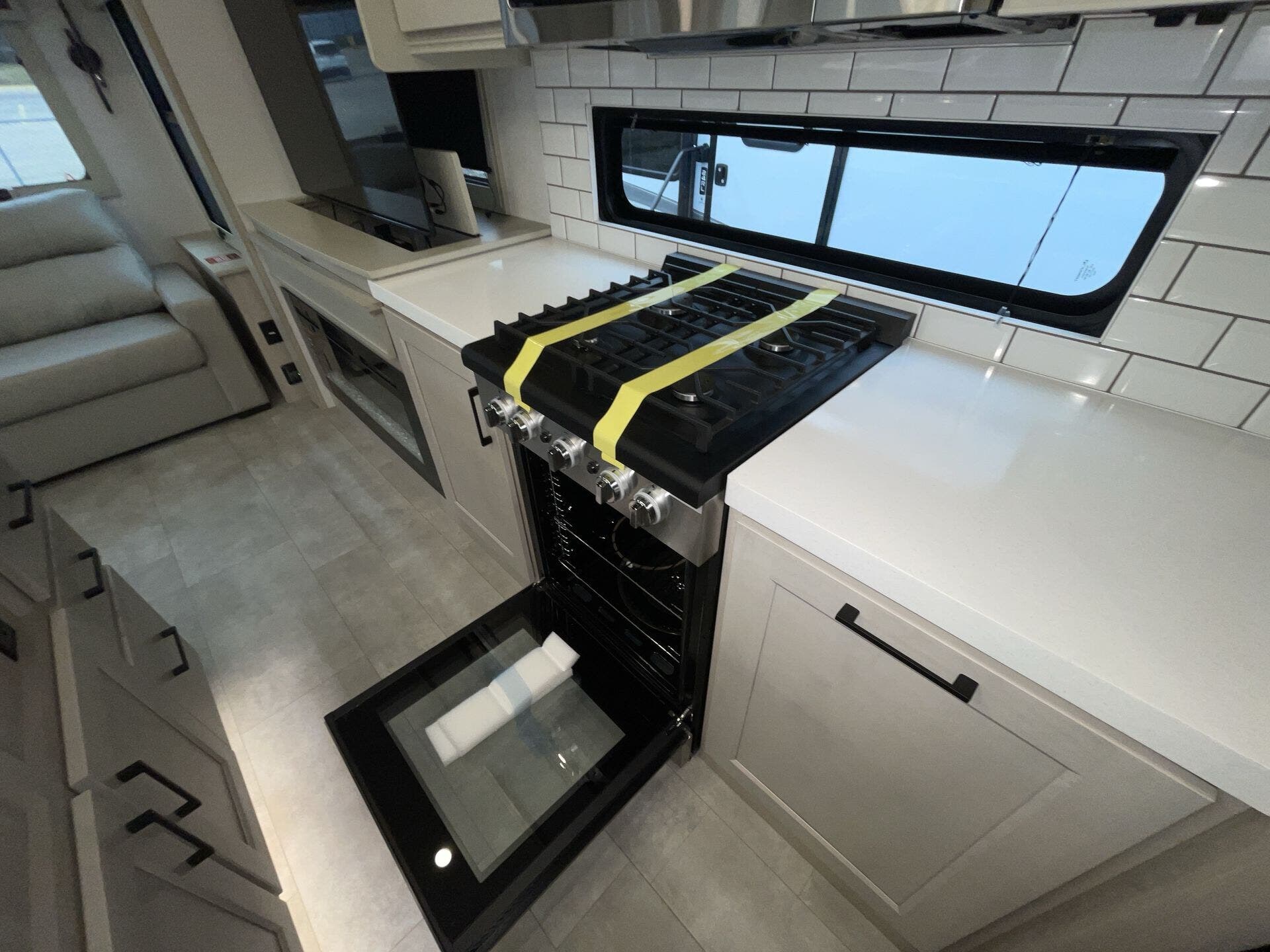 Relax in the cozy living area, featuring power reclining theater seats, a tri-fold sofa, an electric fireplace, and a large LED TV with a premium sound system. The master suite offers a king-size bed, ample storage, and washer/dryer prep, while the luxury bathroom includes a one-piece fiberglass shower with glass doors and a skylight. Built for all-season travel, the heated and enclosed underbelly, high-performance insulation, and dual 15,000 BTU A/Cs ensure comfort in any climate.