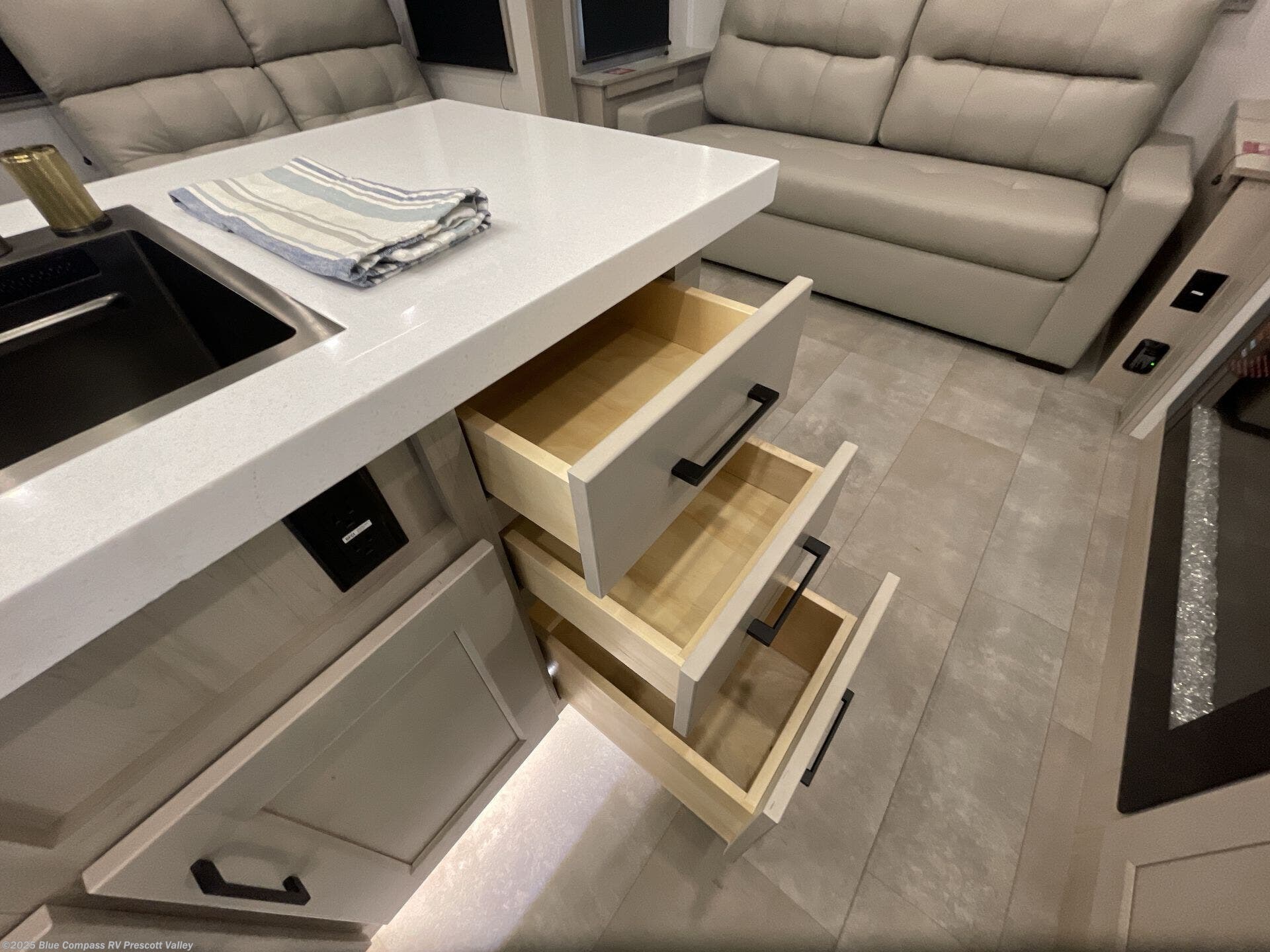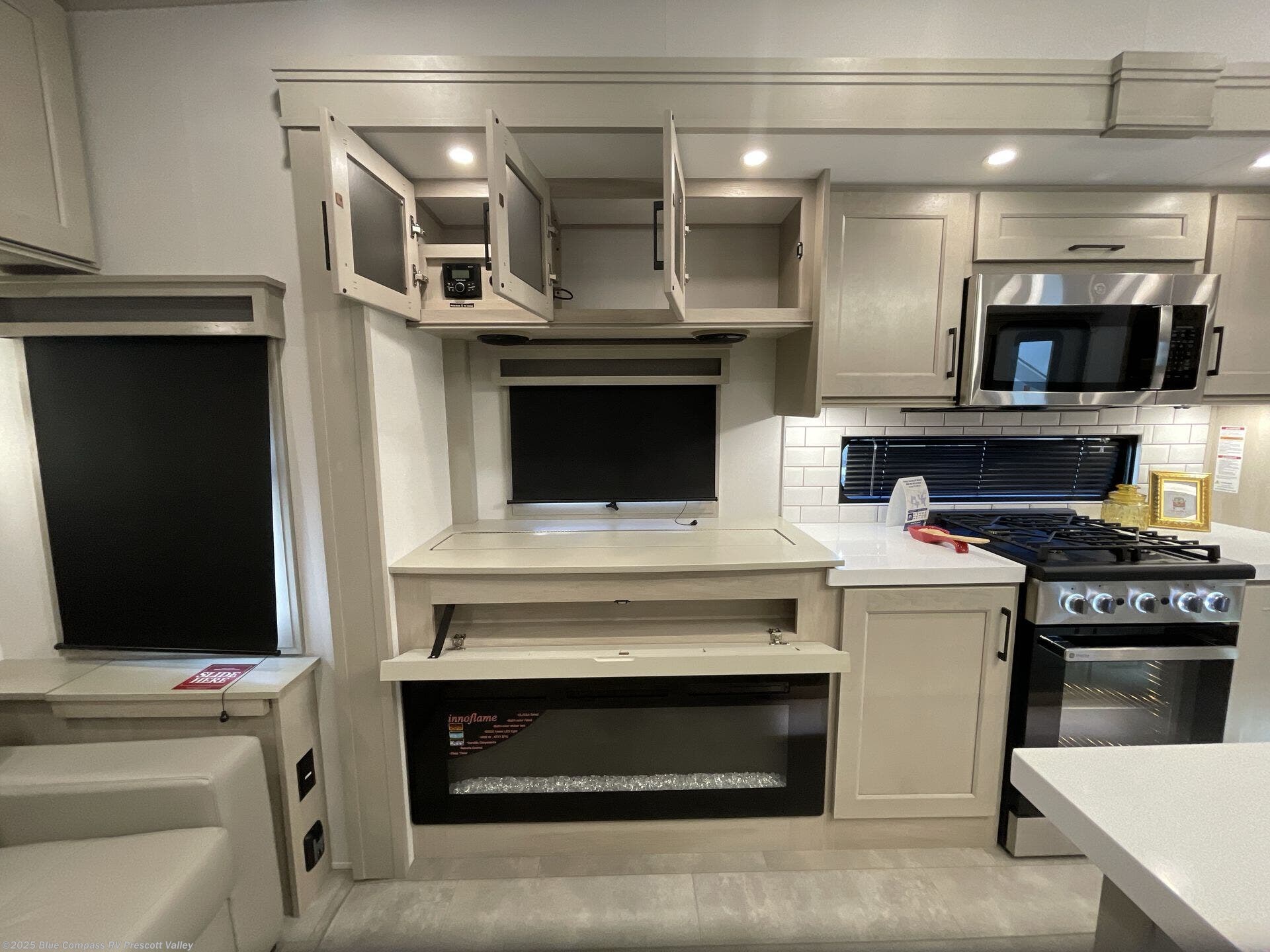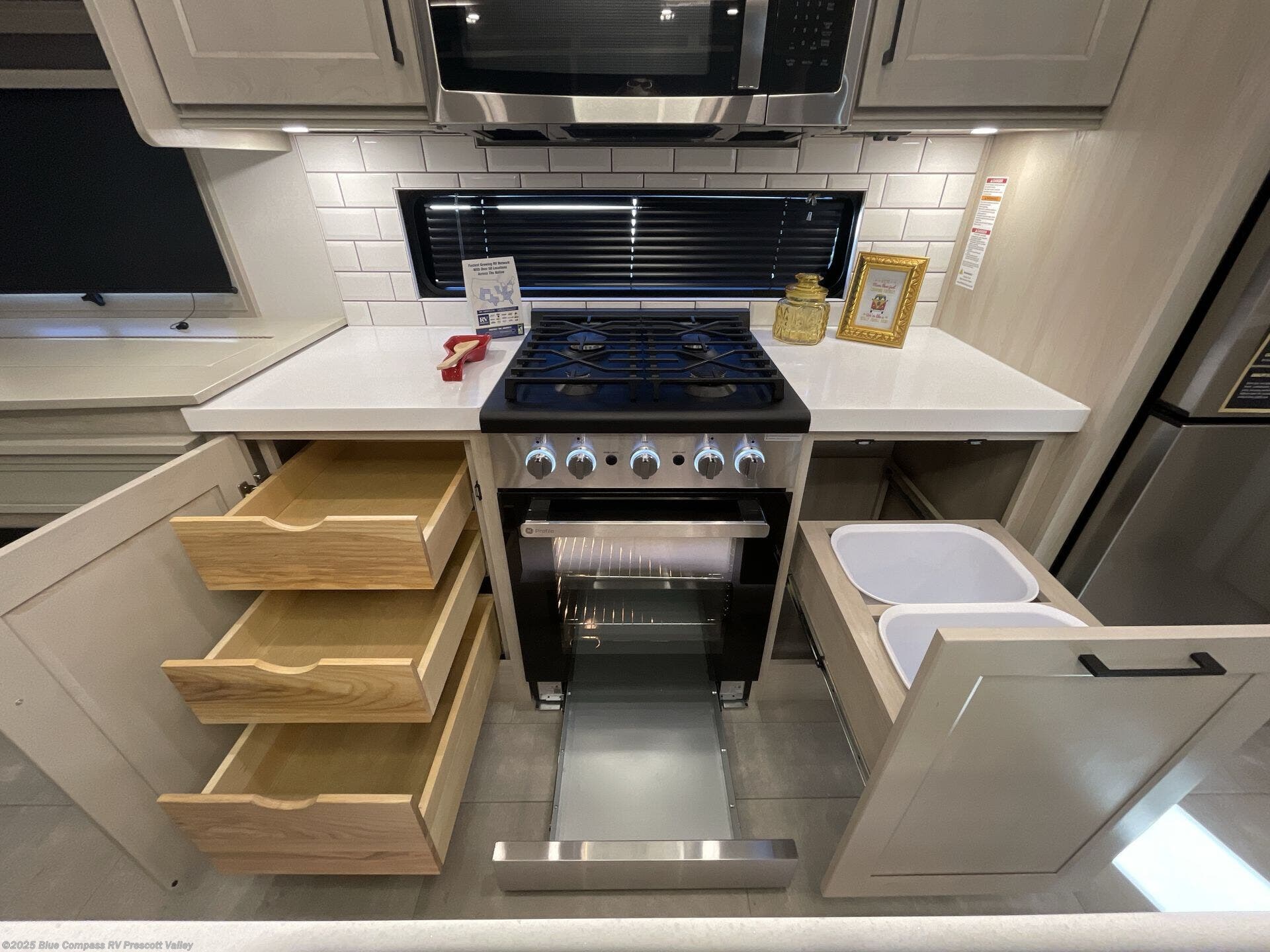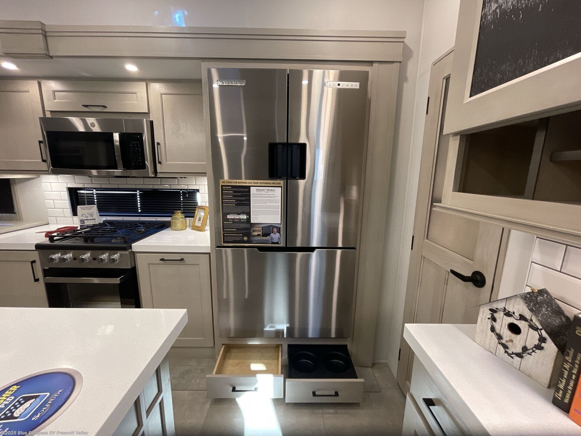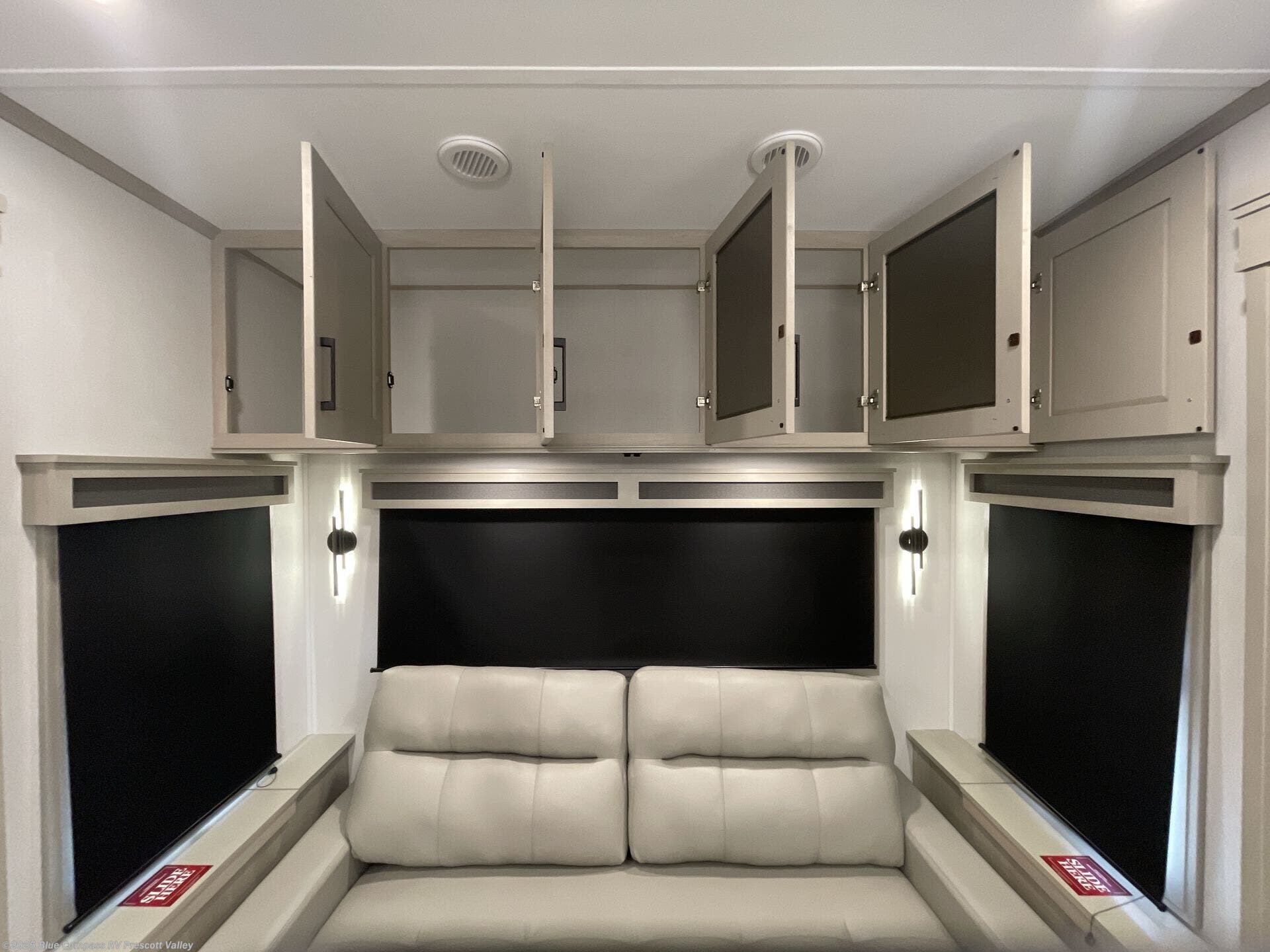 Traveling for long periods at a time is made easy with this gourmet kitchen that can feed your entire group a holiday meal! The professional-grade stainless steel cooktop with a built-in oven, microwave, 12V 20 cu. ft. refrigerator, and a kitchen island offers everything you will need to enjoy cooking for your family and guests. There is abundant storage throughout multiple overhead cabinets, a kitchen pantry and hutch, a bath linen cabinet for your towels, and in the front master bedroom which features a large closet. In the bedroom there is also a queen bed slide for added space to sleep comfortable at night, or you may choose an optional king bed if you enjoy more space. You will also find a closet with washer/dryer prep, large wardrobe, a clothes hamper plus a slide top dresser. Two nice awnings will provide outdoor living space keeping you protected from the sun and rain, and you can add an optional pull-out kitchen to enjoy convenient cooking outdoors as well.
