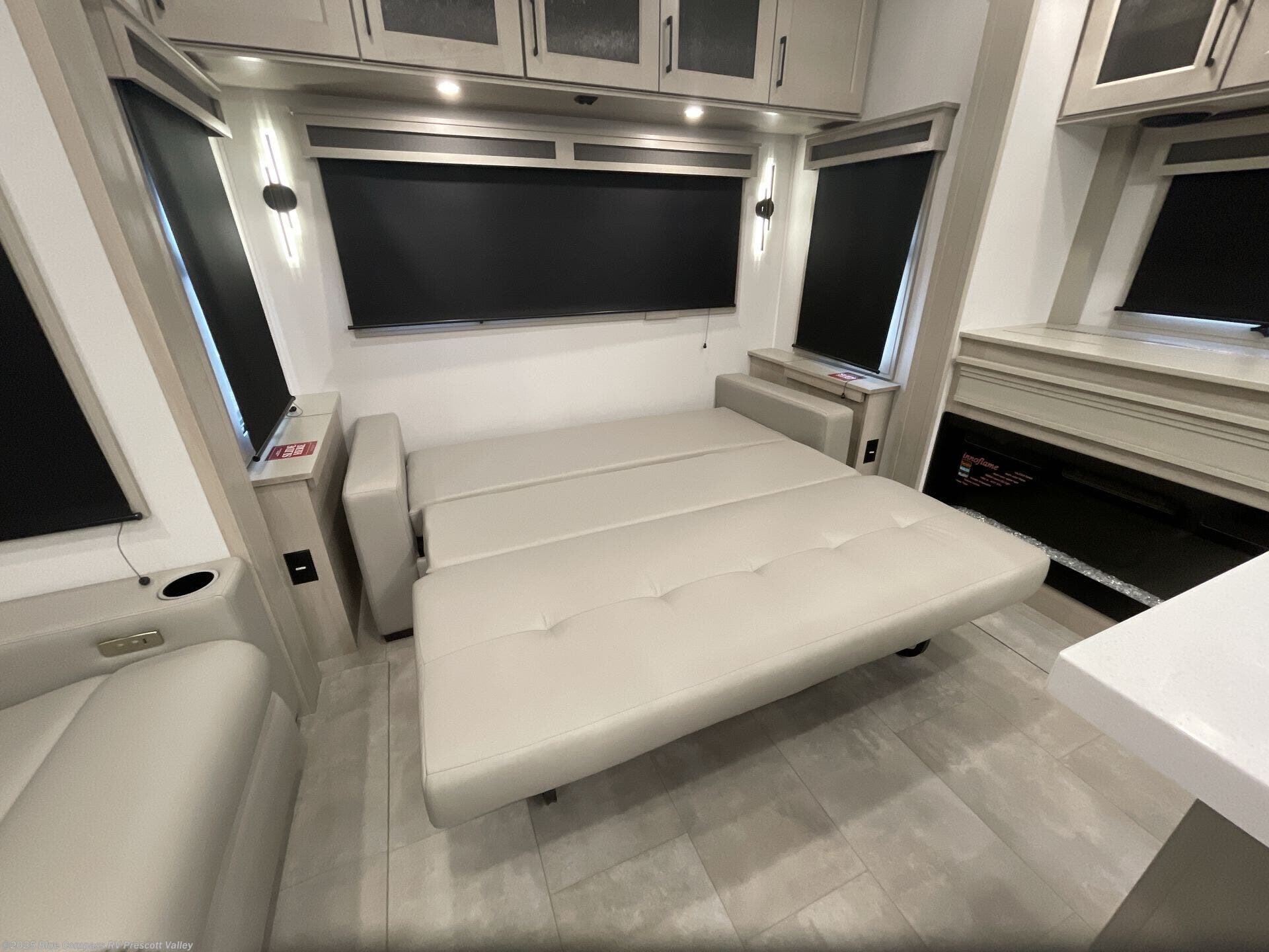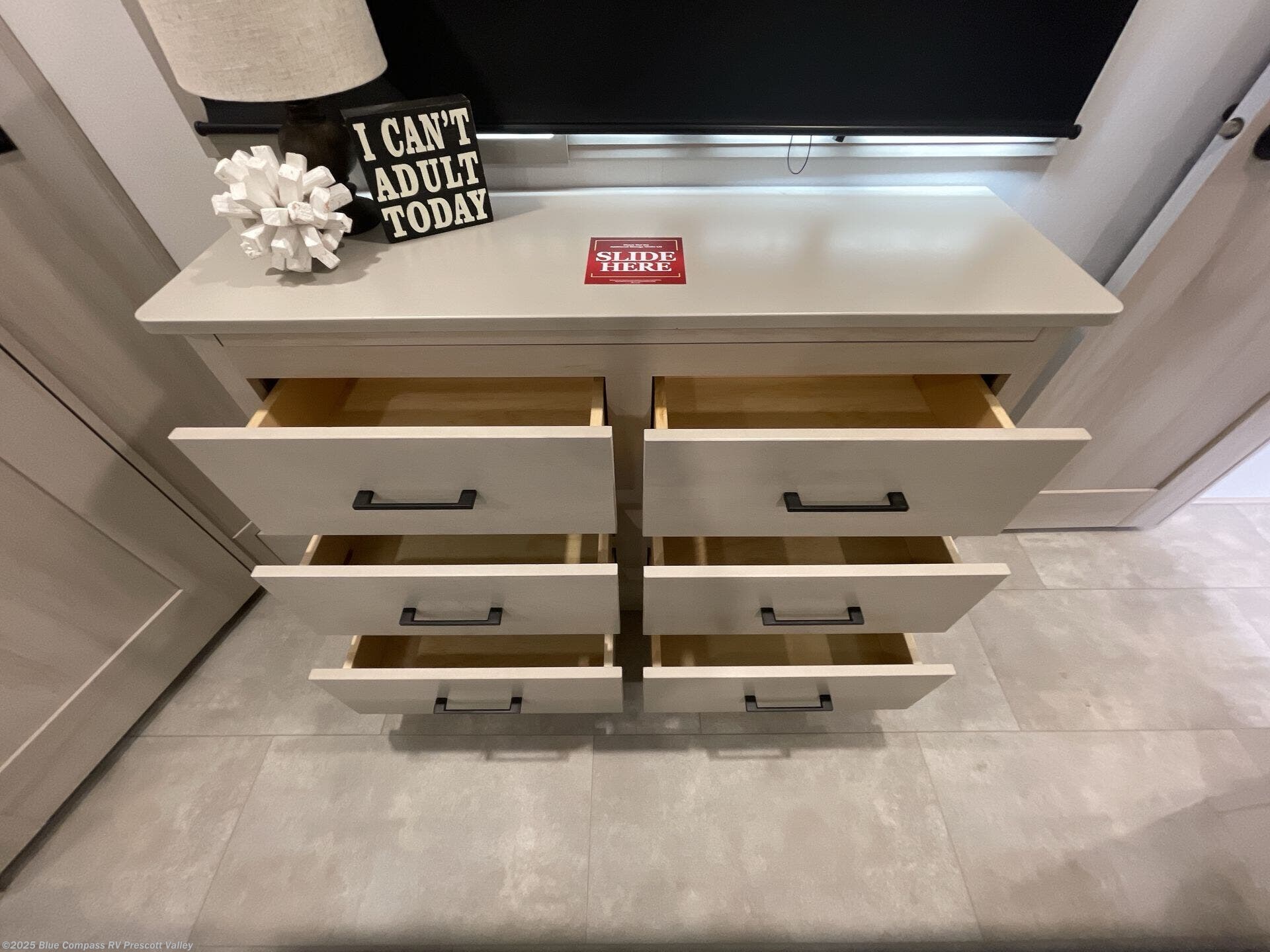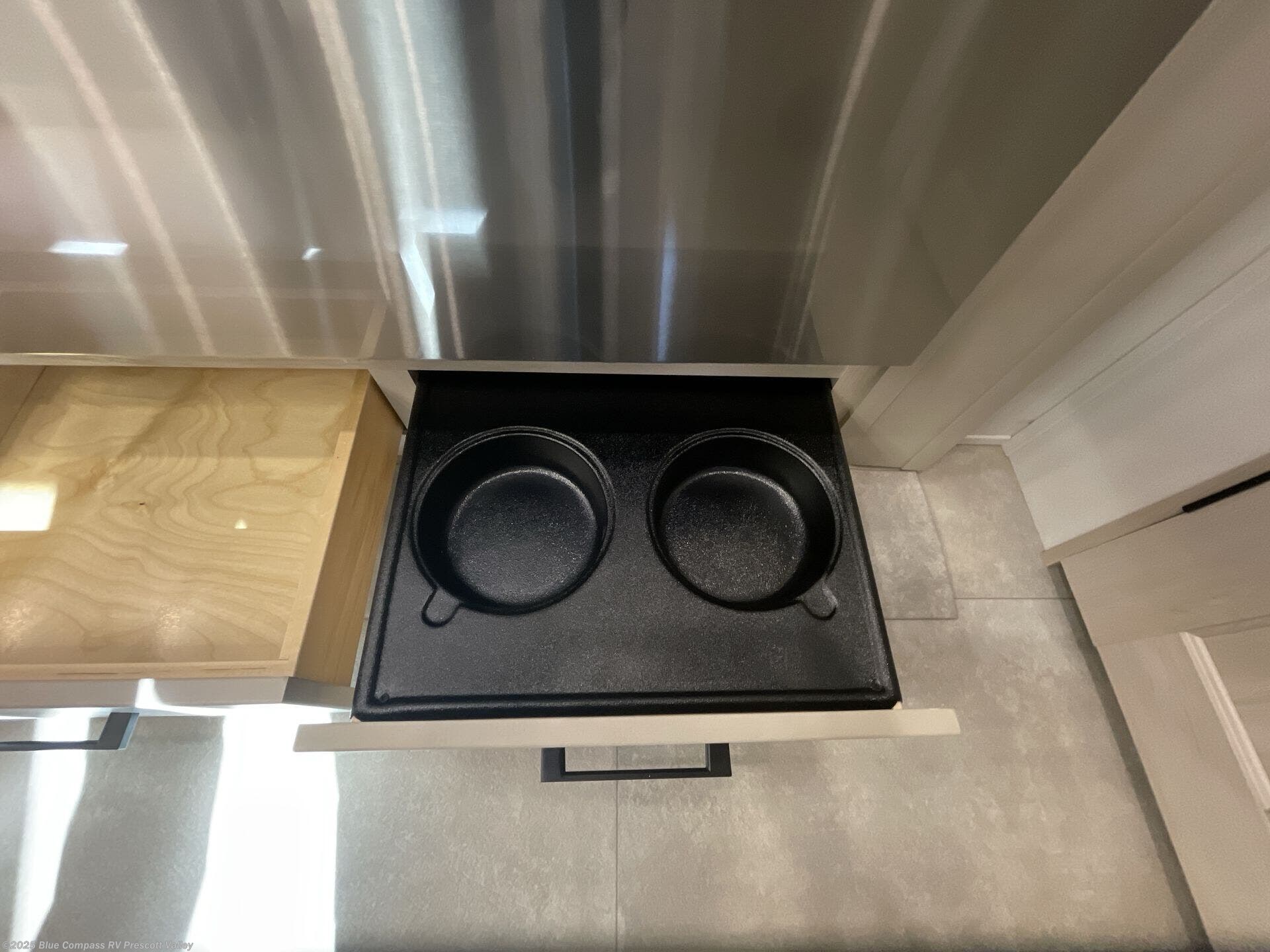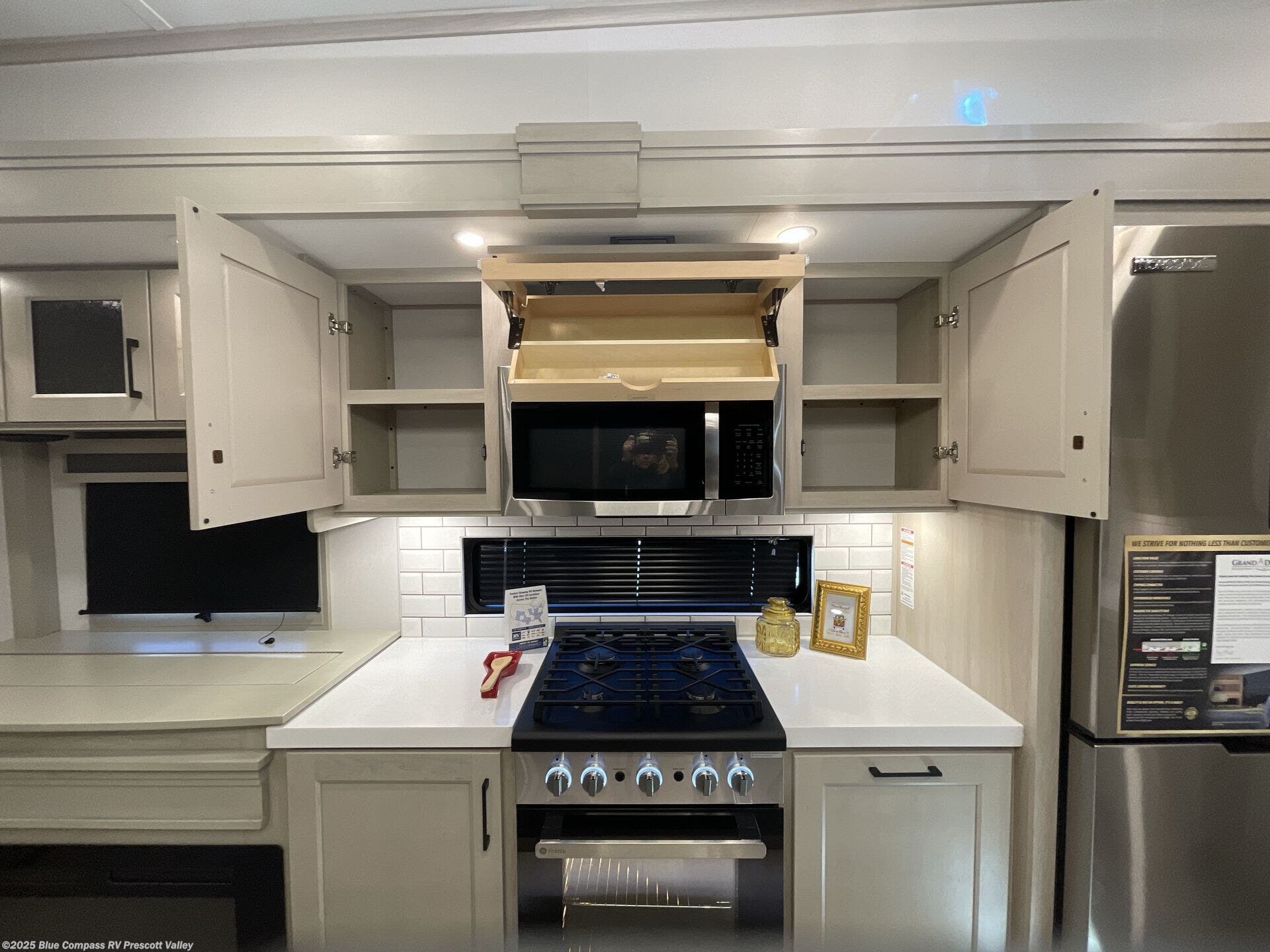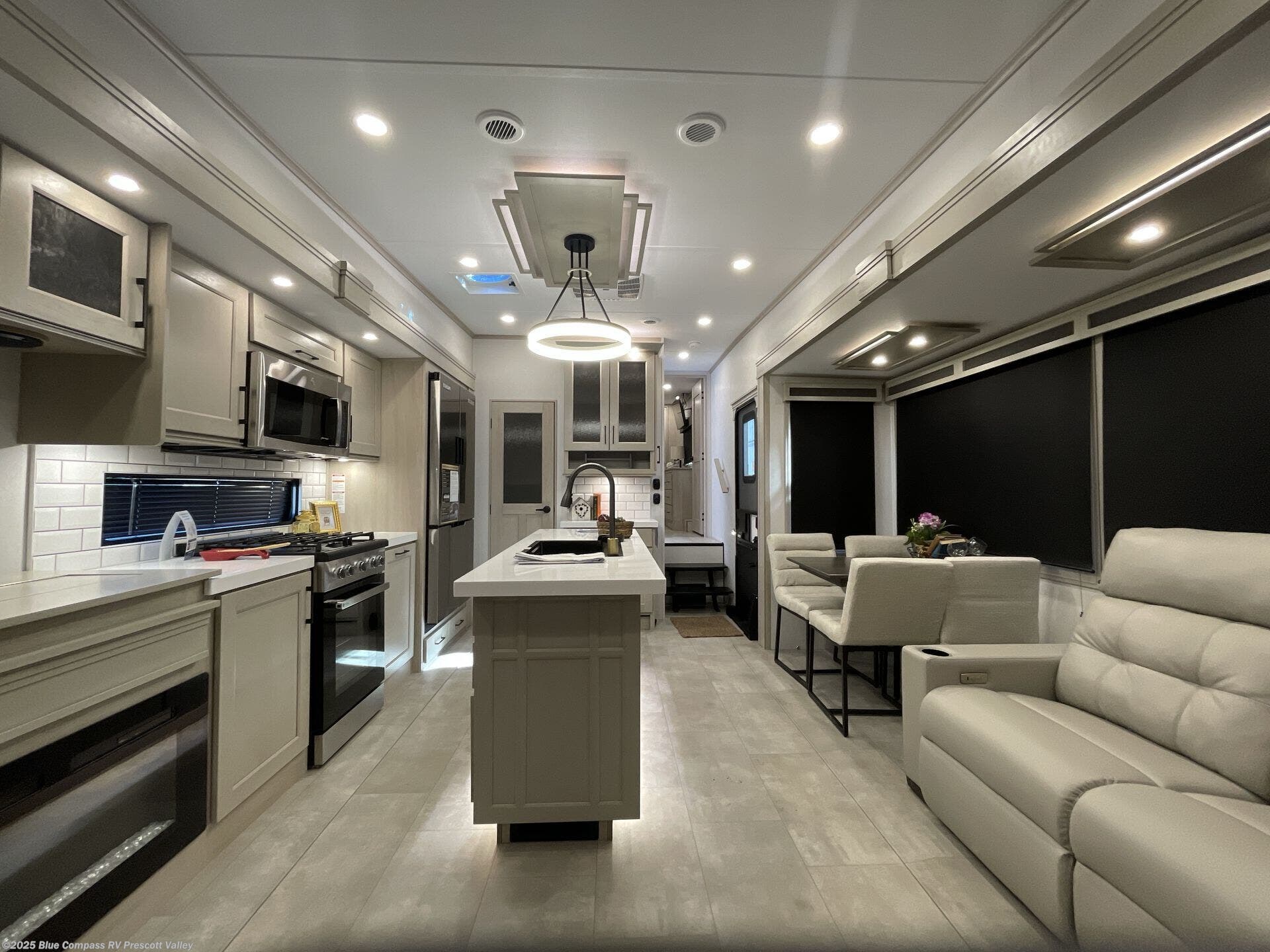 Traveling for long periods at a time is made easy with this gourmet kitchen that can feed your entire group a holiday meal! The professional-grade stainless steel cooktop with a built-in oven, microwave, 12V 20 cu. ft. refrigerator, and a kitchen island offers everything you will need to enjoy cooking for your family and guests. There is abundant storage throughout multiple overhead cabinets, a kitchen pantry and hutch, a bath linen cabinet for your towels, and in the front master bedroom which features a large closet. In the bedroom there is also a queen bed slide for added space to sleep comfortable at night, or you may choose an optional king bed if you enjoy more space. You will also find a closet with washer/dryer prep, large wardrobe, a clothes hamper plus a slide top dresser. Two nice awnings will provide outdoor living space keeping you protected from the sun and rain, and you can add an optional pull-out kitchen to enjoy convenient cooking outdoors as well.
