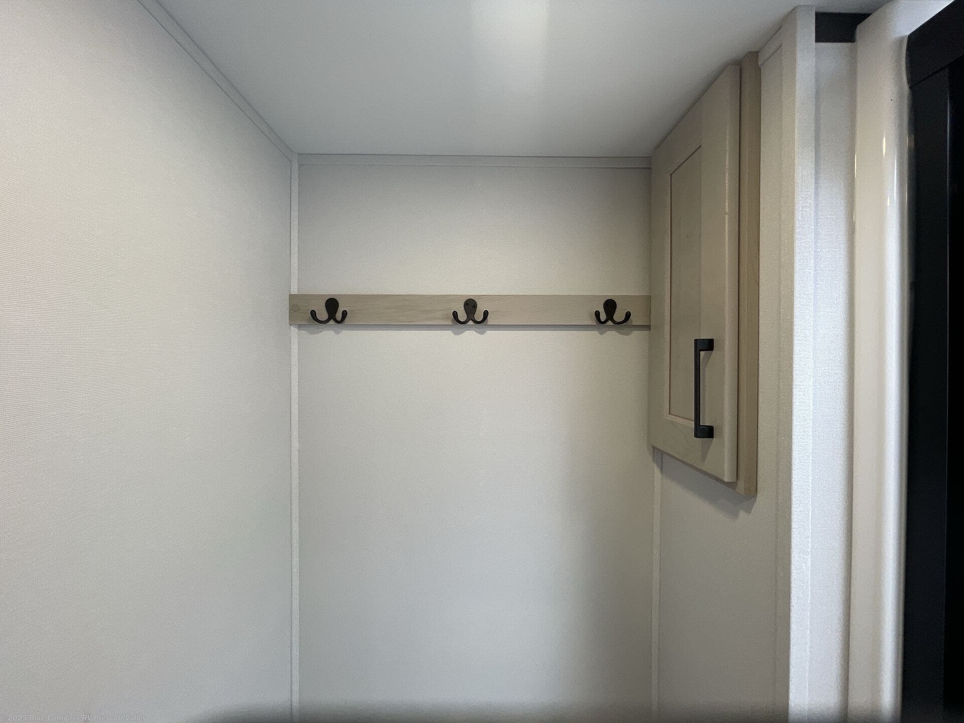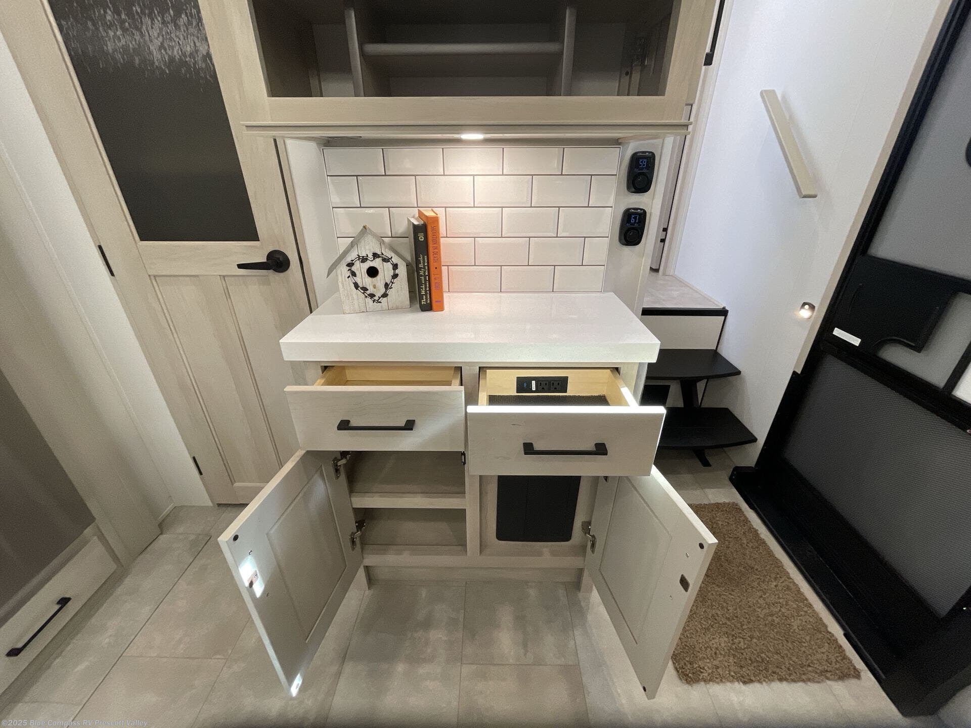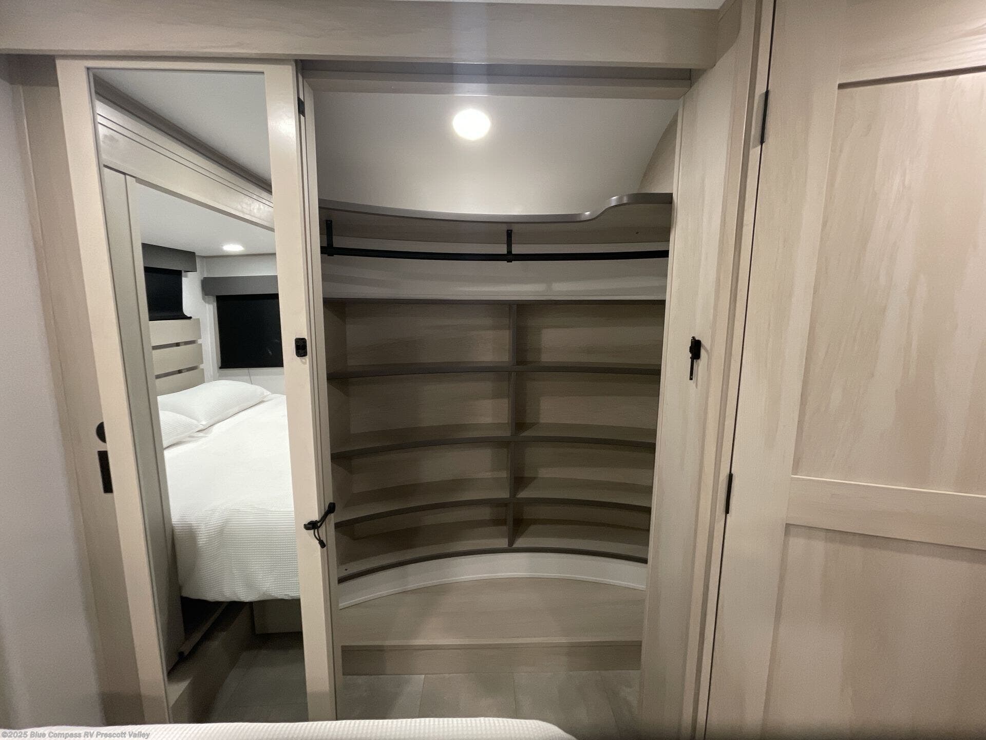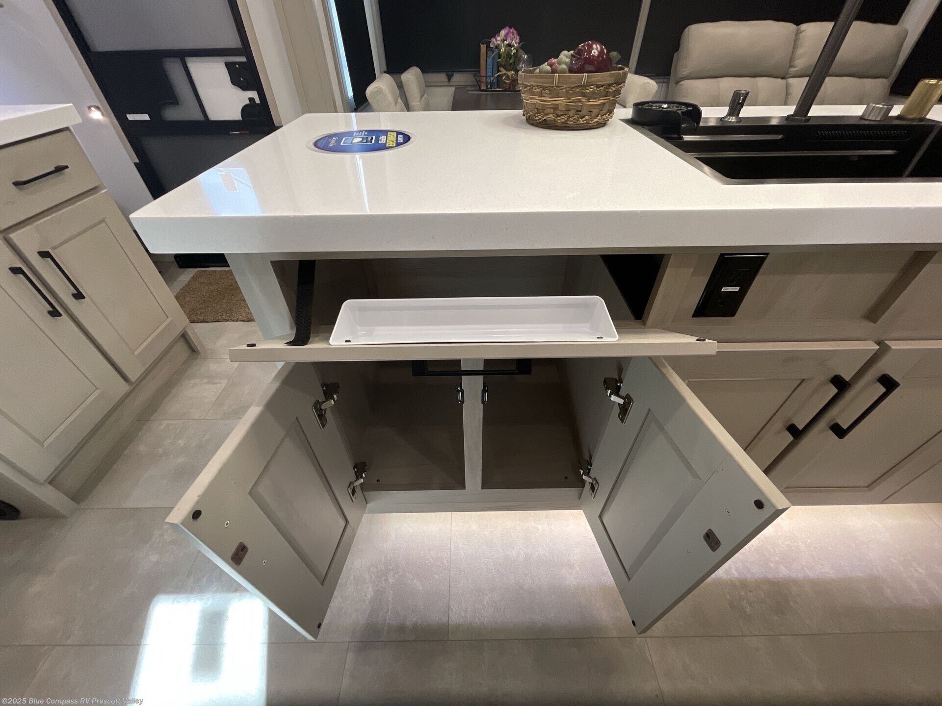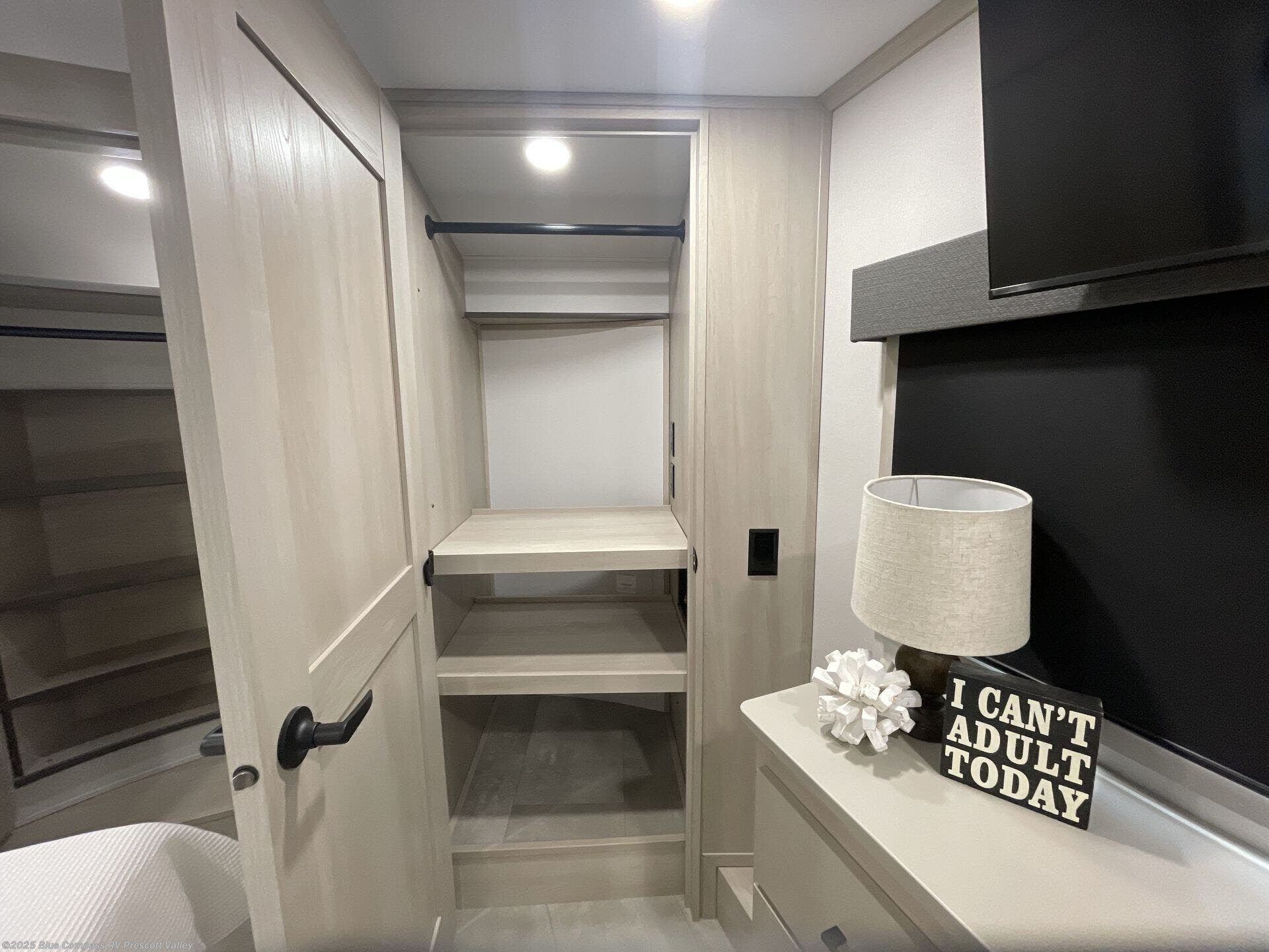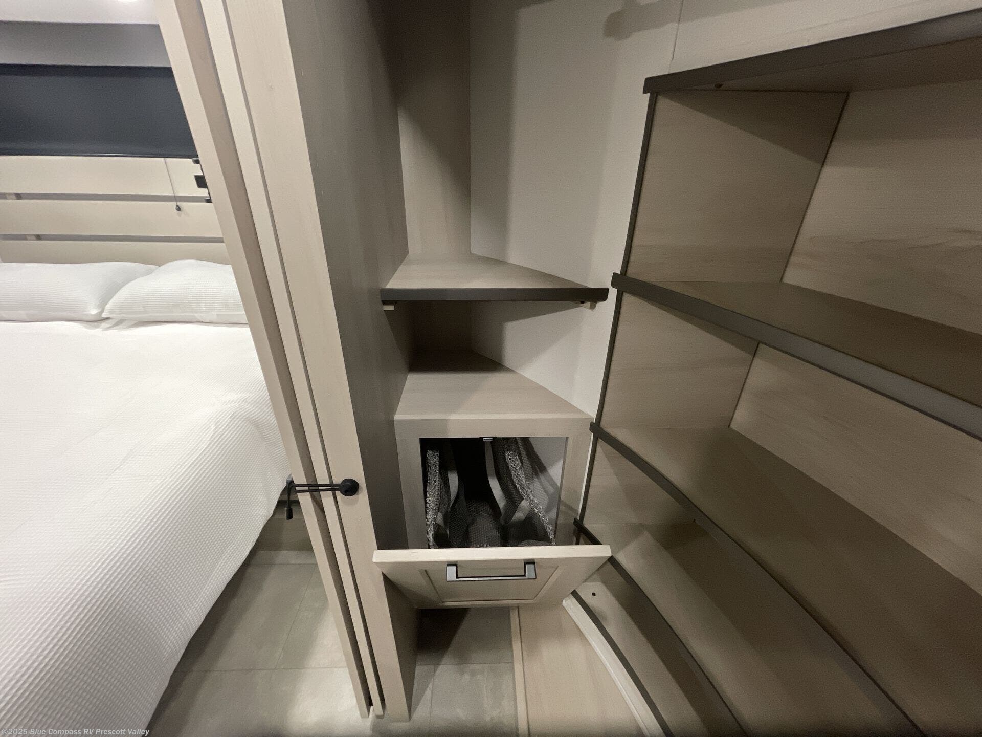 Traveling for long periods at a time is made easy with this gourmet kitchen that can feed your entire group a holiday meal! The professional-grade stainless steel cooktop with a built-in oven, microwave, 12V 20 cu. ft. refrigerator, and a kitchen island offers everything you will need to enjoy cooking for your family and guests. There is abundant storage throughout multiple overhead cabinets, a kitchen pantry and hutch, a bath linen cabinet for your towels, and in the front master bedroom which features a large closet. In the bedroom there is also a queen bed slide for added space to sleep comfortable at night, or you may choose an optional king bed if you enjoy more space. You will also find a closet with washer/dryer prep, large wardrobe, a clothes hamper plus a slide top dresser. Two nice awnings will provide outdoor living space keeping you protected from the sun and rain, and you can add an optional pull-out kitchen to enjoy convenient cooking outdoors as well.