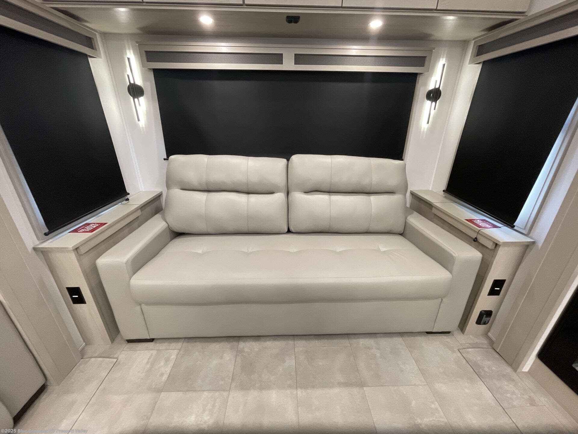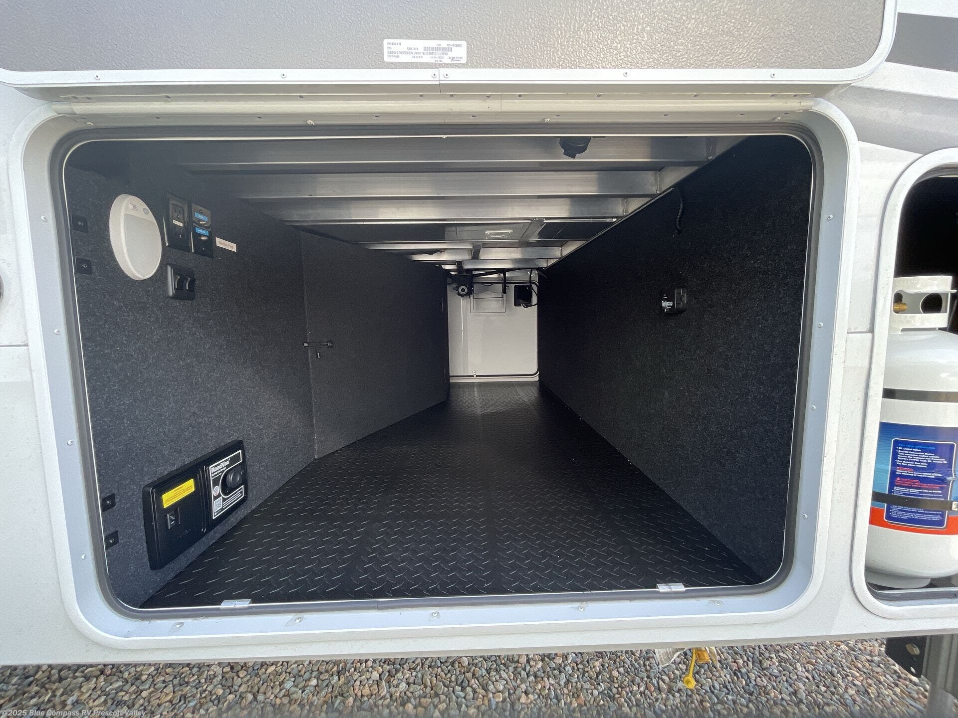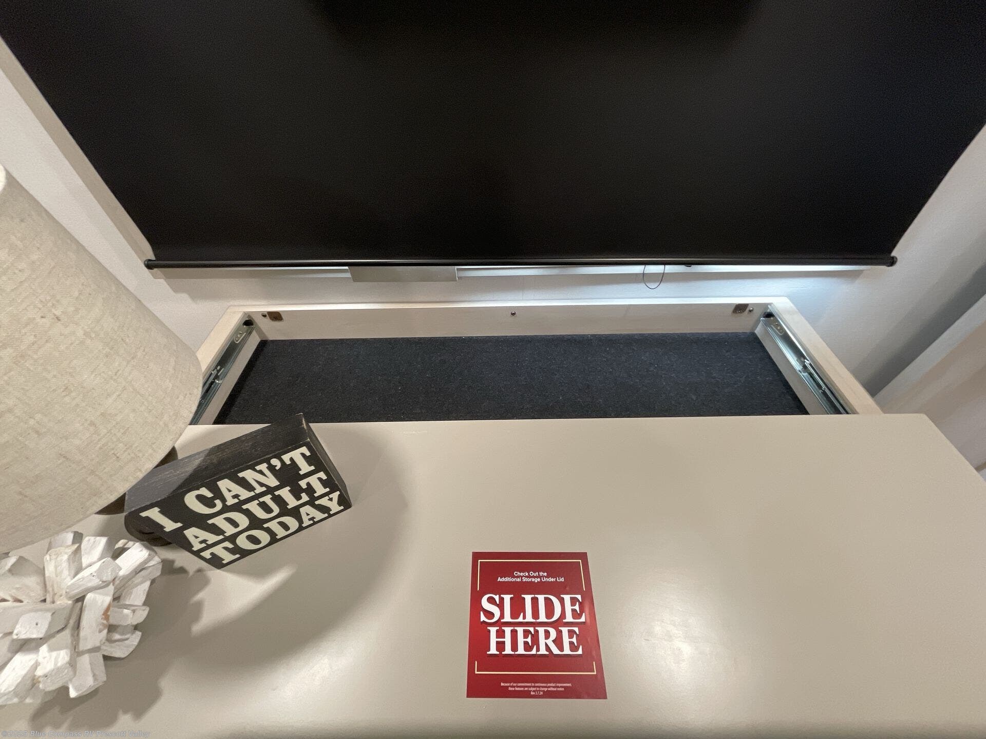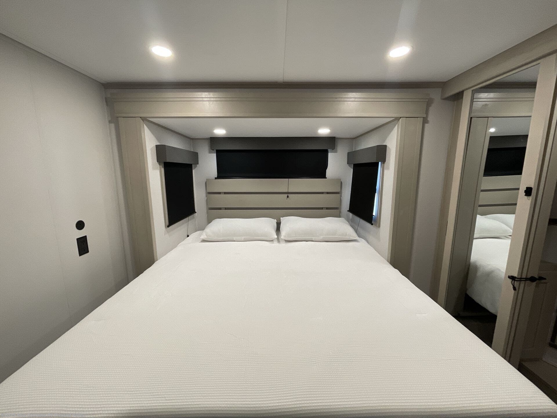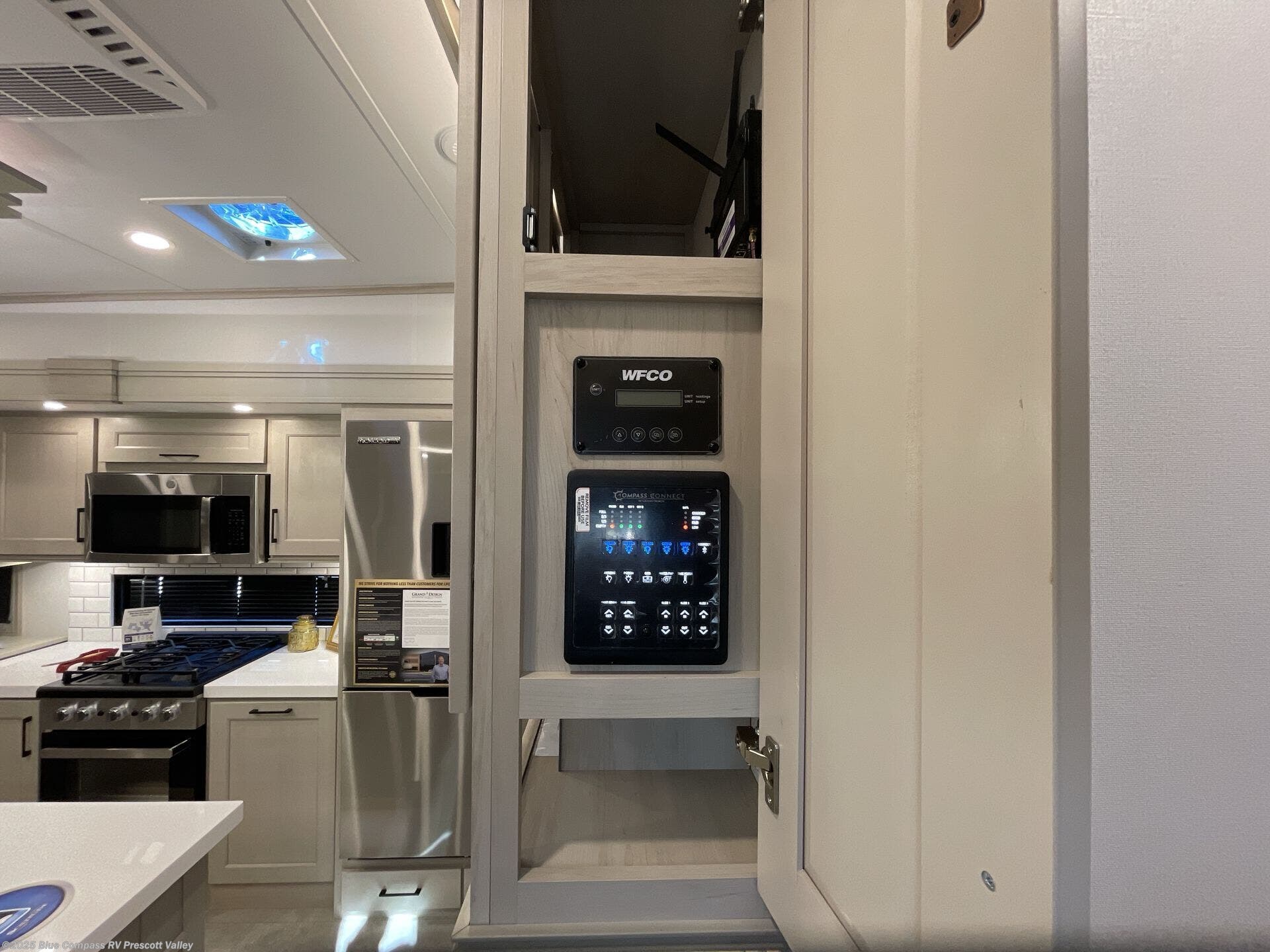 Traveling for long periods at a time is made easy with this gourmet kitchen that can feed your entire group a holiday meal! The professional-grade stainless steel cooktop with a built-in oven, microwave, 12V 20 cu. ft. refrigerator, and a kitchen island offers everything you will need to enjoy cooking for your family and guests. There is abundant storage throughout multiple overhead cabinets, a kitchen pantry and hutch, a bath linen cabinet for your towels, and in the front master bedroom which features a large closet. In the bedroom there is also a queen bed slide for added space to sleep comfortable at night, or you may choose an optional king bed if you enjoy more space. You will also find a closet with washer/dryer prep, large wardrobe, a clothes hamper plus a slide top dresser. Two nice awnings will provide outdoor living space keeping you protected from the sun and rain, and you can add an optional pull-out kitchen to enjoy convenient cooking outdoors as well.
