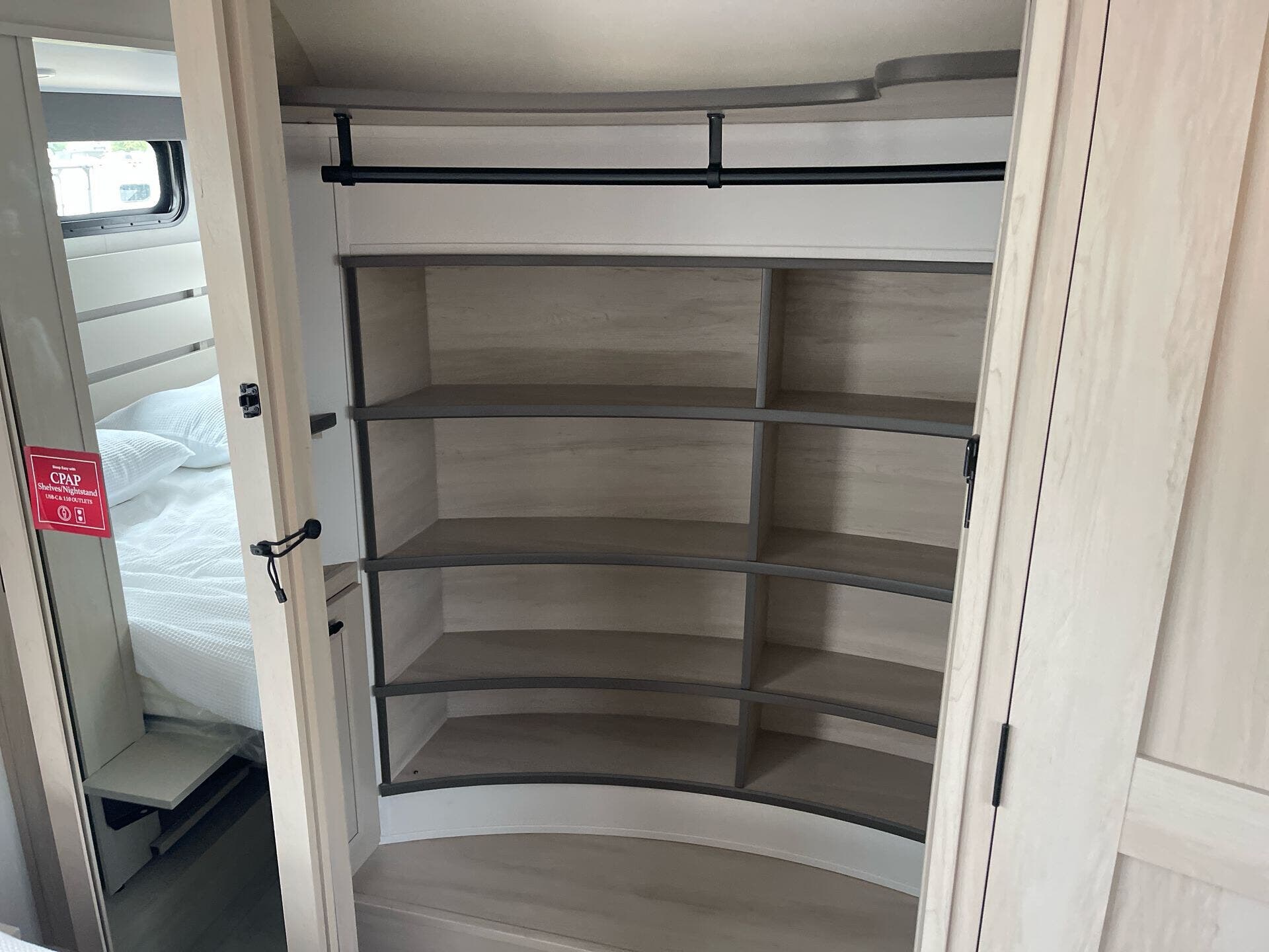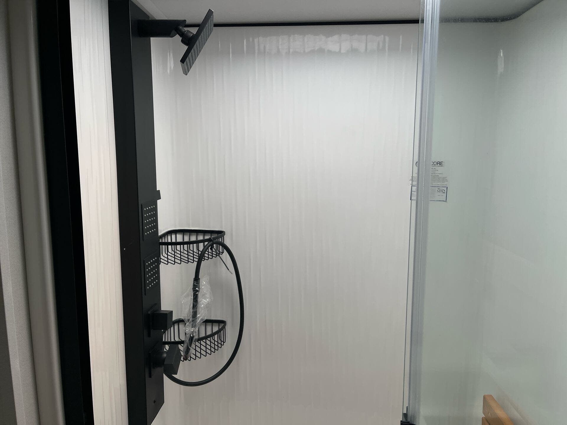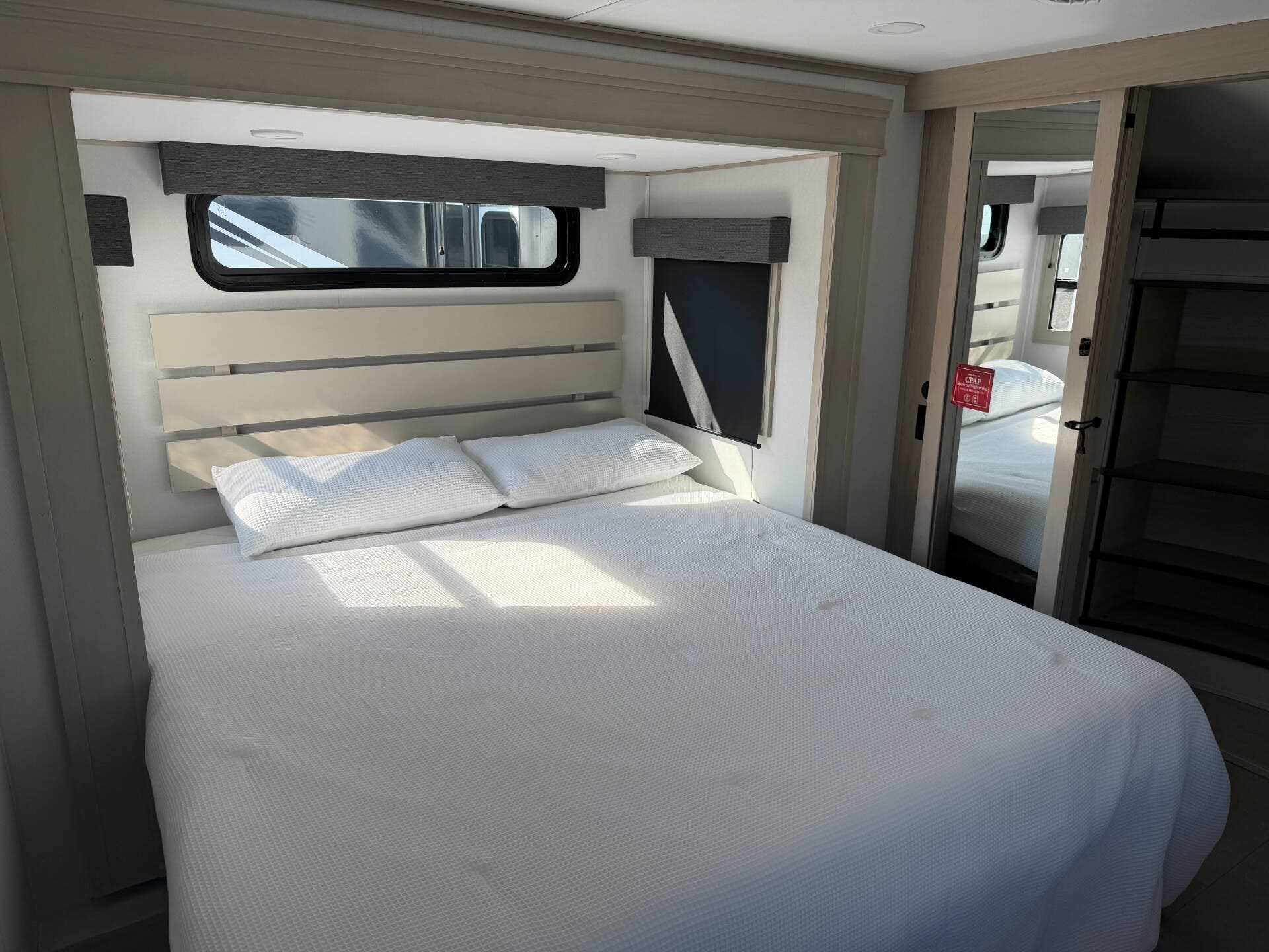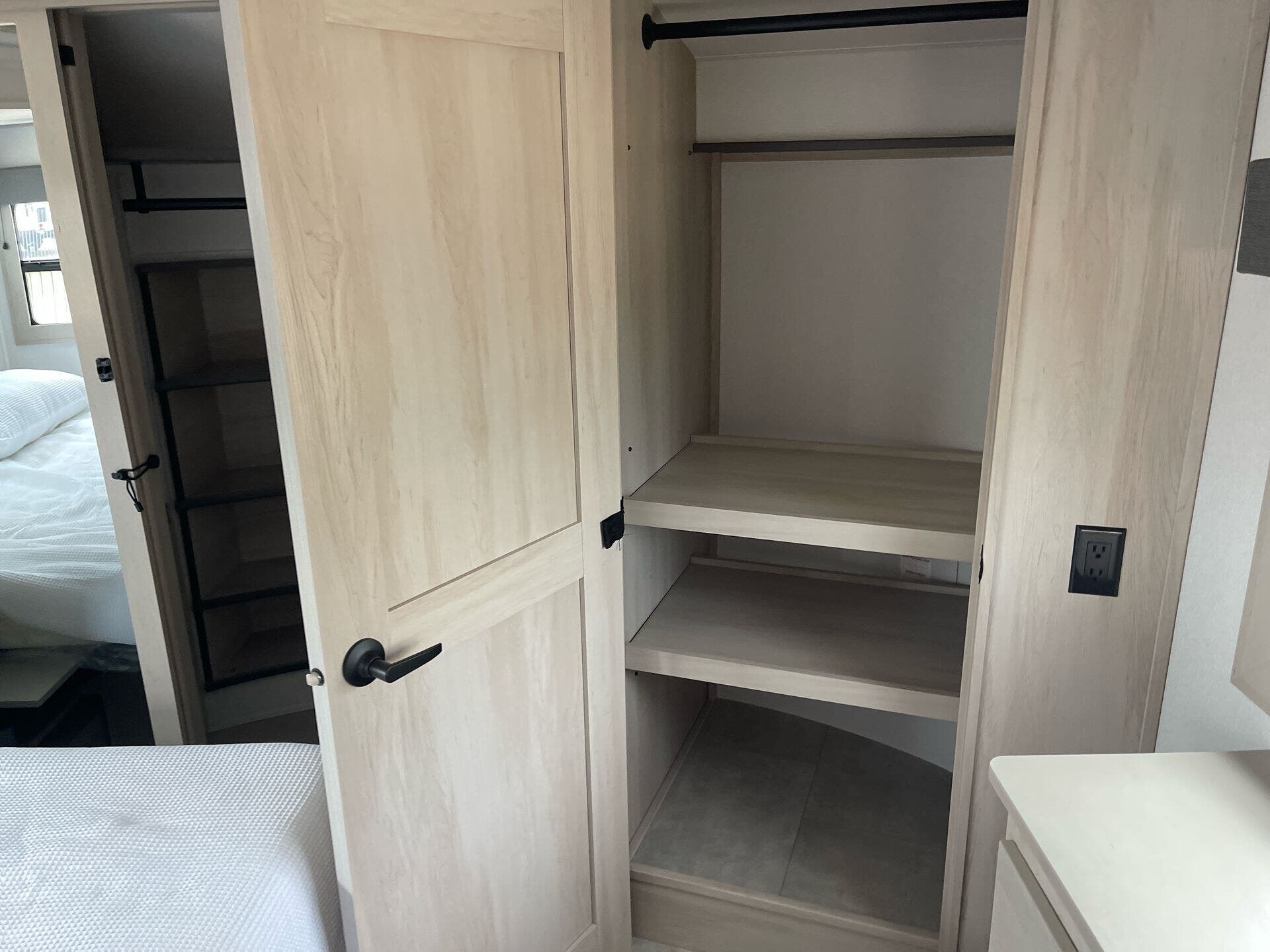Forward, the private master suite features a queen bed (king optional), wardrobe, dresser with TV prep, and washer/dryer setup . All-season living is supported by the Weather-Tek Package: frameless windows, high-capacity furnace, tankless water heater, fully enclosed underbelly, heated tanks and storage, plus dual 16′ &?10′ awnings.