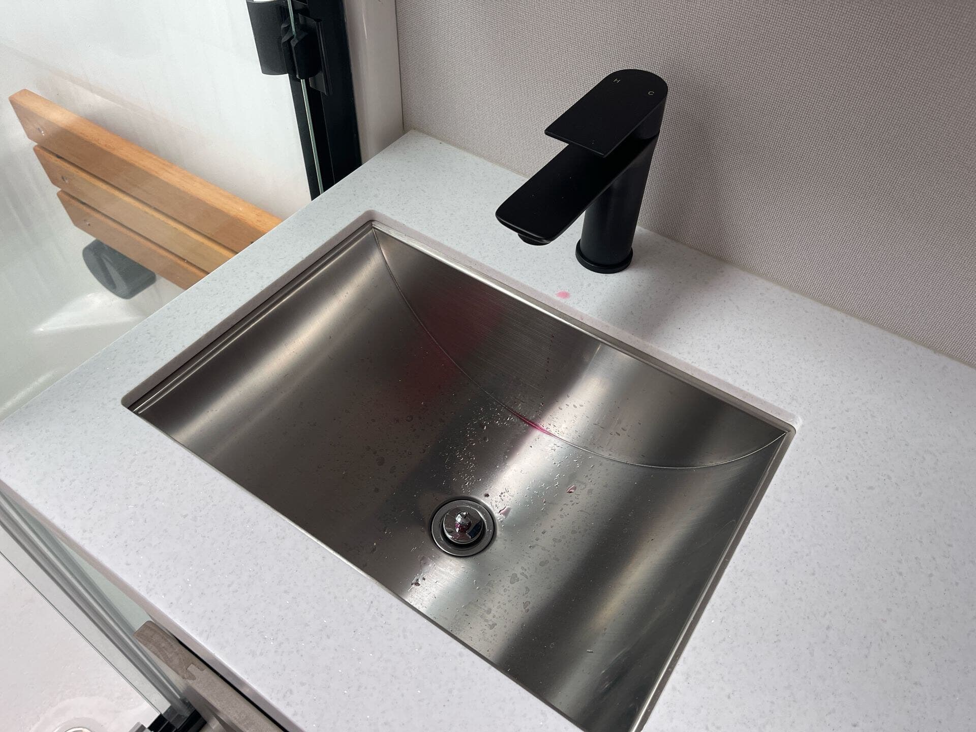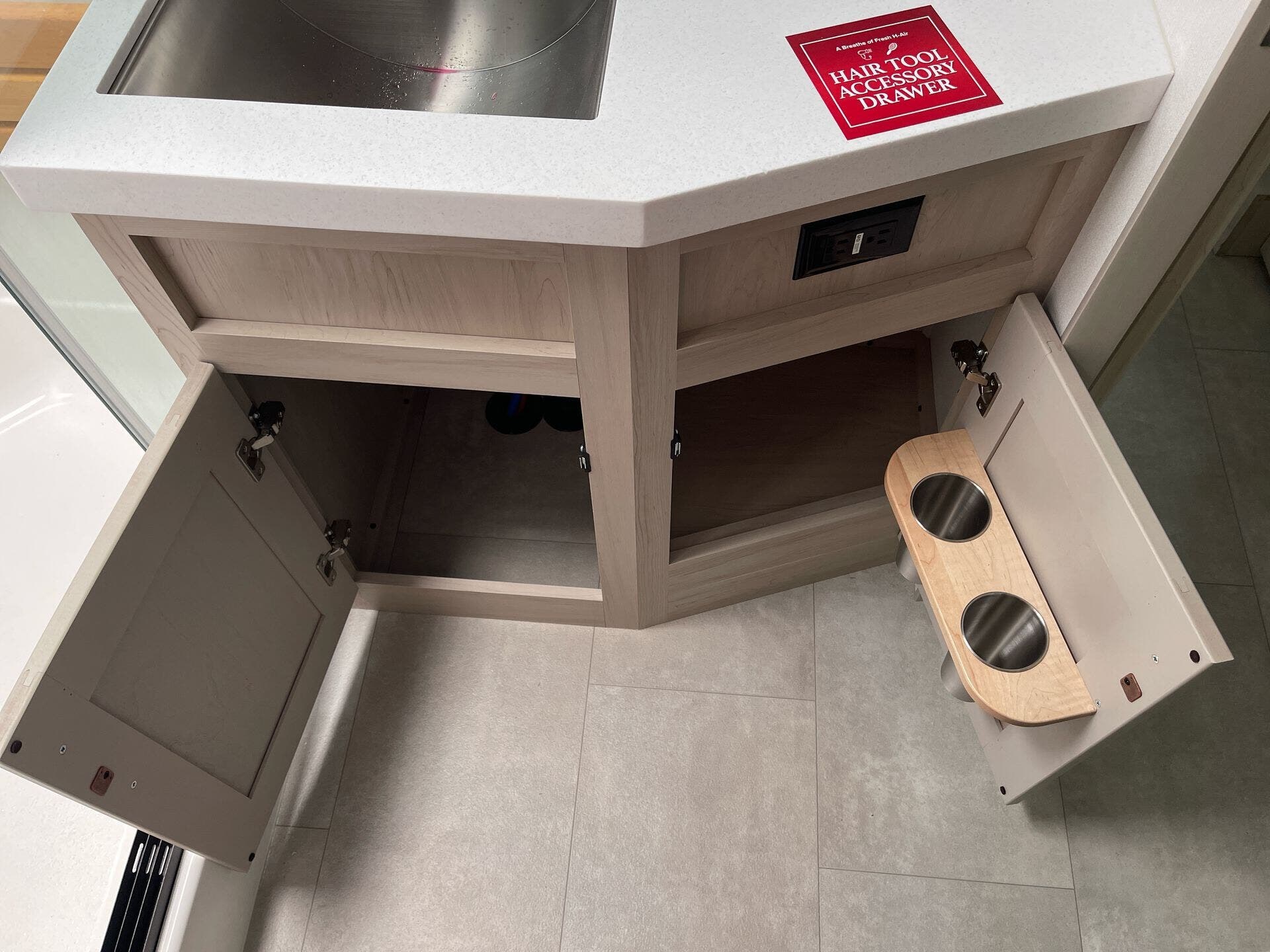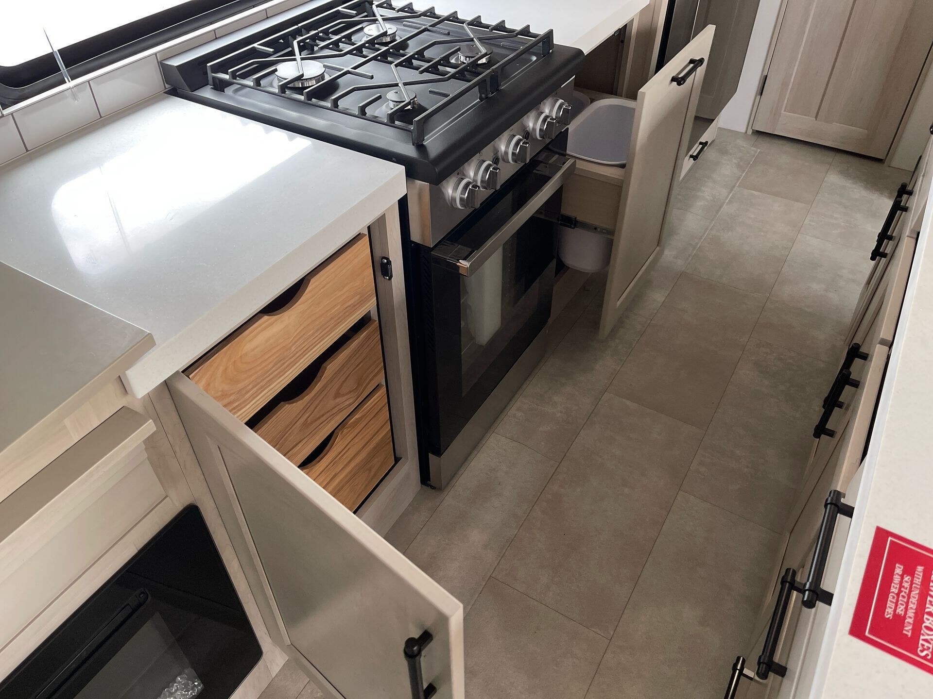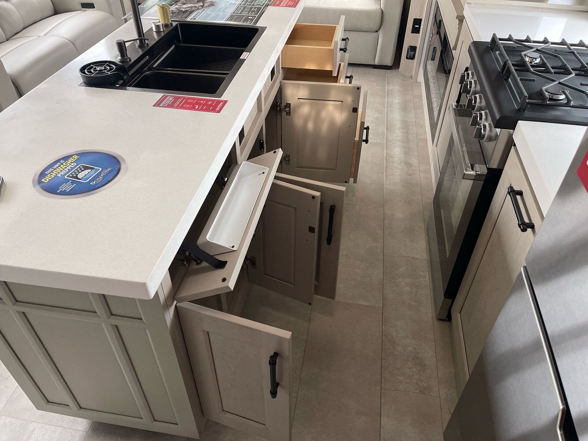 Mid-coach, you’ll find a large kitchen island with solid-surface countertops, stainless sink, a 20?cu?ft fridge, residential-grade oven, pantry, and hutch—ideal for meal prep and hosting. The center bath comes with a 48″×30″ shower (with teak seat), vanity, skylight, and porcelain toilet for added convenience.