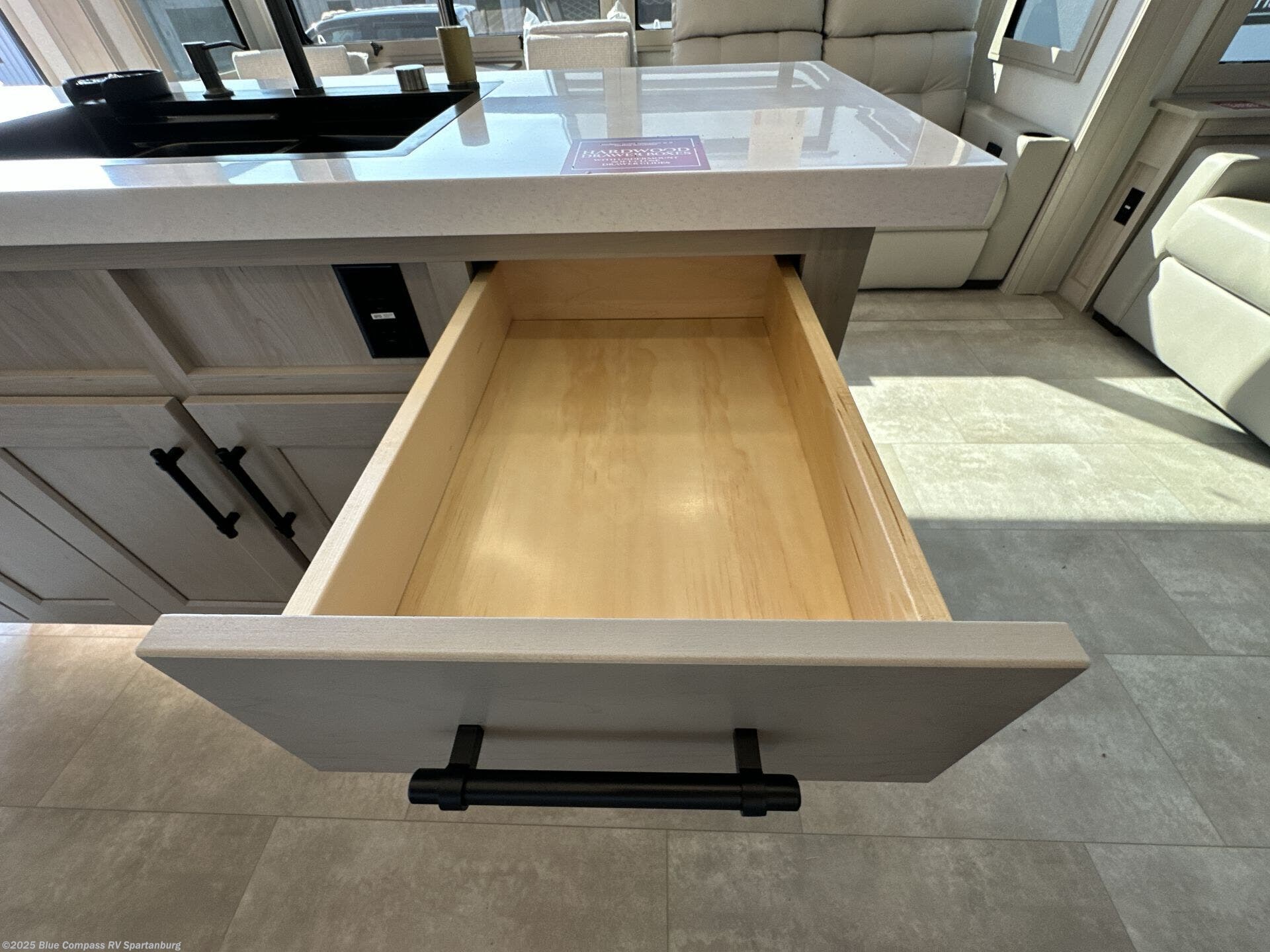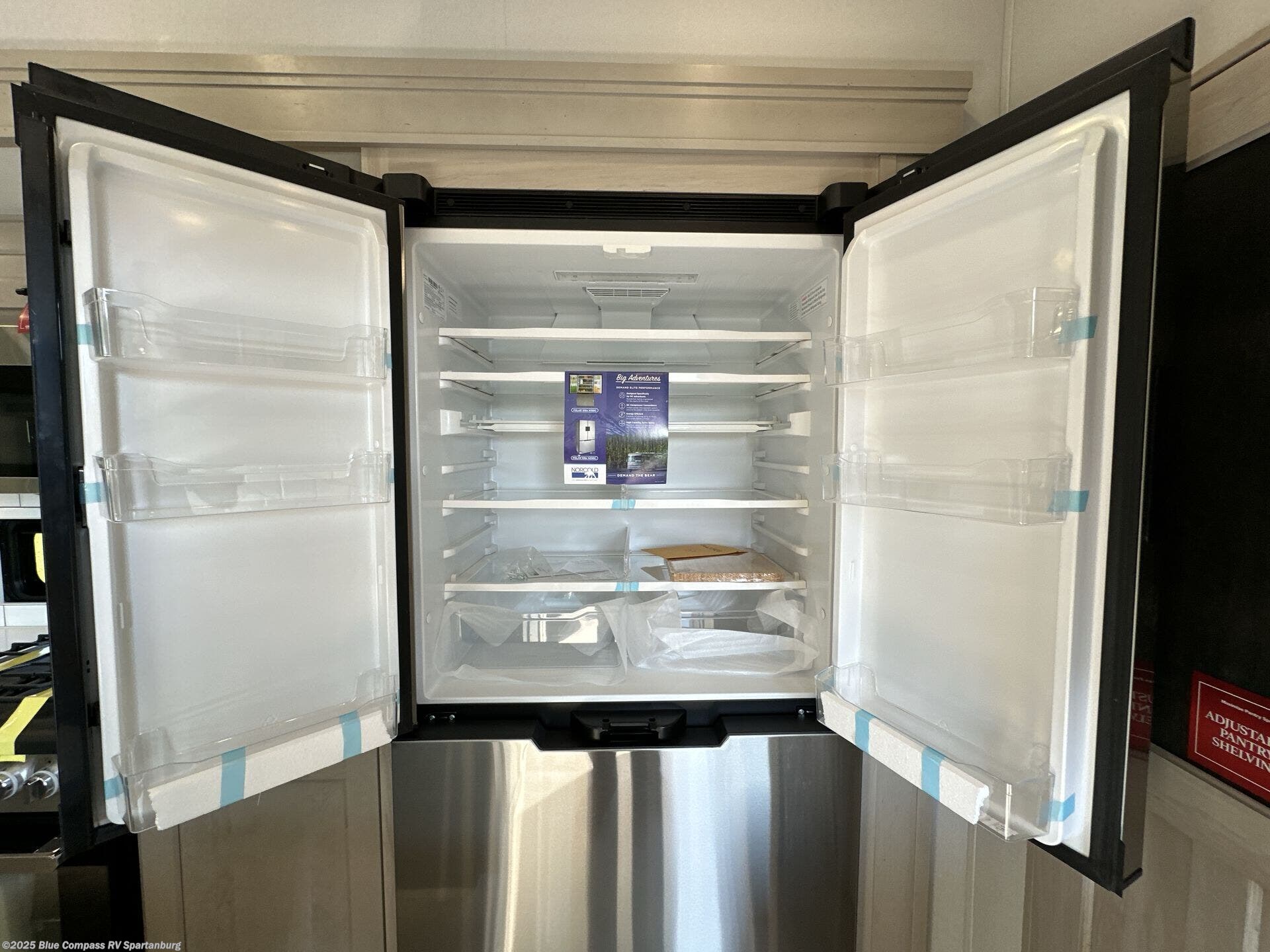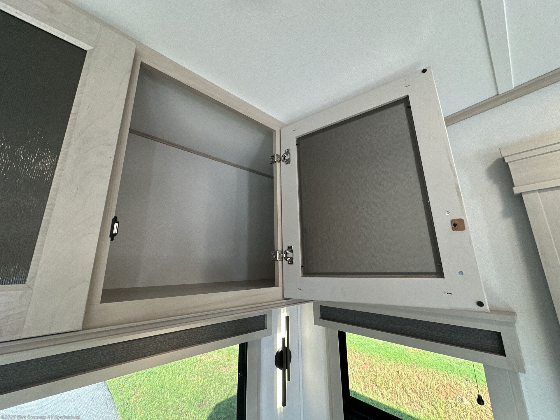 Traveling for long periods at a time is made easy with this gourmet kitchen that can feed your entire group a holiday meal! The professional-grade stainless steel cooktop with a built-in oven, microwave, 12V 20 cu. ft. refrigerator, and a kitchen island offers everything you will need to enjoy cooking for your family and guests. There is abundant storage throughout multiple overhead cabinets, a kitchen pantry and hutch, a bath linen cabinet for your towels, and in the front master bedroom which features a large closet. In the bedroom there is also a queen bed slide for added space to sleep comfortable at night, or you may choose an optional king bed if you enjoy more space. You will also find a closet with washer/dryer prep, large wardrobe, a clothes hamper plus a slide top dresser. Two nice awnings will provide outdoor living space keeping you protected from the sun and rain, and you can add an optional pull-out kitchen to enjoy convenient cooking outdoors as well.