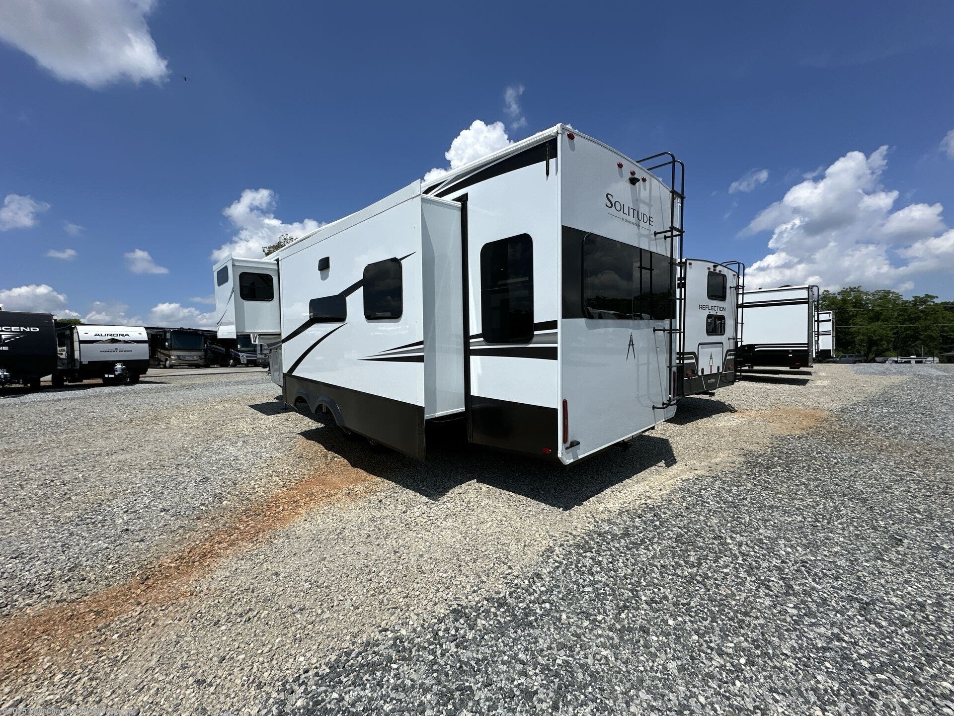 Each Solitude fifth wheel by Grand Design features a 101" wide-body construction, heavy duty 8,000 lb. axles, frameless tinted windows, and high-gloss gel coat sidewalls. You can camp year around thanks to the Weather-Tek Package that includes a 35K BTU high-capacity furnace, an all-in-one enclosed and heated utility center, and a fully enclosed underbelly with heated tanks and storage. Inside, you'll love the premium roller shades, hardwood cabinet doors, solid surface countertops, plus residential finishes throughout to make you truly feel at home. Each model also includes a MORryde CRE3000 suspension system, self adjusting brakes, and a MORryde pin box that will provide smooth towing from home to campground. Affordable luxury is possible with the Solitude fifth wheels; choose yours today!