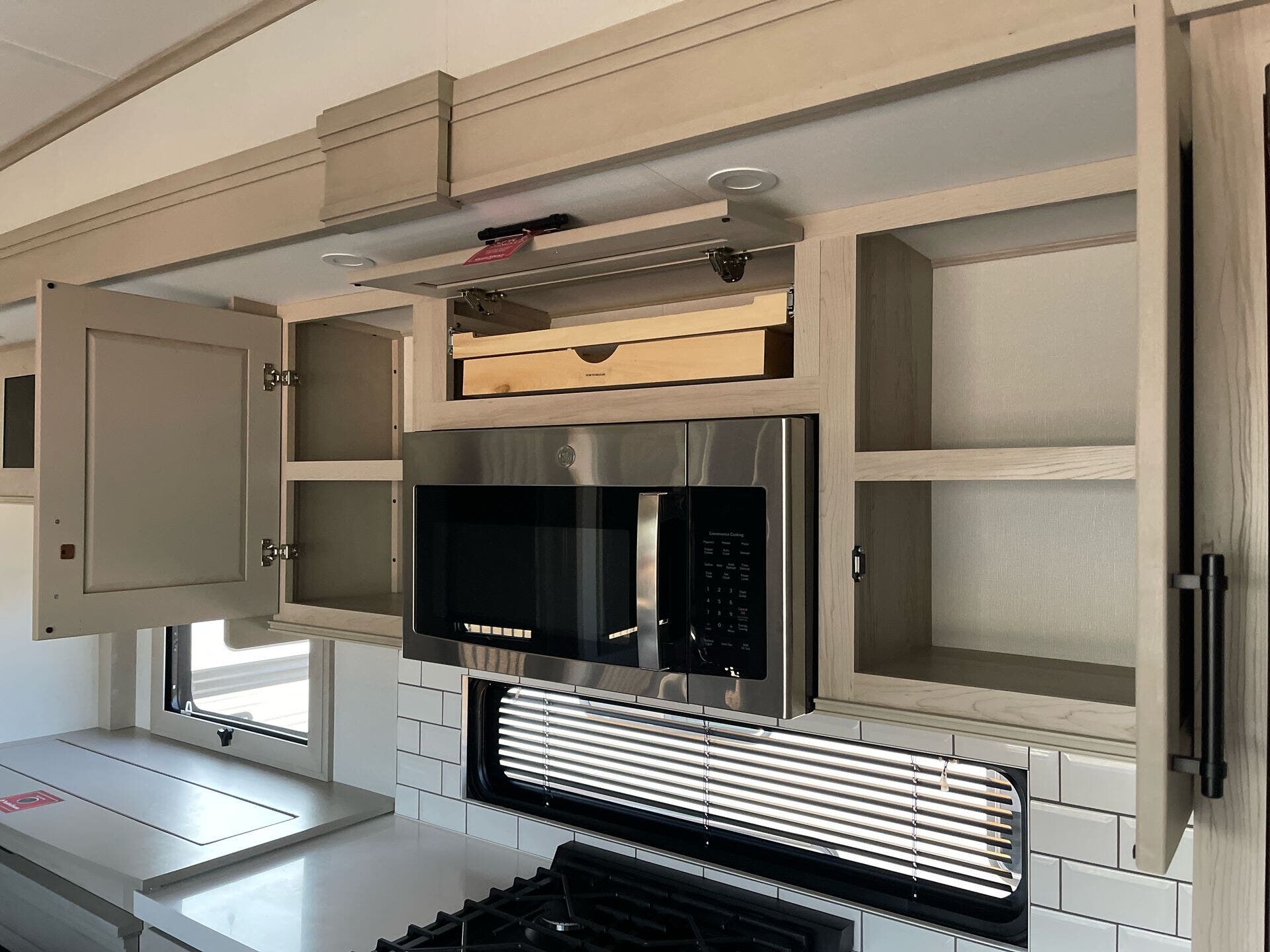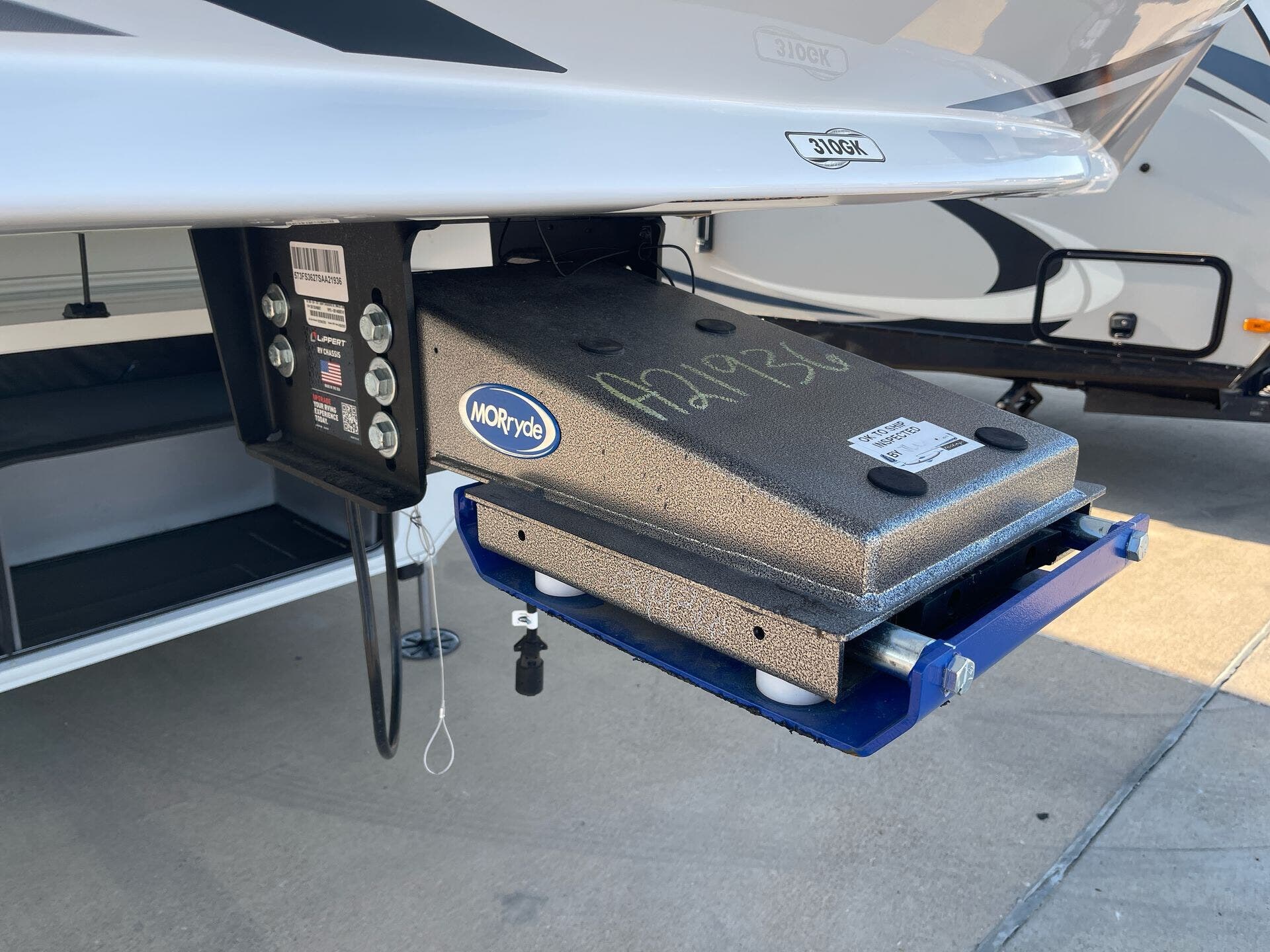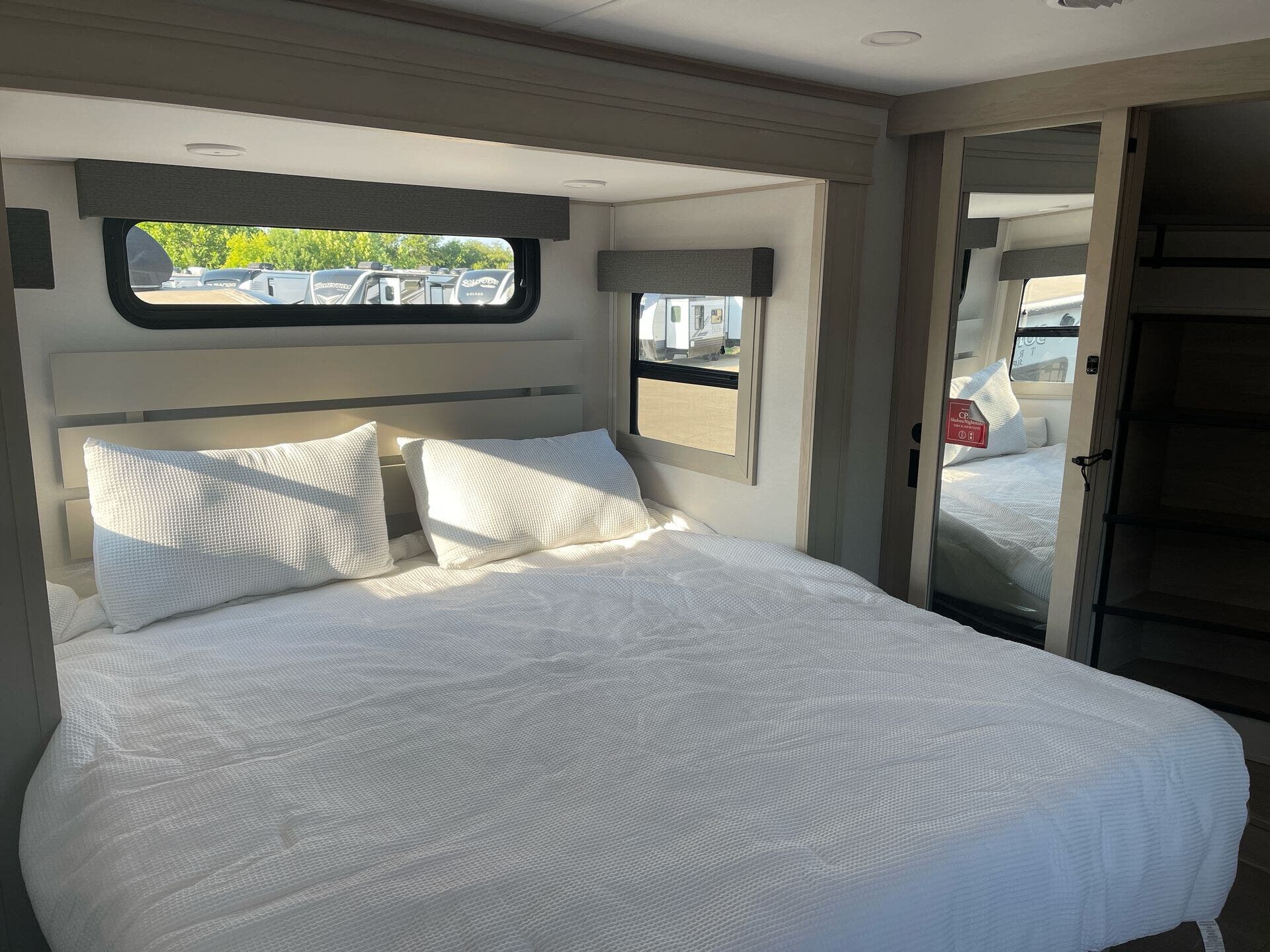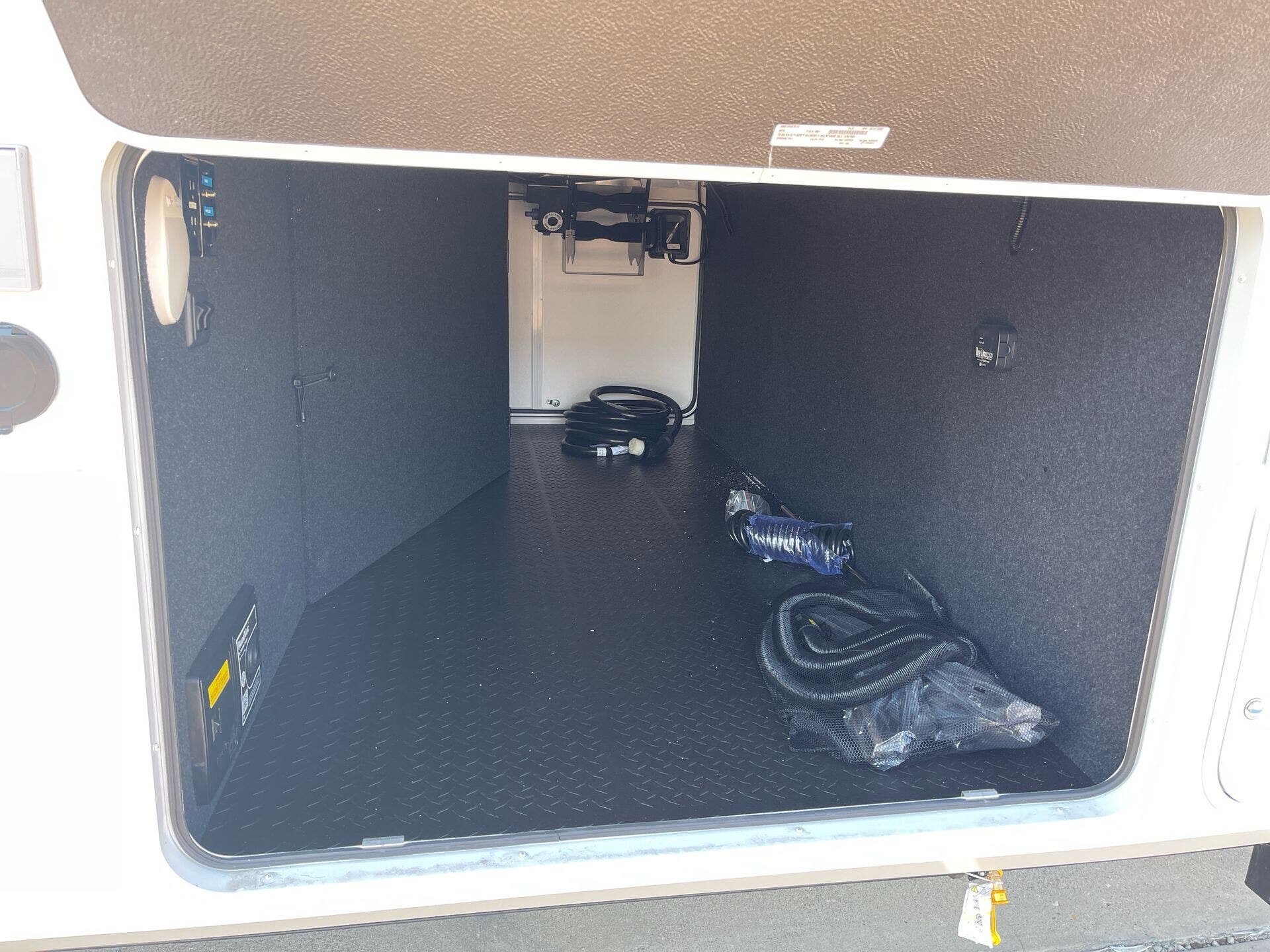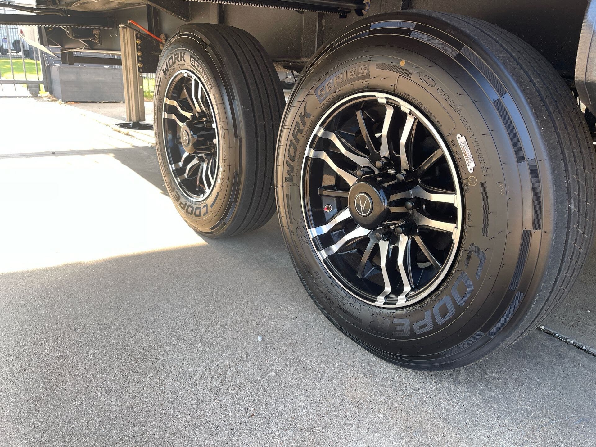 Its utility features include 81 gal fresh, 106 gal gray, and 53 gal black water tanks, two 14.2 gal propane tanks, 30,000 BTU dual heat-pump A/C, and a 35,000 BTU furnace with tankless on-demand water heating.