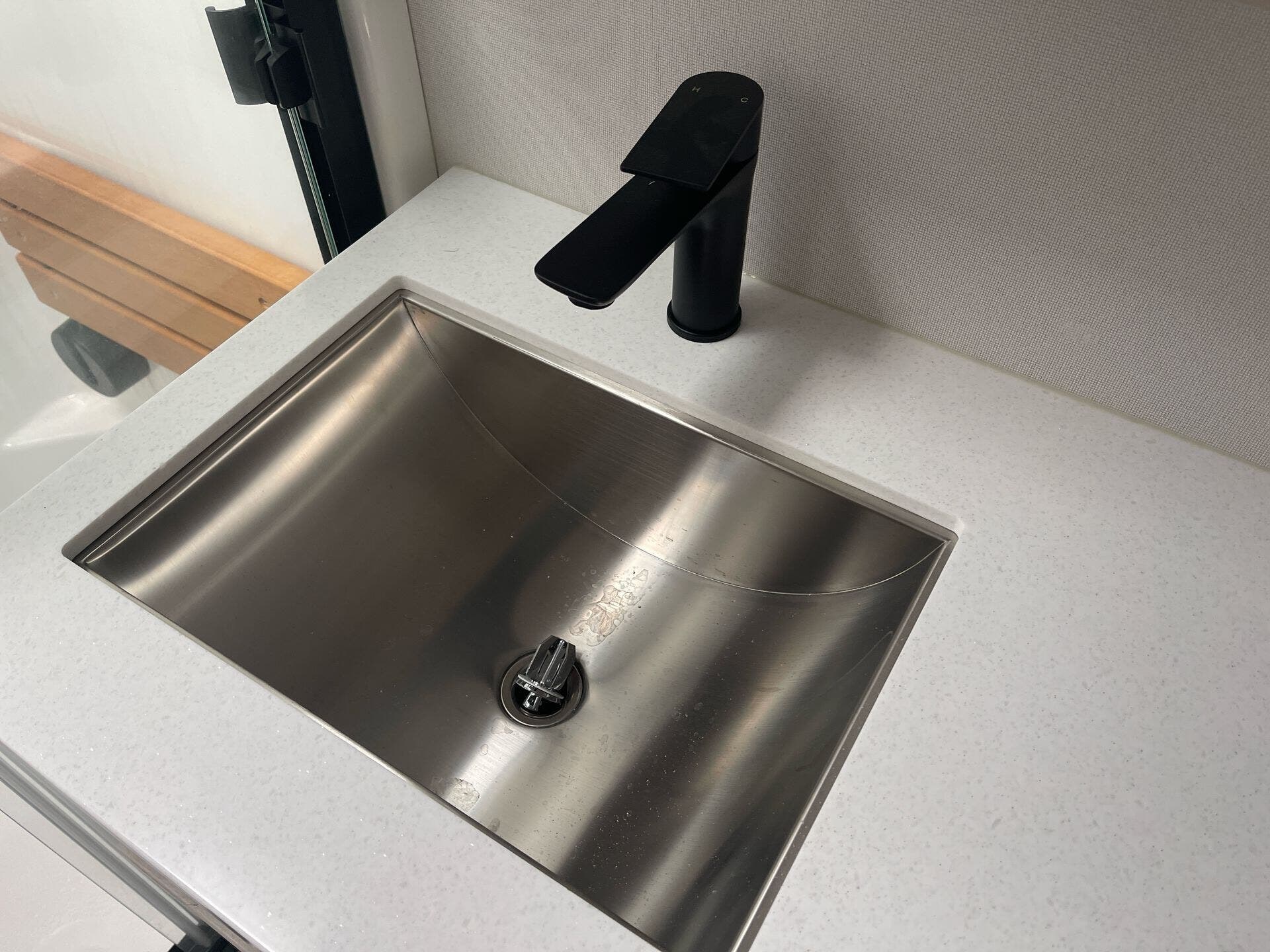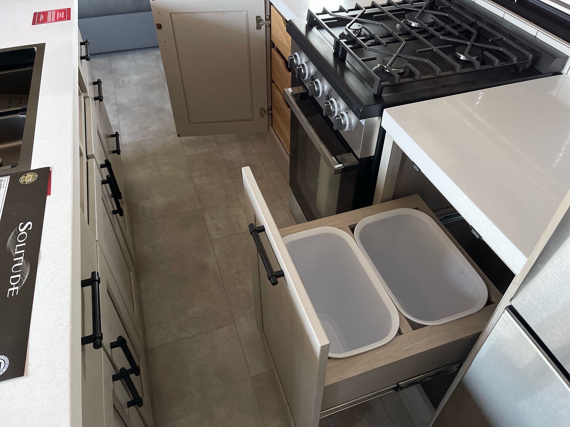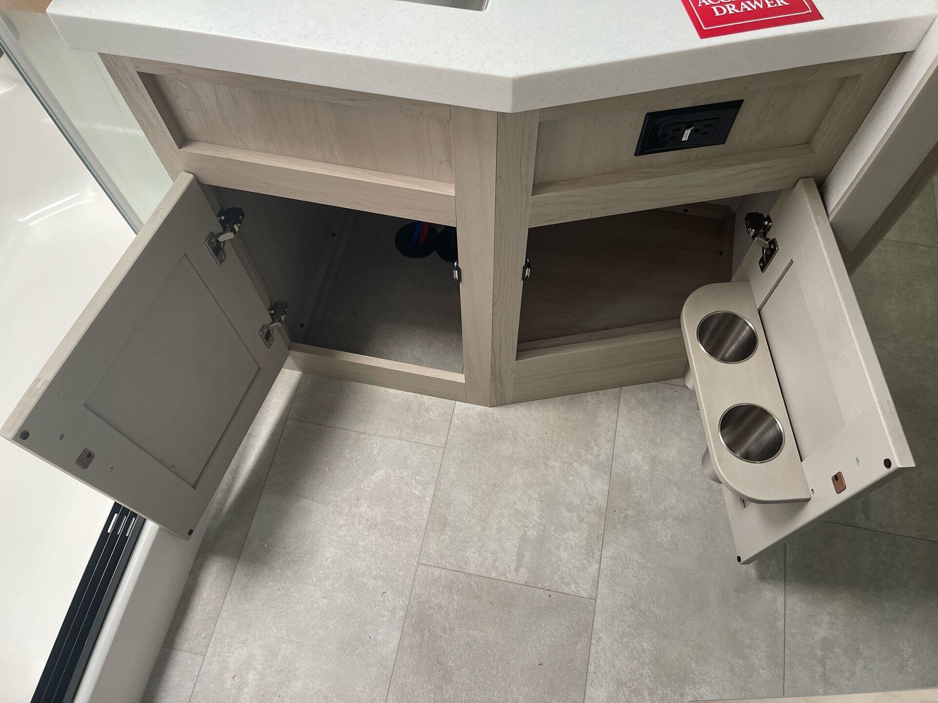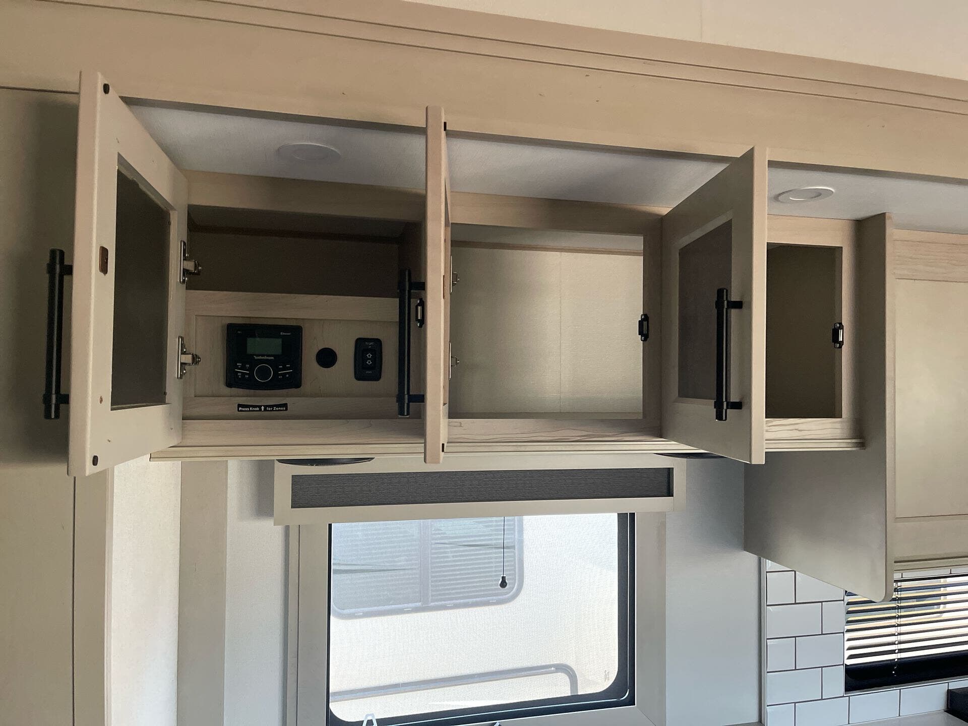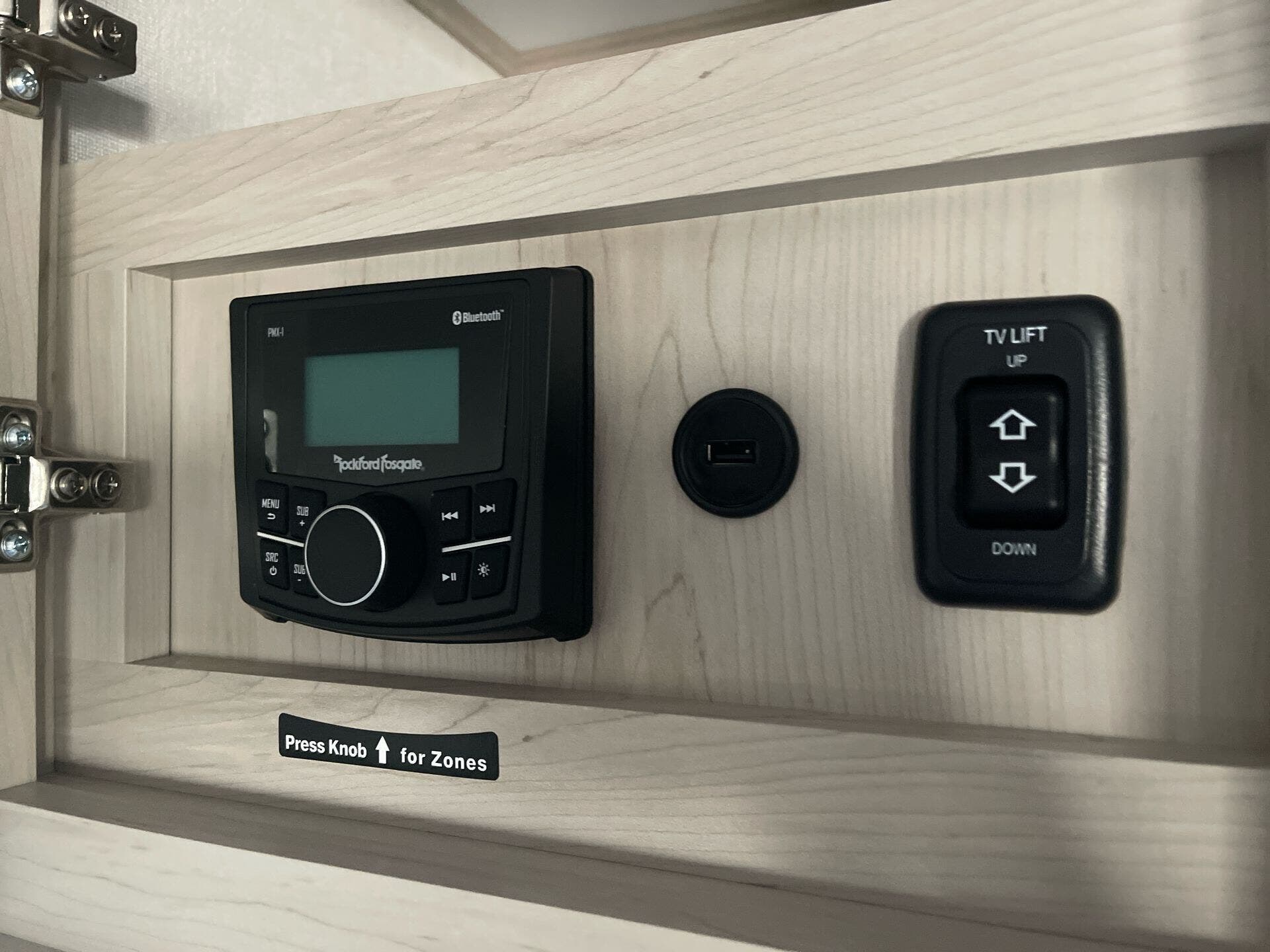 Its utility features include 81 gal fresh, 106 gal gray, and 53 gal black water tanks, two 14.2 gal propane tanks, 30,000 BTU dual heat-pump A/C, and a 35,000 BTU furnace with tankless on-demand water heating.