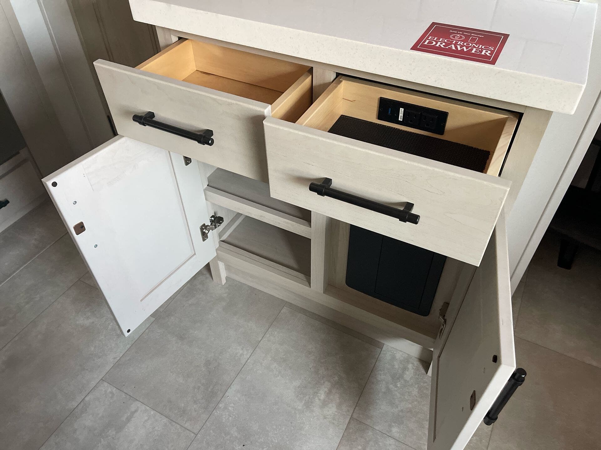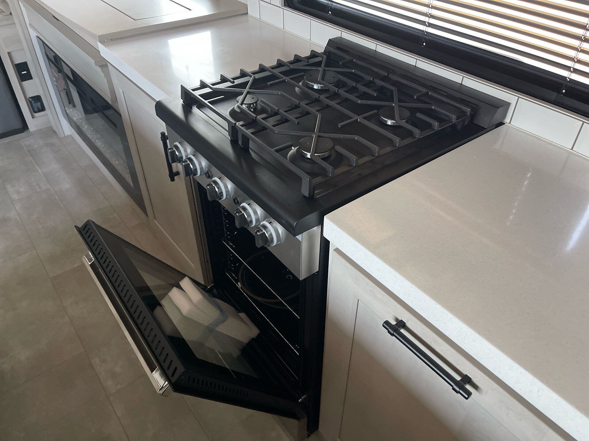 Designed for up to four sleepers, it features a front private bedroom with queen bed slide-out (king optional), ample closet space, slide-top dresser, and washer/dryer prep. The central kitchen includes a large island, triple-burner cooktop with oven, convection microwave, 20cuft 12V refrigerator, oversized pantry, and solid-surface countertops.