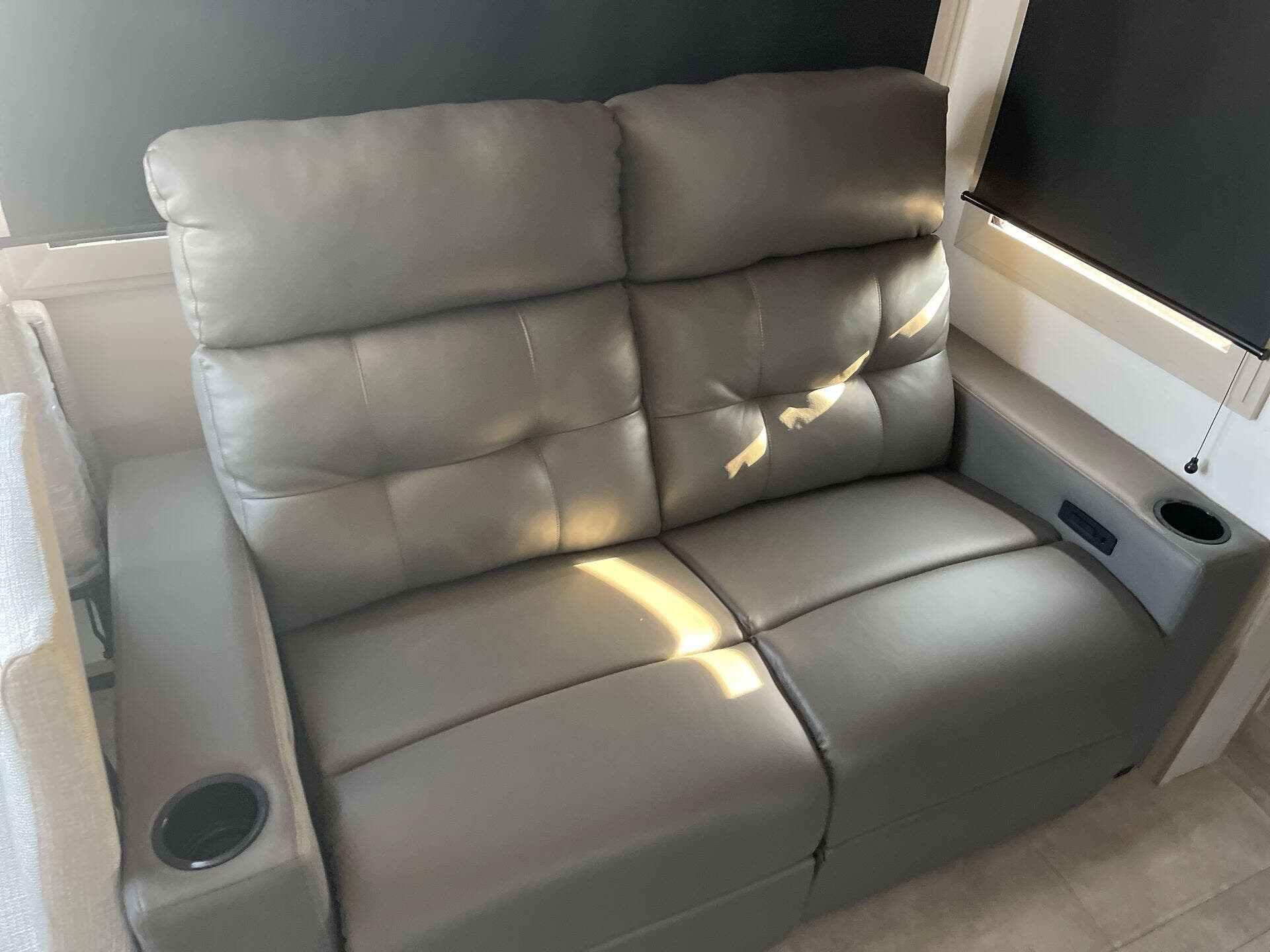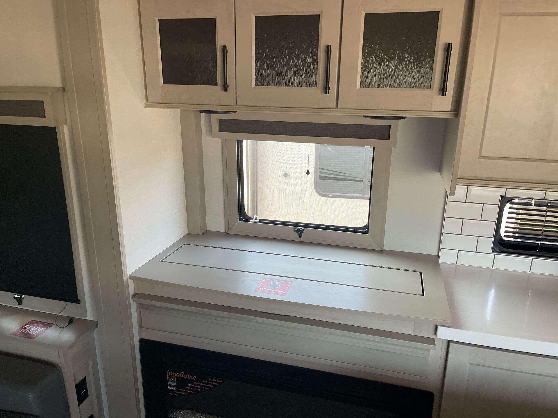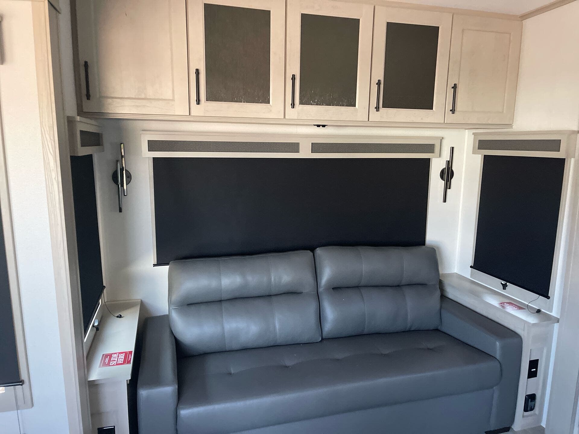 The rear living area houses a tri-fold sofa, theater seating, booth dinette, electric fireplace, and a 40″ LED Smart TV—perfect for relaxing under panoramic rear windows.