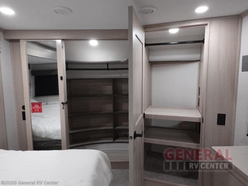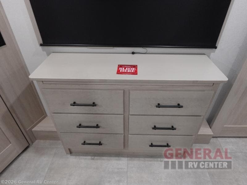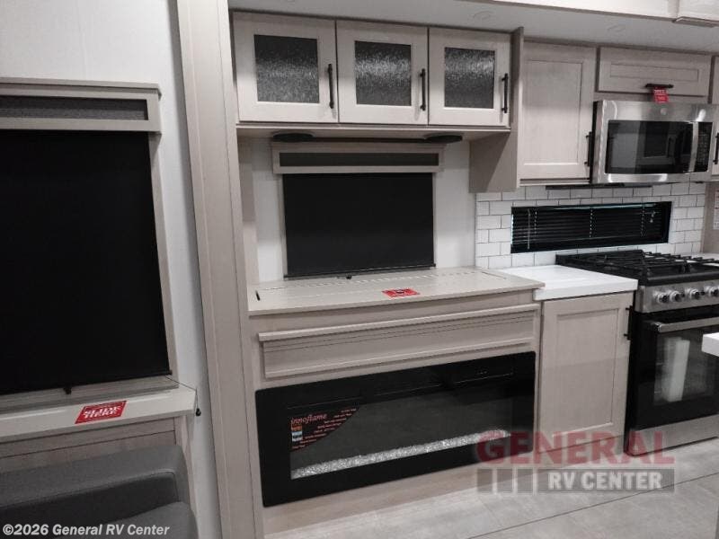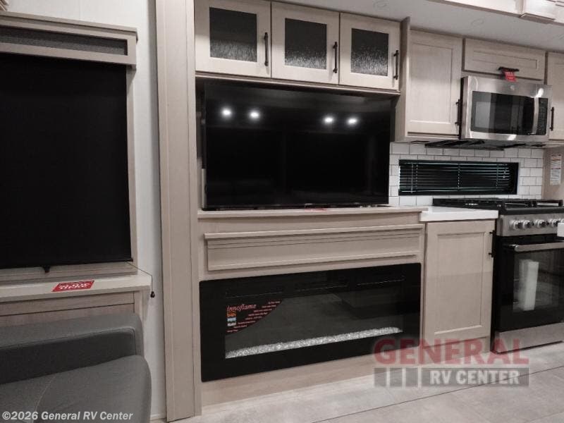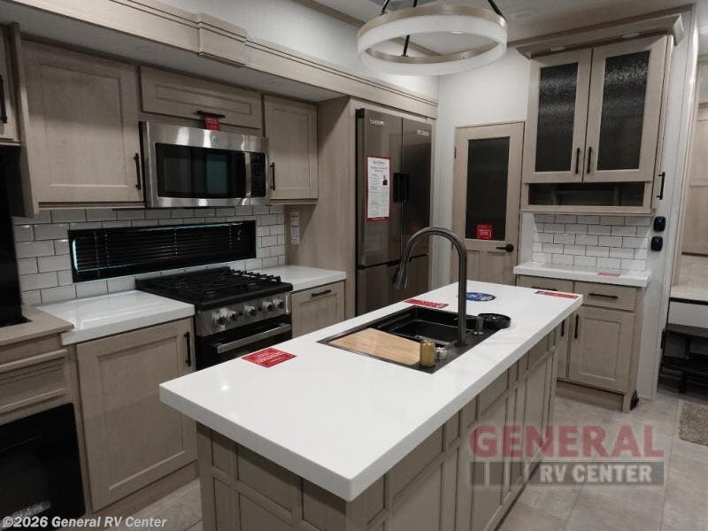 Traveling for long periods at a time is made easy with this gourmet kitchen that can feed your entire group a holiday meal! The professional-grade stainless steel cooktop with a built-in oven, microwave, 12V 20 cu. ft. refrigerator, and a kitchen island offers everything you will need to enjoy cooking for your family and guests. There is abundant storage throughout multiple overhead cabinets, a kitchen pantry and hutch, a bath linen cabinet for your towels, and in the front master bedroom which features a large closet. In the bedroom there is also a King bed slide for added space to sleep comfortable at night. Two nice awnings will provide outdoor living space keeping you protected from the sun and rain, and you can add an optional pull-out kitchen to enjoy convenient cooking outdoors as well.