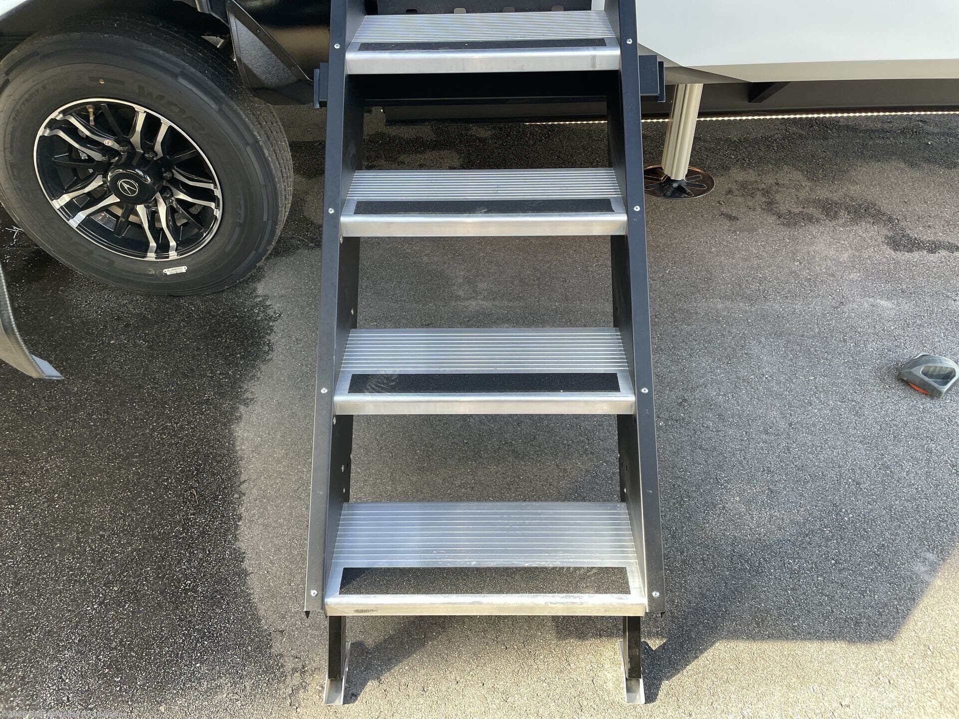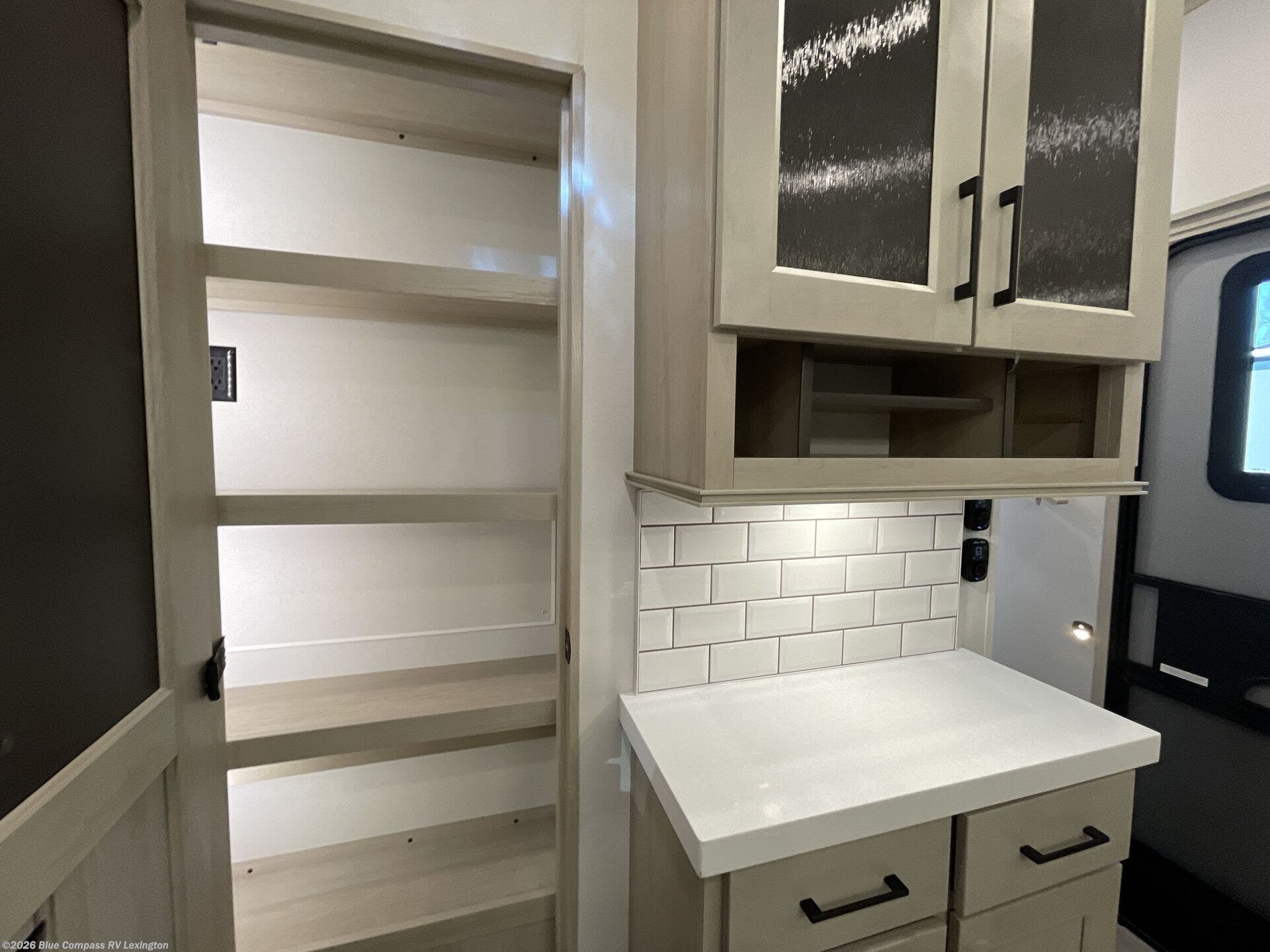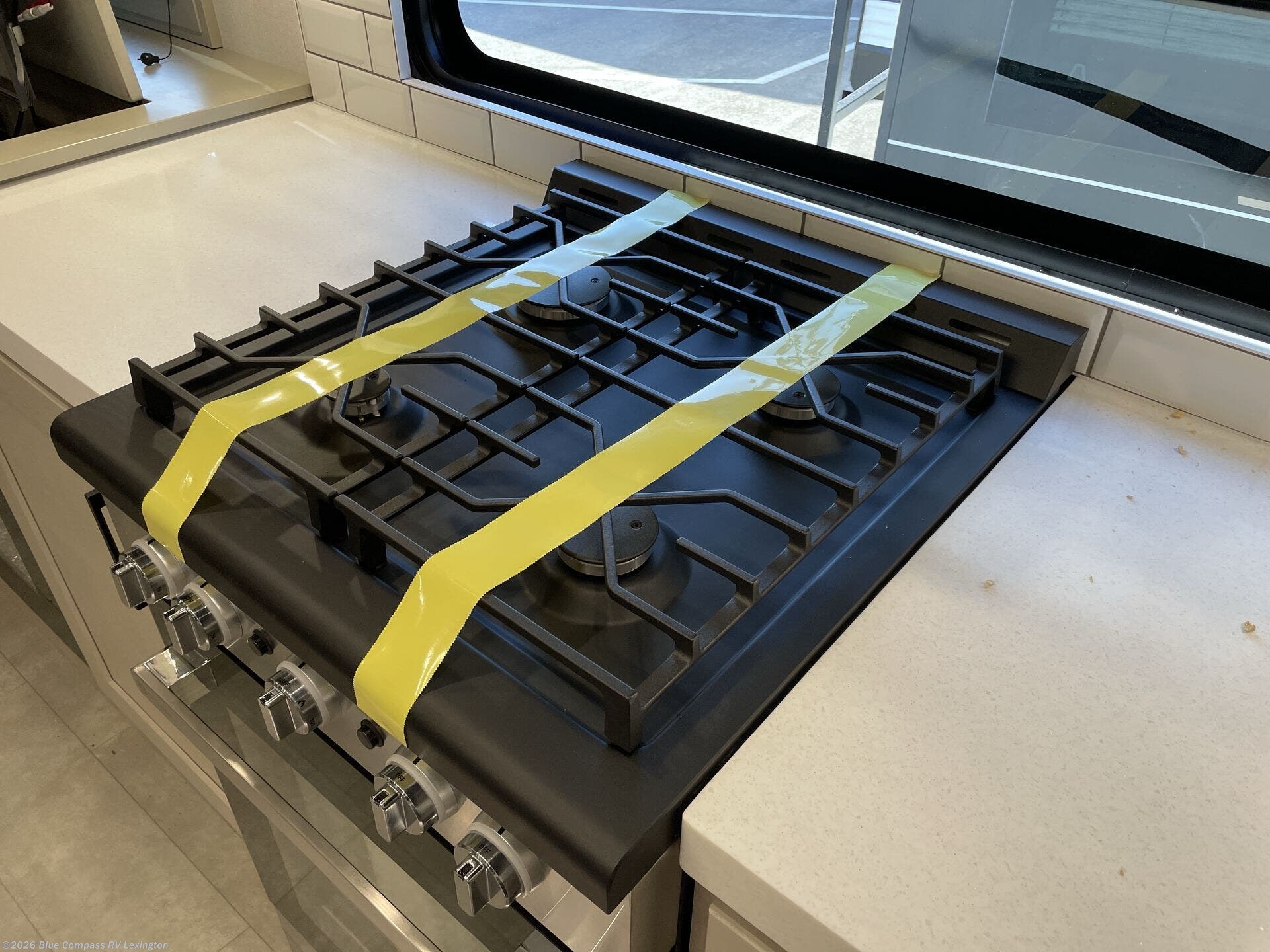 Traveling for long periods at a time is made easy with this gourmet kitchen that can feed your entire group a holiday meal! The professional-grade stainless steel cooktop with a built-in oven, microwave, 12V 20 cu. ft. refrigerator, and a kitchen island offers everything you will need to enjoy cooking for your family and guests. There is abundant storage throughout multiple overhead cabinets, a kitchen pantry and hutch, a bath linen cabinet for your towels, and in the front master bedroom which features a large closet. In the bedroom there is also a queen bed slide for added space to sleep comfortable at night, or you may choose an optional king bed if you enjoy more space. You will also find a closet with washer/dryer prep, large wardrobe, a clothes hamper plus a slide top dresser. Two nice awnings will provide outdoor living space keeping you protected from the sun and rain, and you can add an optional pull-out kitchen to enjoy convenient cooking outdoors as well.