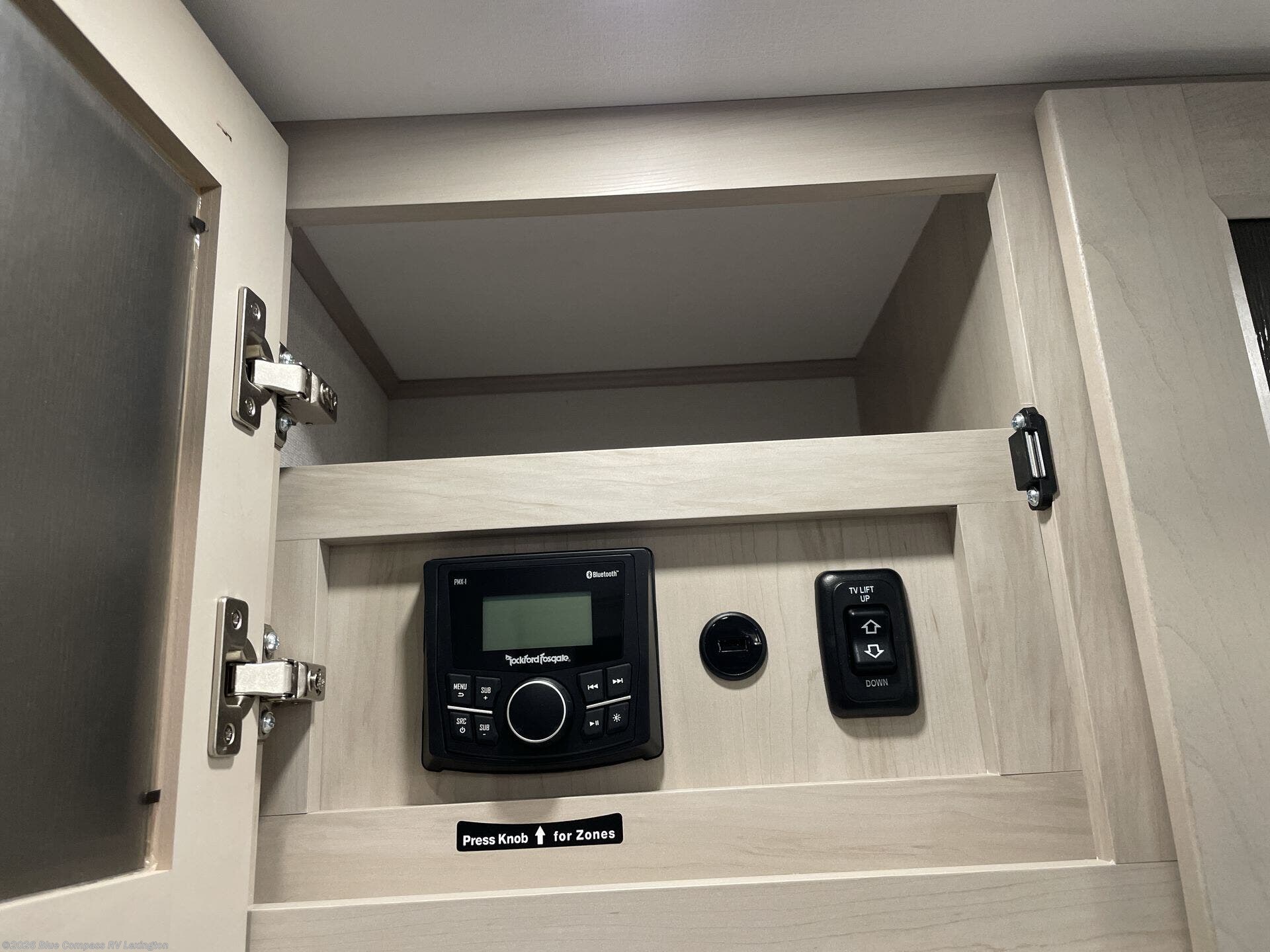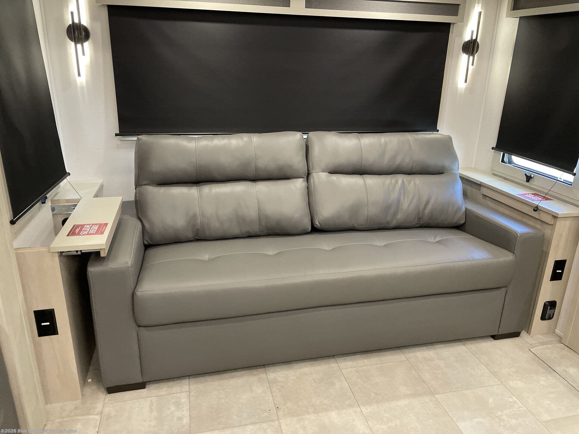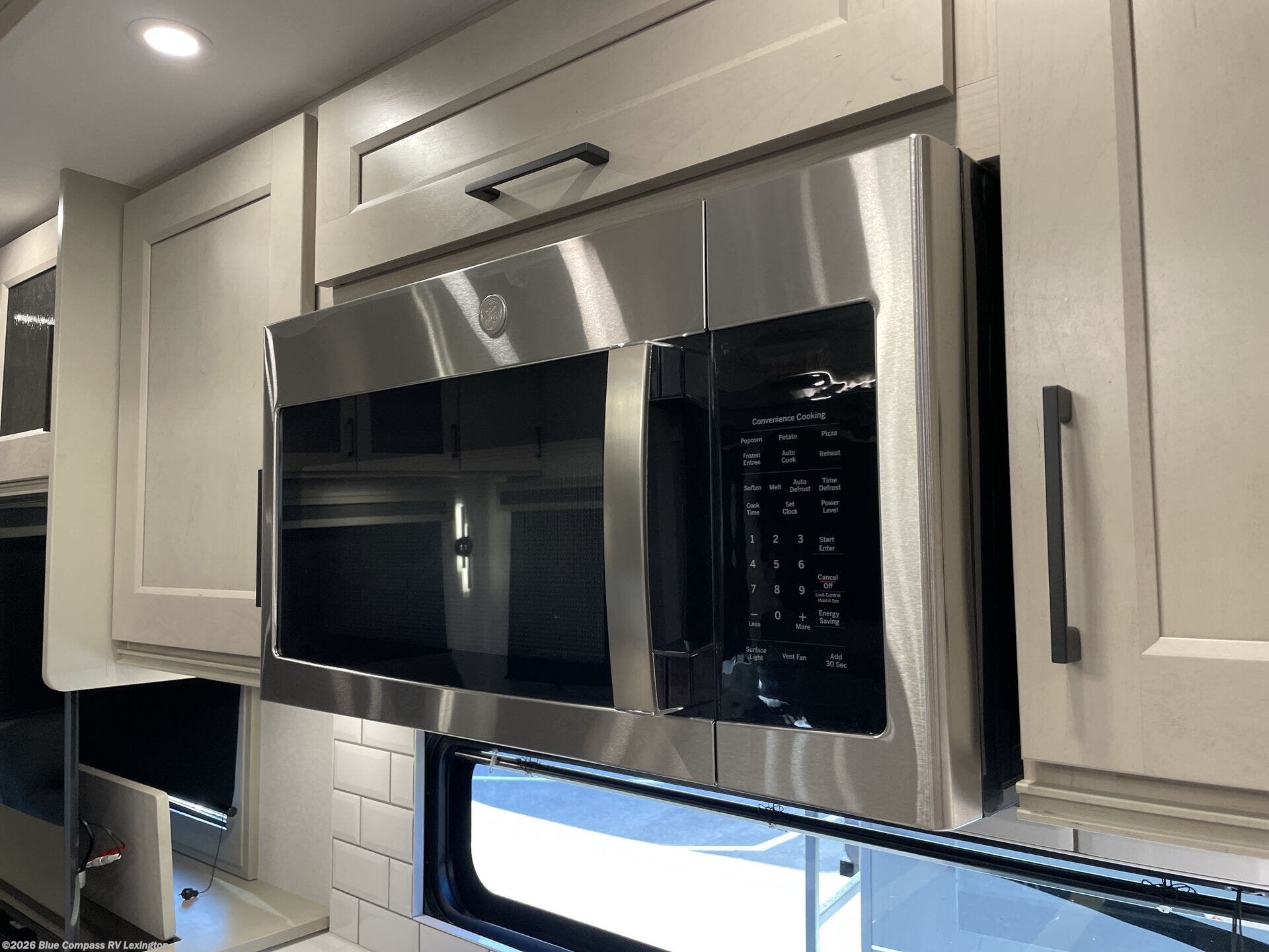Traveling for long periods at a time is made easy with this gourmet kitchen that can feed your entire group a holiday meal! The professional-grade stainless steel cooktop with a built-in oven, microwave, 12V 20 cu. ft. refrigerator, and a kitchen island offers everything you will need to enjoy cooking for your family and guests. There is abundant storage throughout multiple overhead cabinets, a kitchen pantry and hutch, a bath linen cabinet for your towels, and in the front master bedroom which features a large closet. In the bedroom there is also a queen bed slide for added space to sleep comfortable at night, or you may choose an optional king bed if you enjoy more space. You will also find a closet with washer/dryer prep, large wardrobe, a clothes hamper plus a slide top dresser. Two nice awnings will provide outdoor living space keeping you protected from the sun and rain, and you can add an optional pull-out kitchen to enjoy convenient cooking outdoors as well.