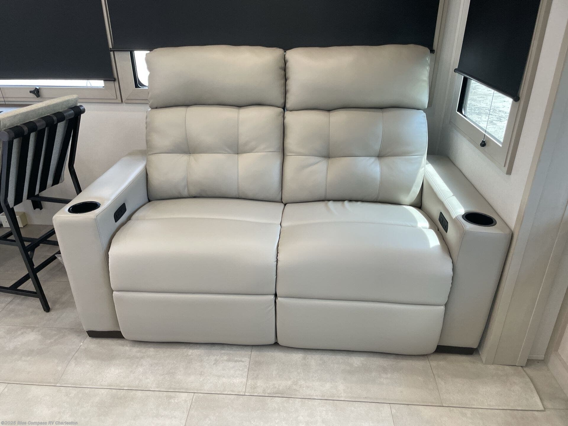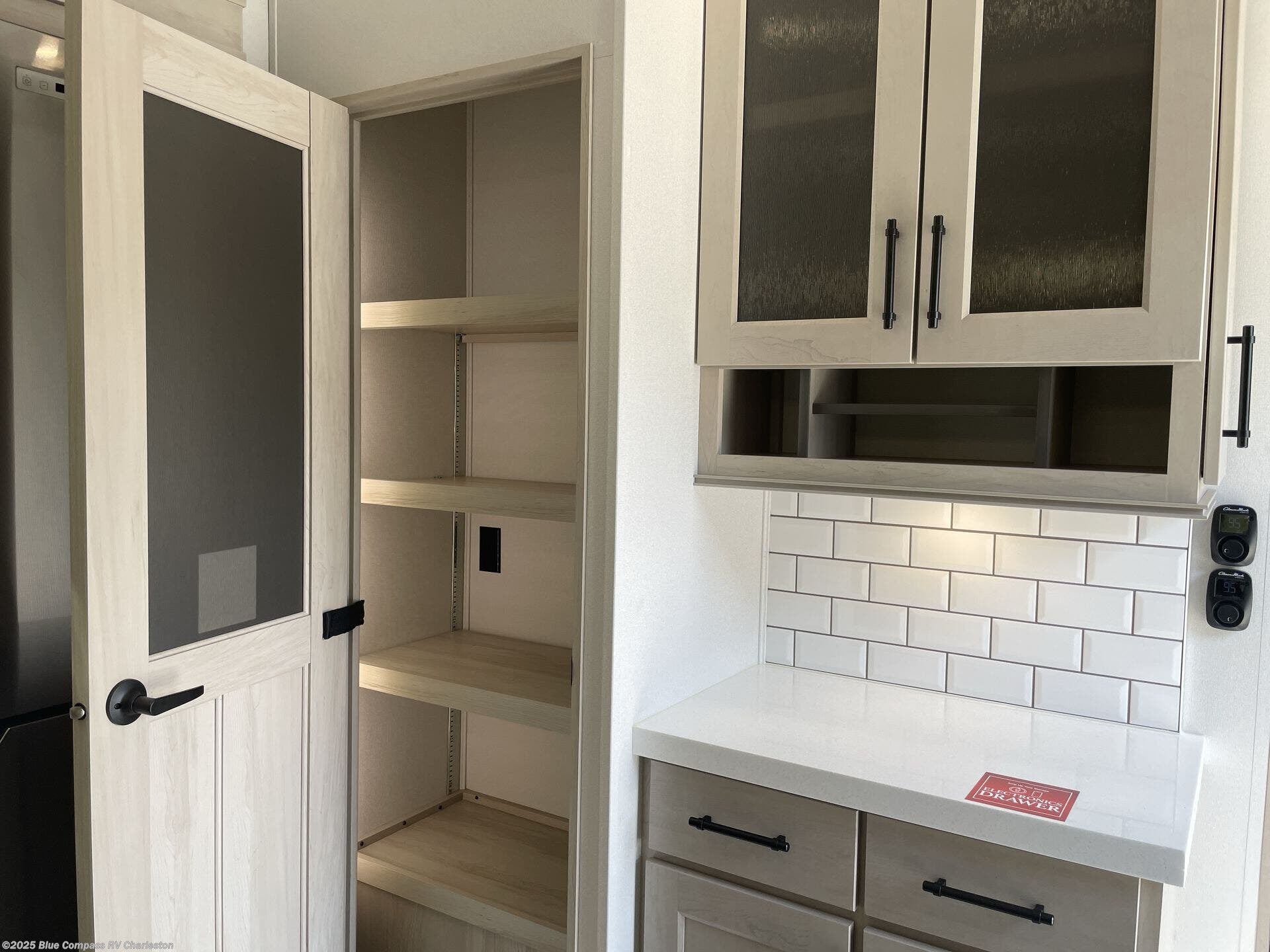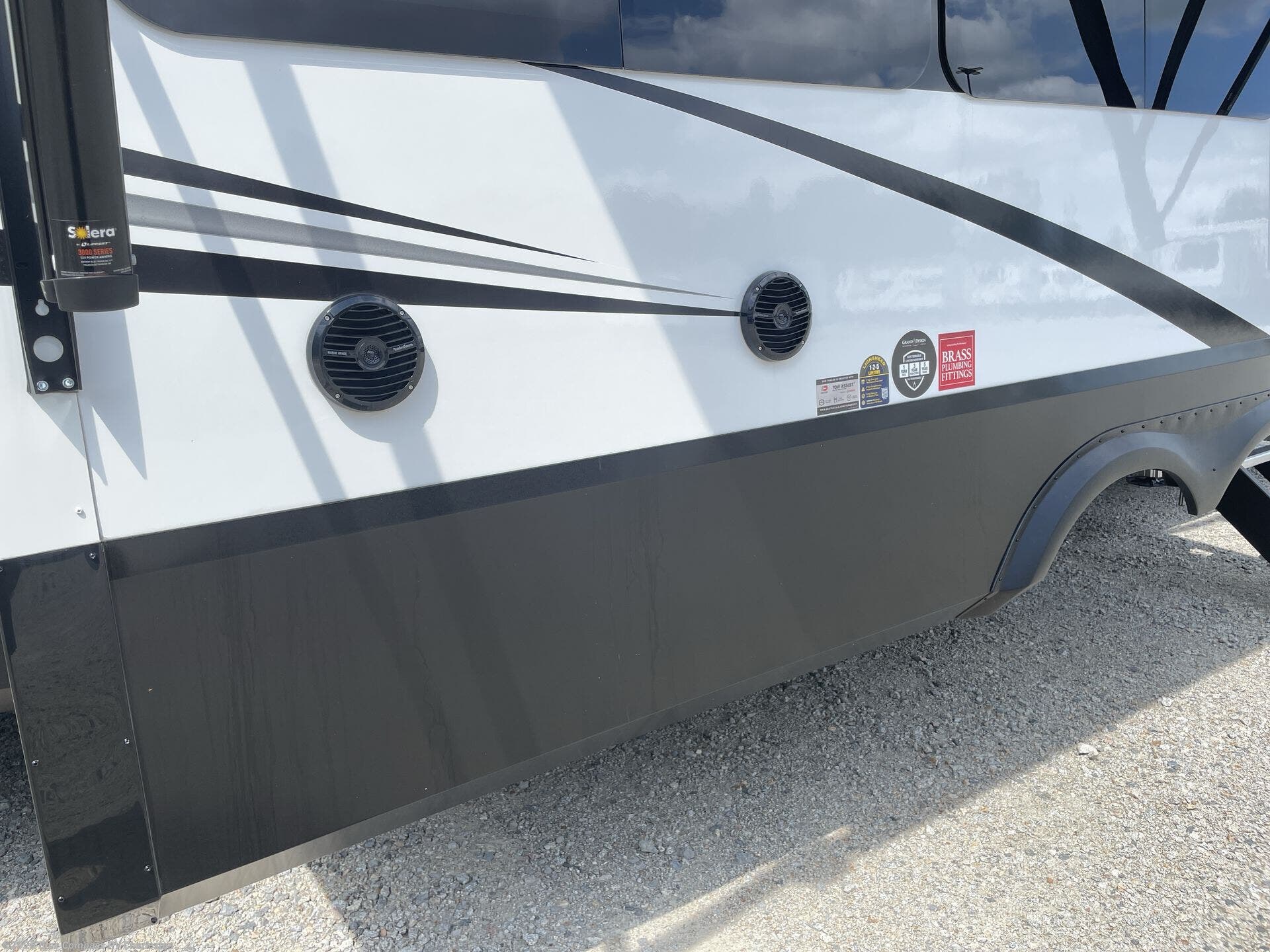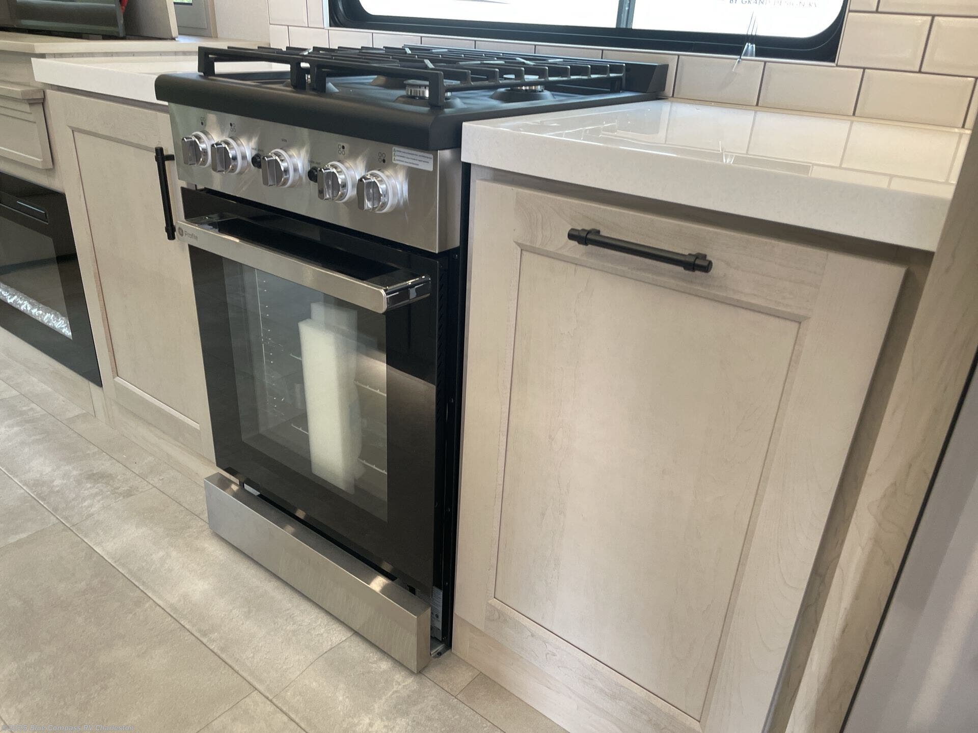Are you looking to upgrade from a travel trailer to a fifth wheel? If so, this model will be perfect for you! Once you arrive at the campground, you can unload your gear from the pass-through storage, put out the two power awnings, then relax with a cold drink. Inside, you can kick your feet up on the theater seating, play a game at the free-standing dinette, or relax on the tri-fold sofa. The chef of your group will have a kitchen island with a Smart sink, dishwasher prep if you want the option to make cleaning up easier, plus a spacious 20 cu. ft. 12V refrigerator. There is also a built-in oven, plus a pantry and a hutch for storage galore! Having two bath sinks in the full bath is sure to be a big convenience when getting ready for bed, and the queen bed slide out in the front bedroom will provide a great night's rest. You will also find a front wardrobe, a slide top dresser, plus washer/dryer prep!