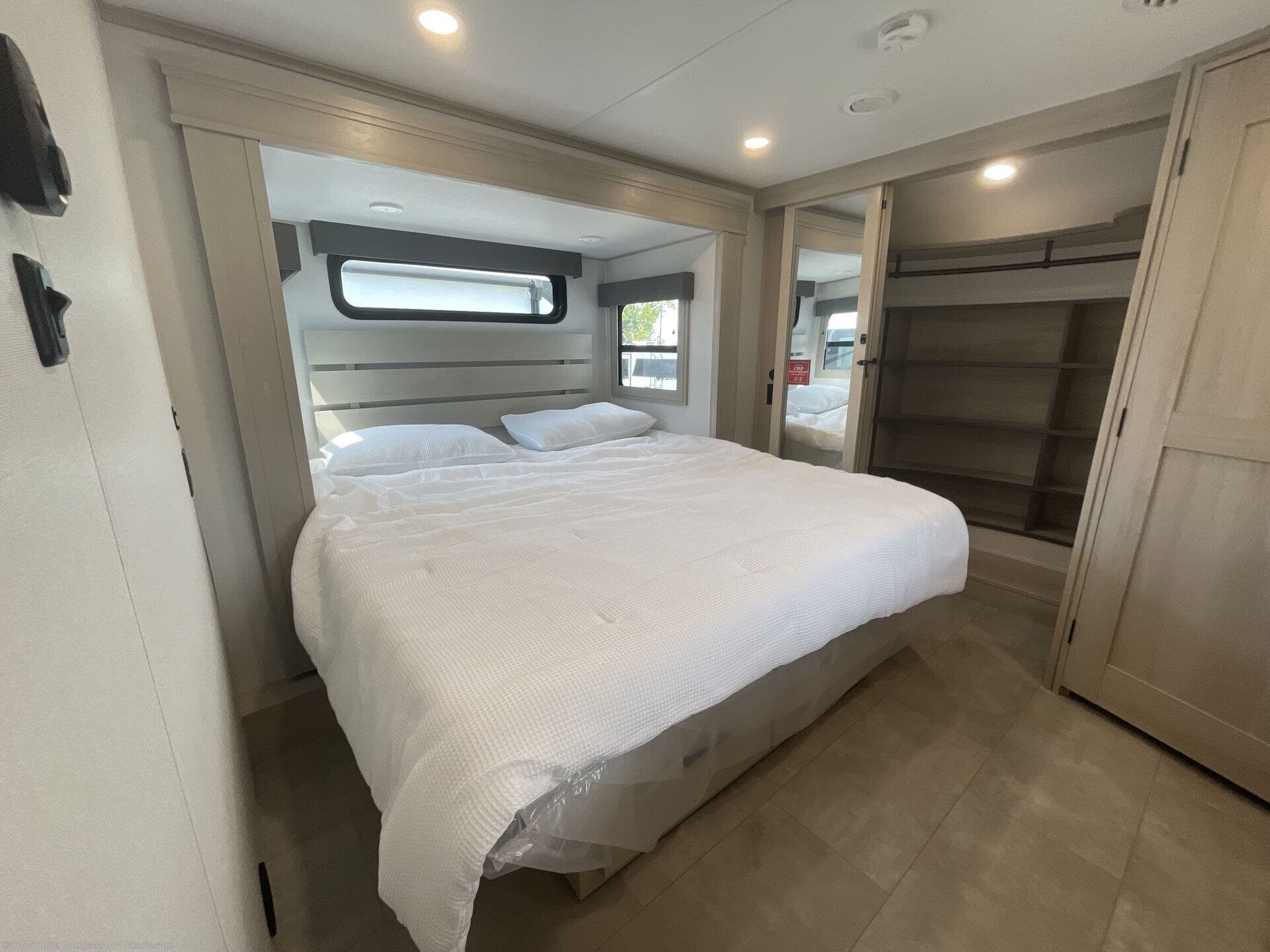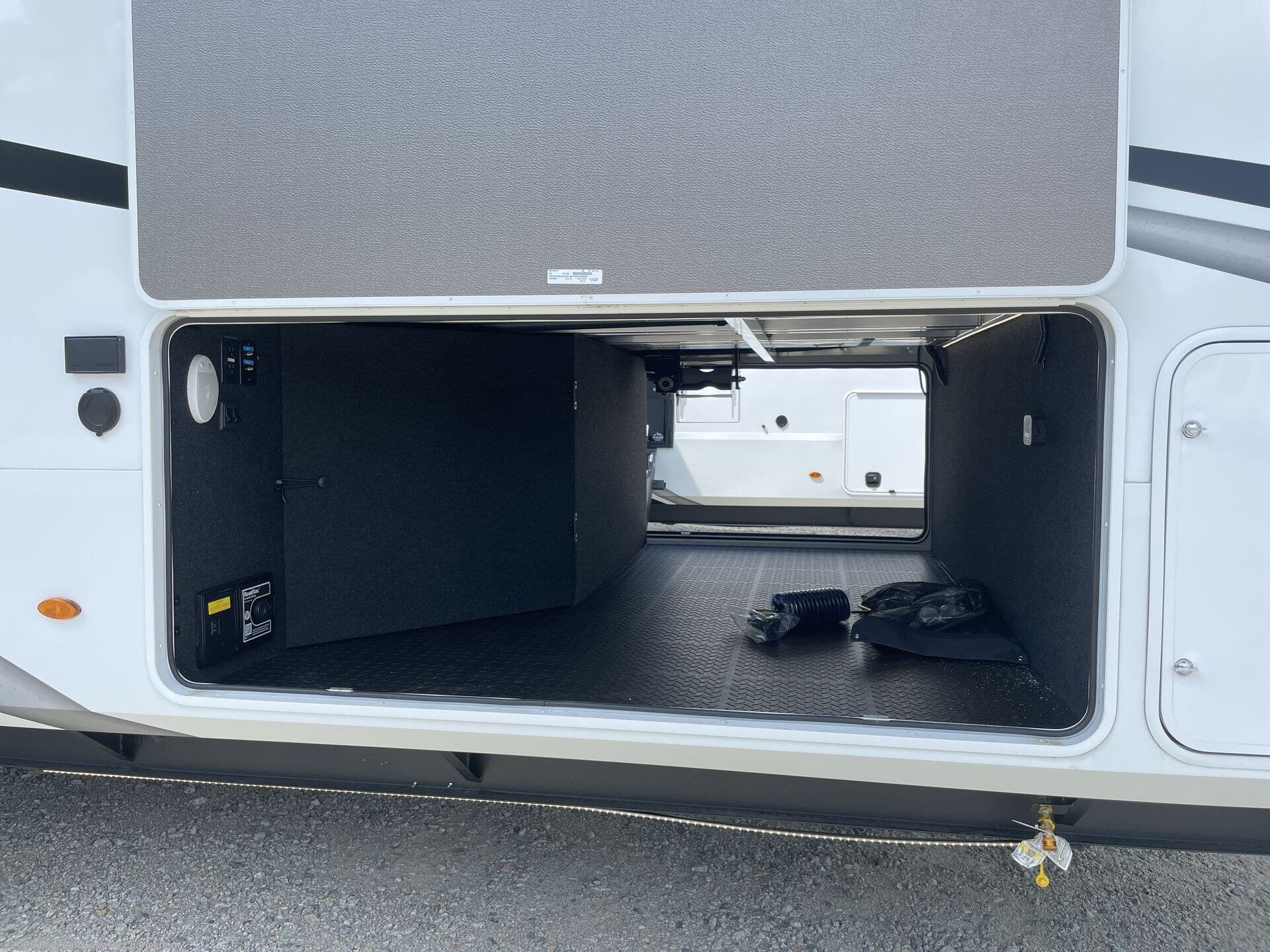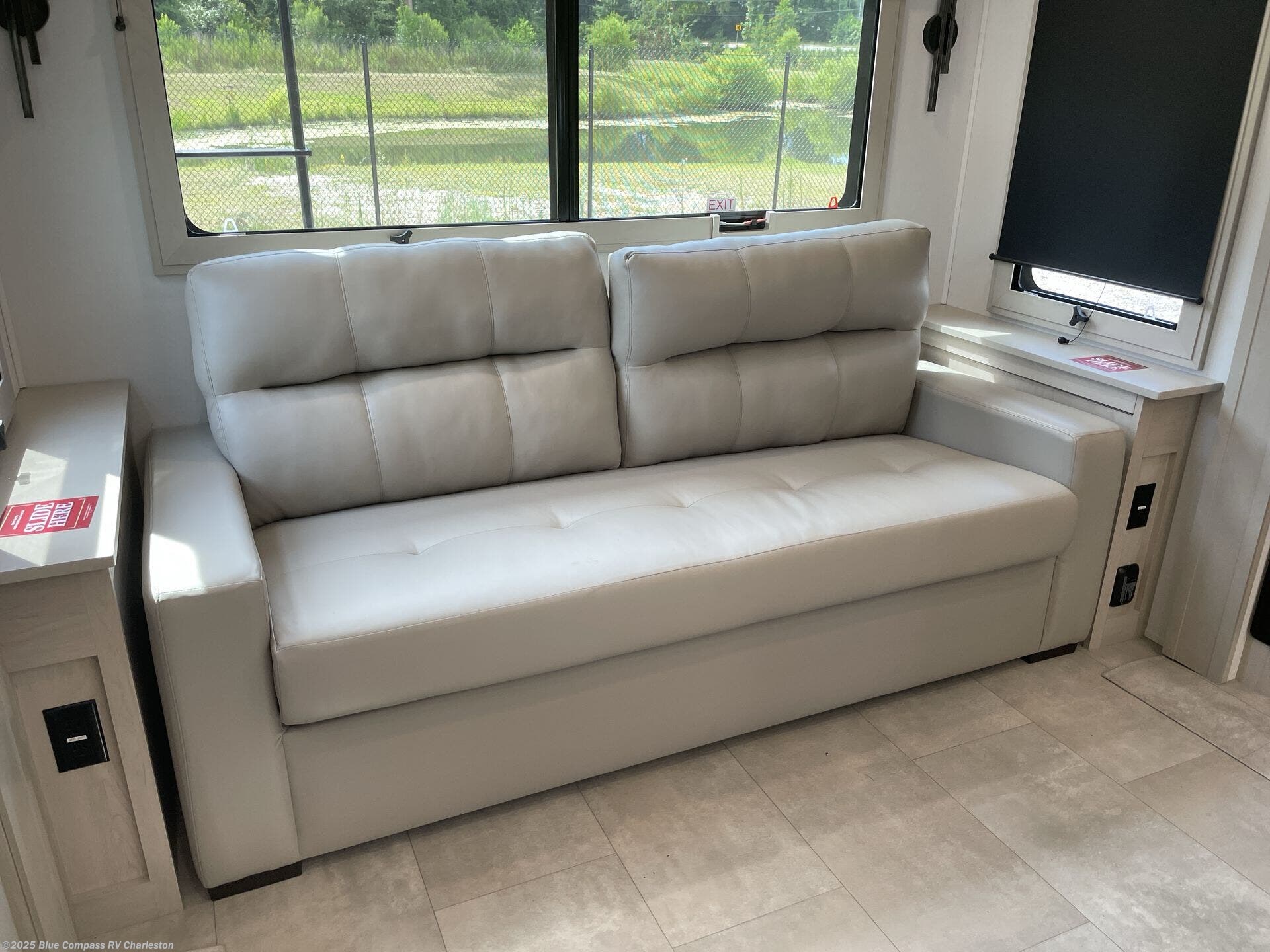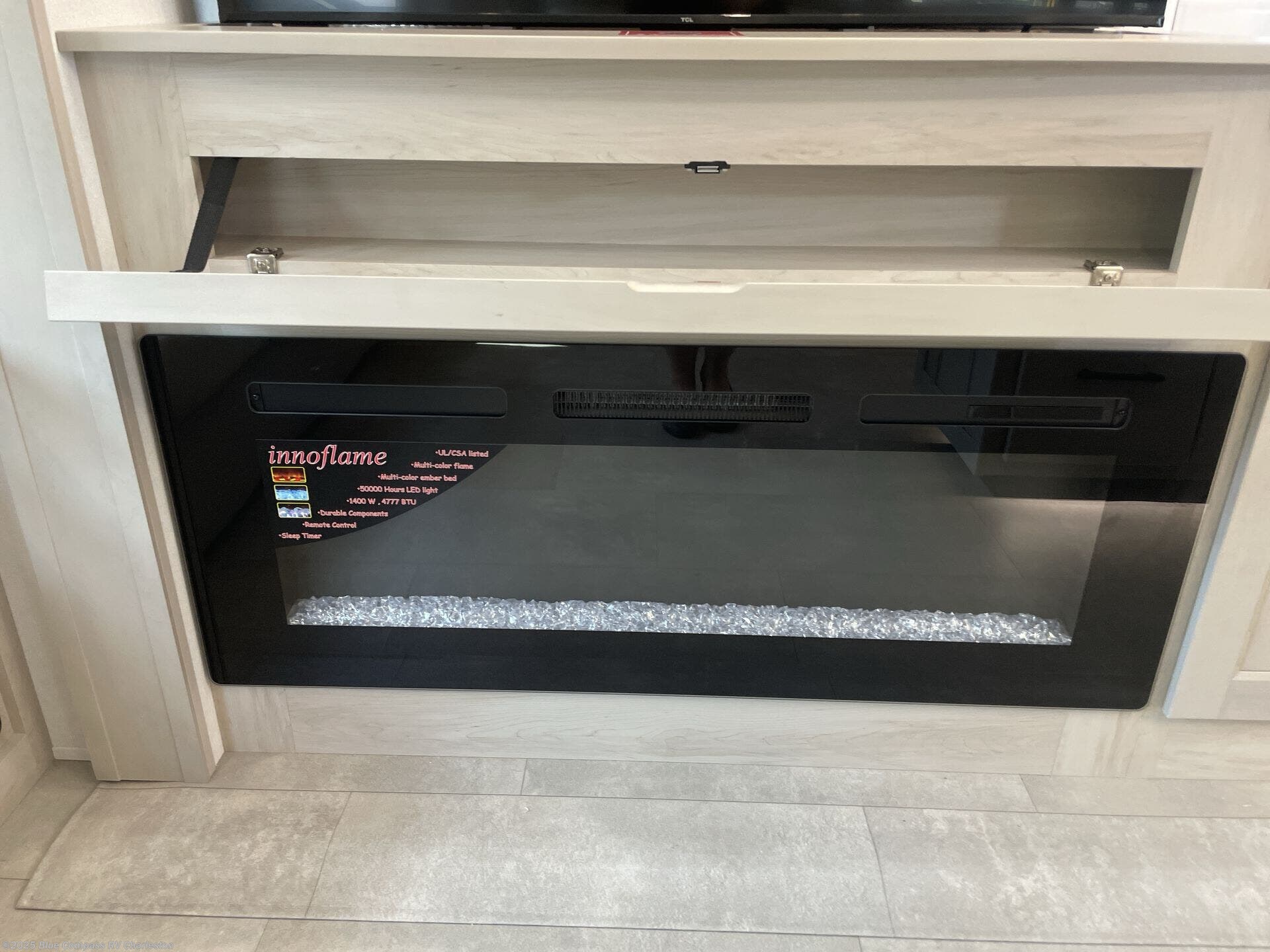 Are you looking to upgrade from a travel trailer to a fifth wheel? If so, this model will be perfect for you! Once you arrive at the campground, you can unload your gear from the pass-through storage, put out the two power awnings, then relax with a cold drink. Inside, you can kick your feet up on the theater seating, play a game at the free-standing dinette, or relax on the tri-fold sofa. The chef of your group will have a kitchen island with a Smart sink, dishwasher prep if you want the option to make cleaning up easier, plus a spacious 20 cu. ft. 12V refrigerator. There is also a built-in oven, plus a pantry and a hutch for storage galore! Having two bath sinks in the full bath is sure to be a big convenience when getting ready for bed, and the queen bed slide out in the front bedroom will provide a great night's rest. You will also find a front wardrobe, a slide top dresser, plus washer/dryer prep!