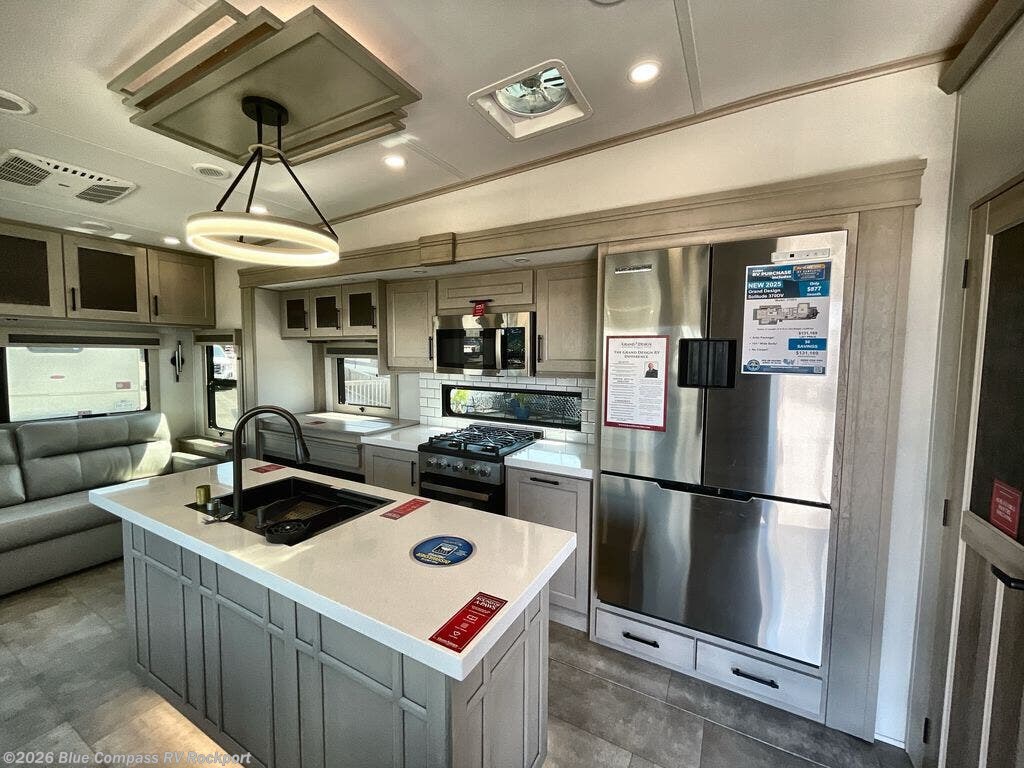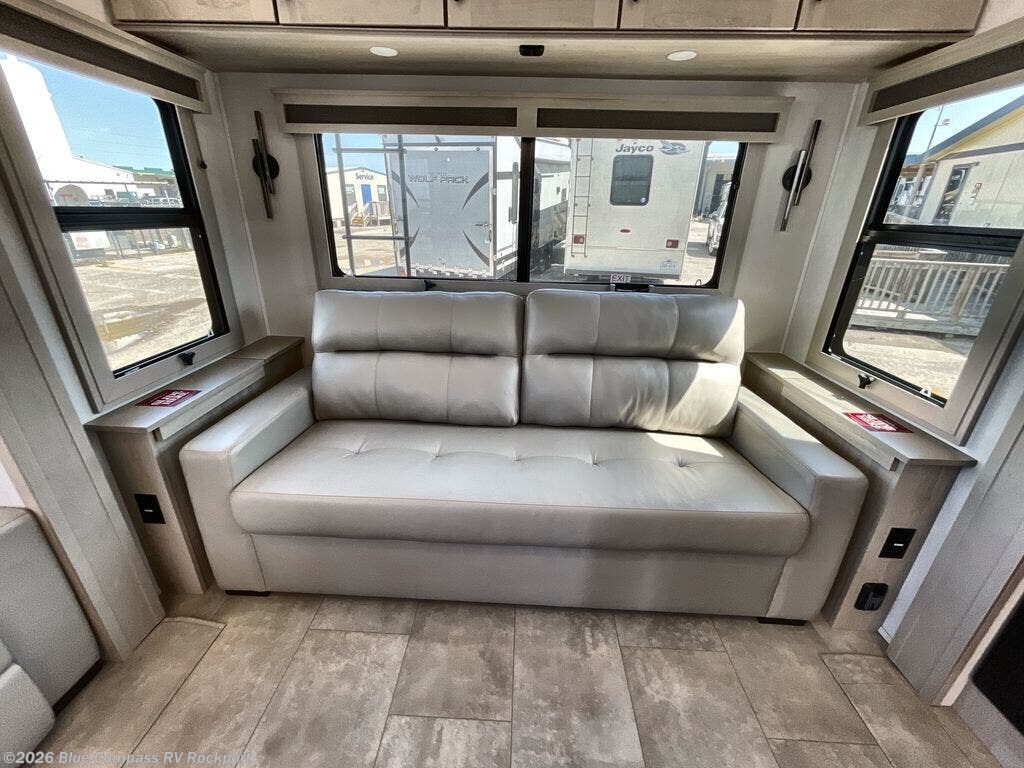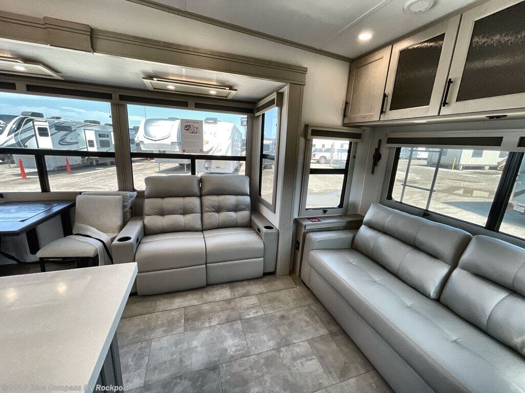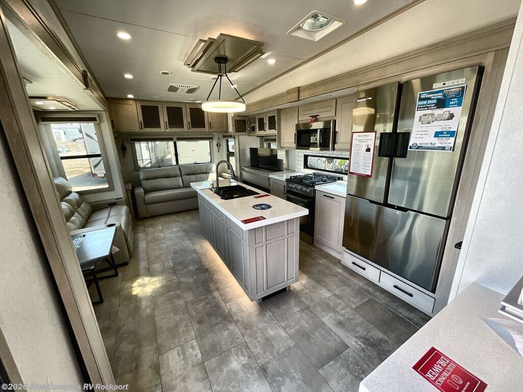 Are you looking to upgrade from a travel trailer to a fifth wheel? If so, this model will be perfect for you! Once you arrive at the campground, you can unload your gear from the pass-through storage, put out the two power awnings, then relax with a cold drink. Inside, you can kick your feet up on the theater seating, play a game at the free-standing dinette, or relax on the tri-fold sofa. The chef of your group will have a kitchen island with a Smart sink, dishwasher prep if you want the option to make cleaning up easier, plus a spacious 20 cu. ft. 12V refrigerator. There is also a built-in oven, plus a pantry and a hutch for storage galore! Having two bath sinks in the full bath is sure to be a big convenience when getting ready for bed, and the queen bed slide out in the front bedroom will provide a great night's rest. You will also find a front wardrobe, a slide top dresser, plus washer/dryer prep!