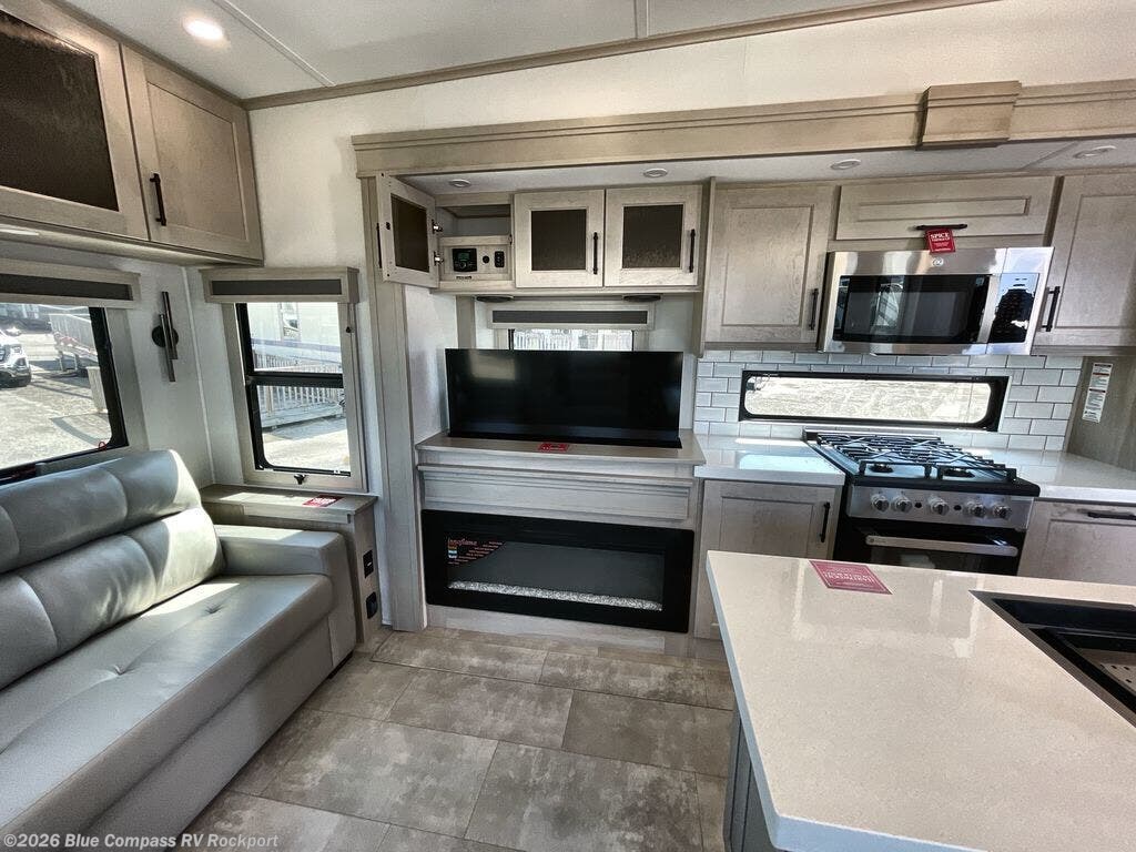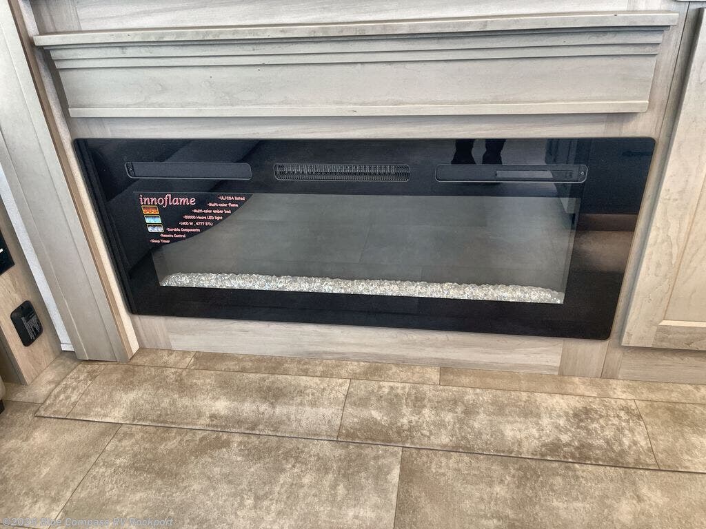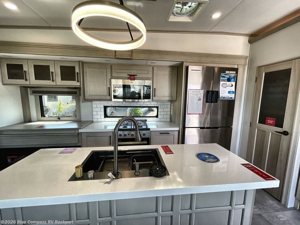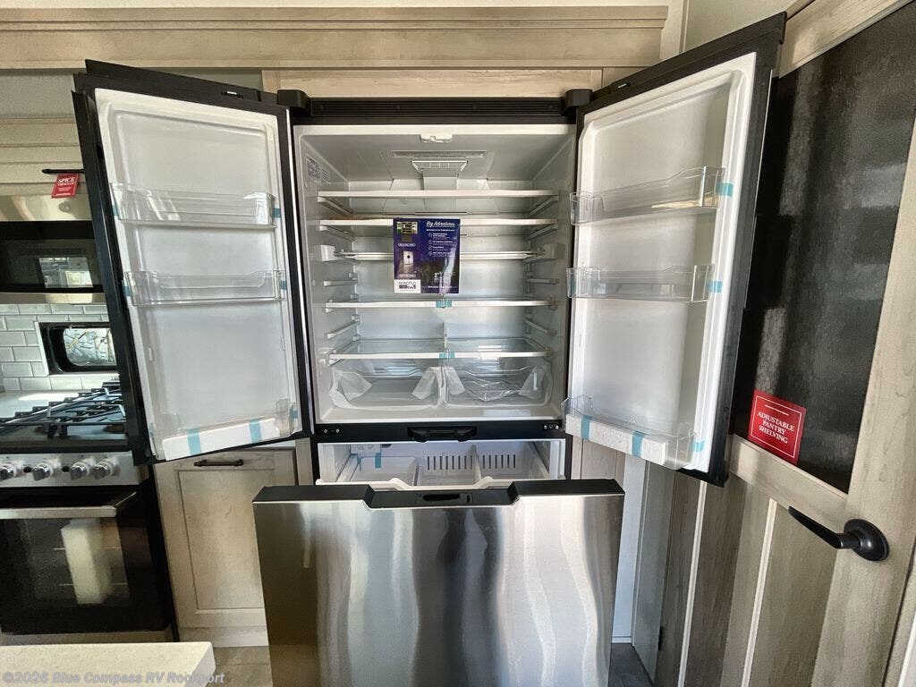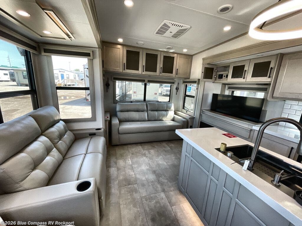 Are you looking to upgrade from a travel trailer to a fifth wheel? If so, this model will be perfect for you! Once you arrive at the campground, you can unload your gear from the pass-through storage, put out the two power awnings, then relax with a cold drink. Inside, you can kick your feet up on the theater seating, play a game at the free-standing dinette, or relax on the tri-fold sofa. The chef of your group will have a kitchen island with a Smart sink, dishwasher prep if you want the option to make cleaning up easier, plus a spacious 20 cu. ft. 12V refrigerator. There is also a built-in oven, plus a pantry and a hutch for storage galore! Having two bath sinks in the full bath is sure to be a big convenience when getting ready for bed, and the queen bed slide out in the front bedroom will provide a great night's rest. You will also find a front wardrobe, a slide top dresser, plus washer/dryer prep!