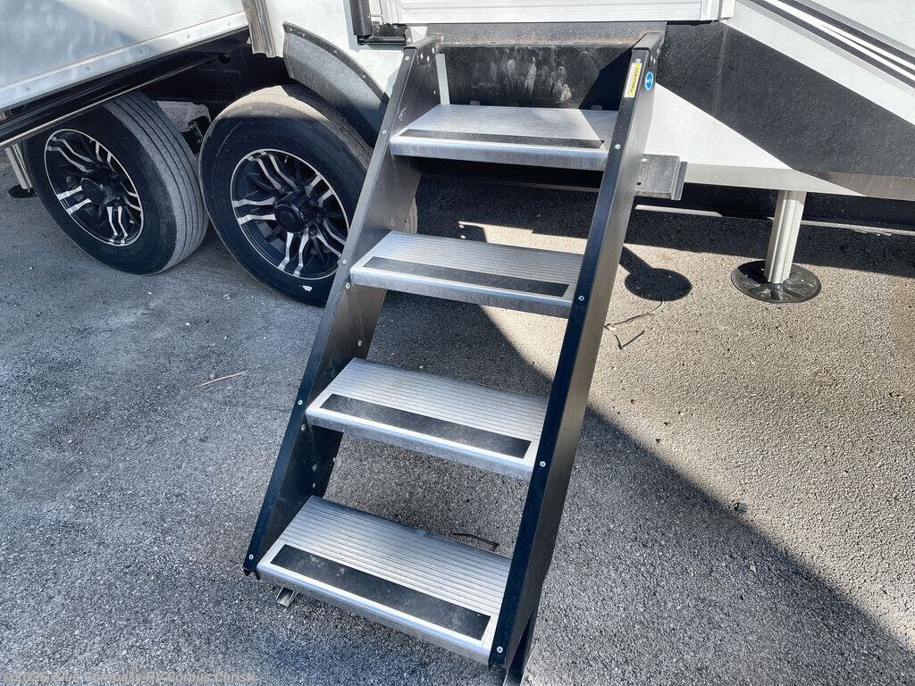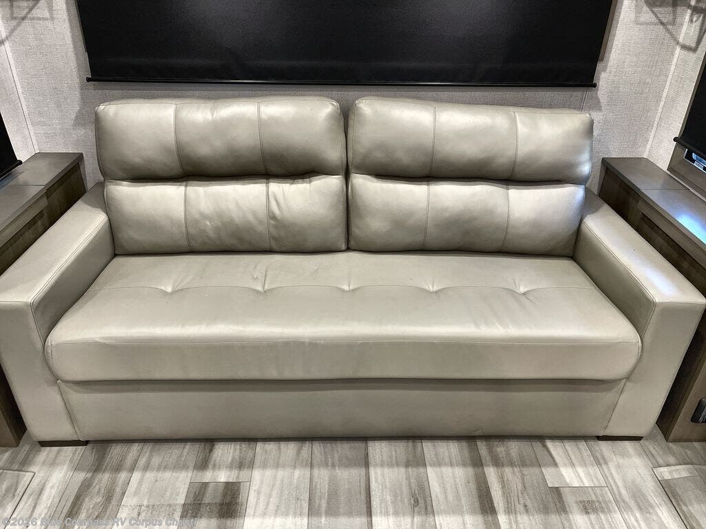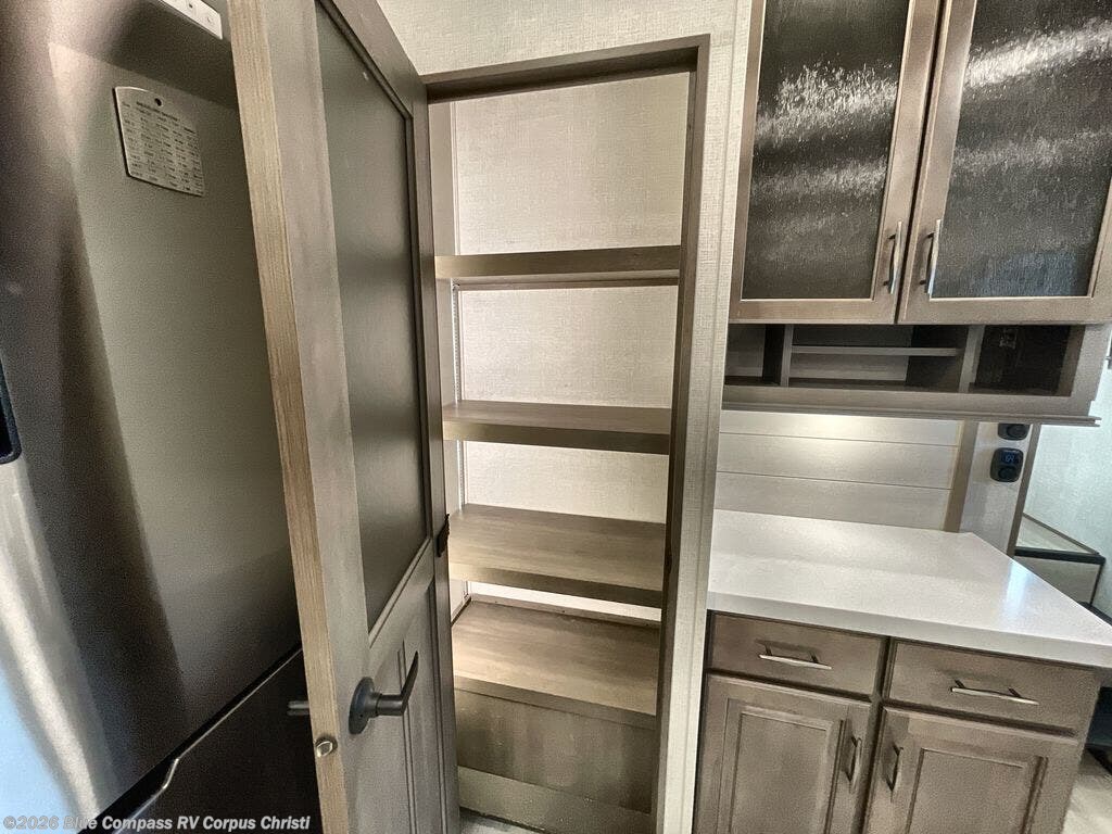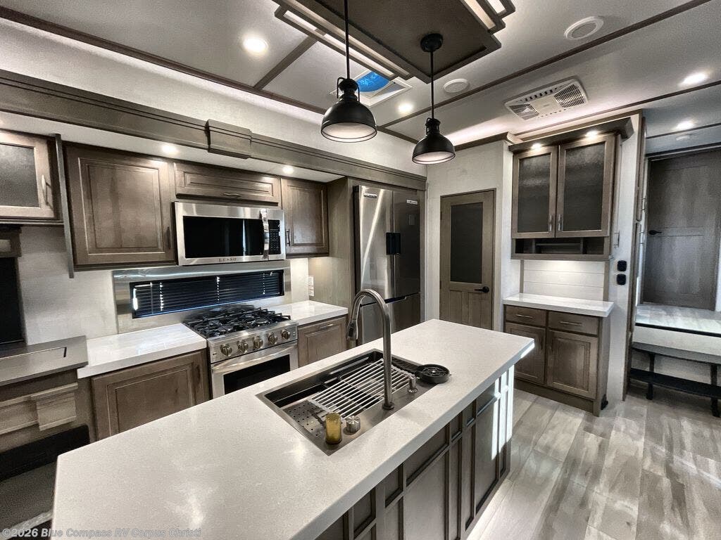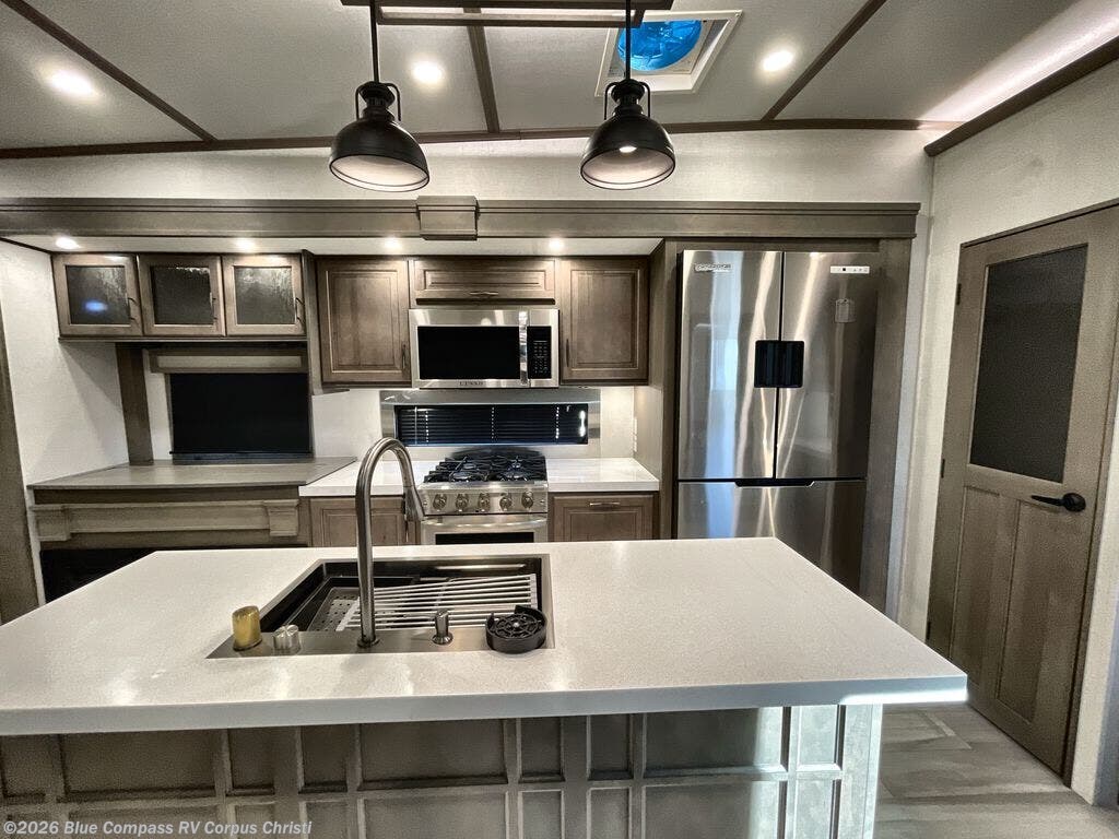 Are you looking to upgrade from a travel trailer to a fifth wheel? If so, this model will be perfect for you! Once you arrive at the campground, you can unload your gear from the pass-through storage, put out the two power awnings, then relax with a cold drink. Inside, you can kick your feet up on the theater seating, play a game at the free-standing dinette, or relax on the tri-fold sofa. The chef of your group will have a kitchen island with a Smart sink, dishwasher prep if you want the option to make cleaning up easier, plus a spacious 20 cu. ft. 12V refrigerator. There is also a built-in oven, plus a pantry and a hutch for storage galore! Having two bath sinks in the full bath is sure to be a big convenience when getting ready for bed, and the queen bed slide out in the front bedroom will provide a great night's rest. You will also find a front wardrobe, a slide top dresser, plus washer/dryer prep!