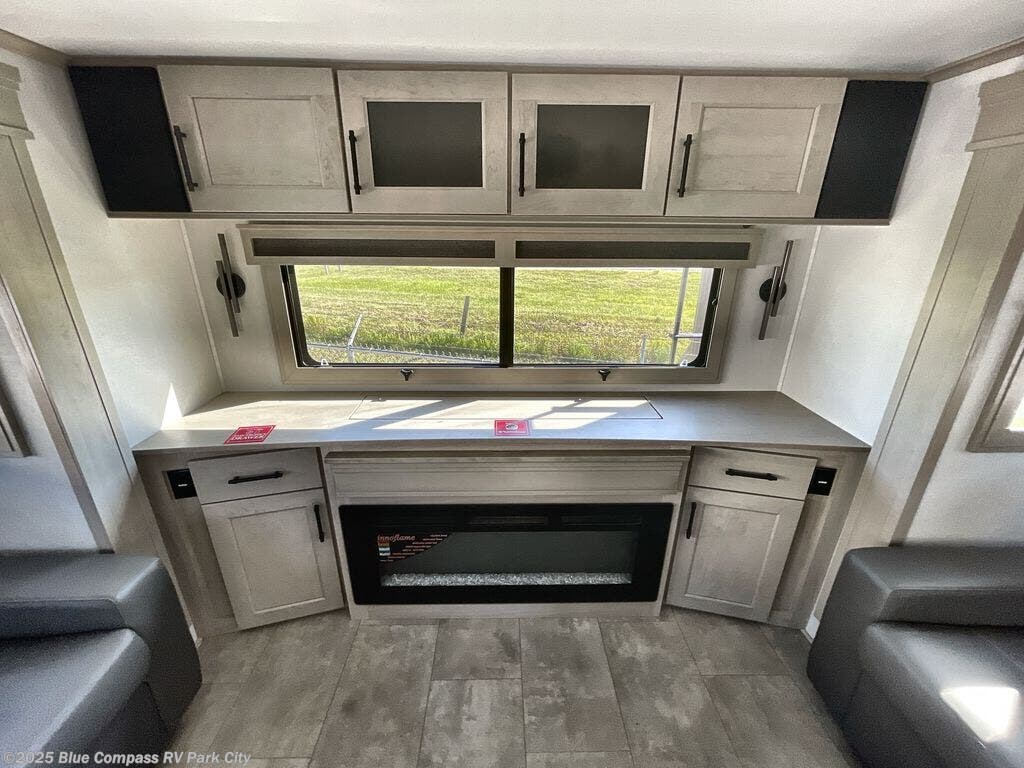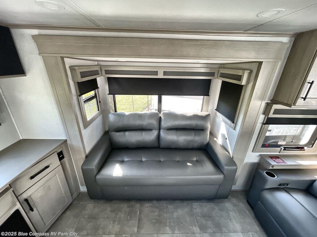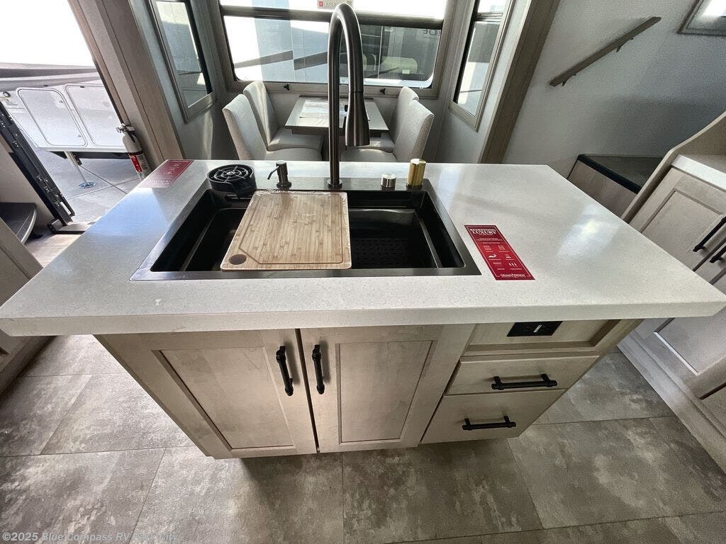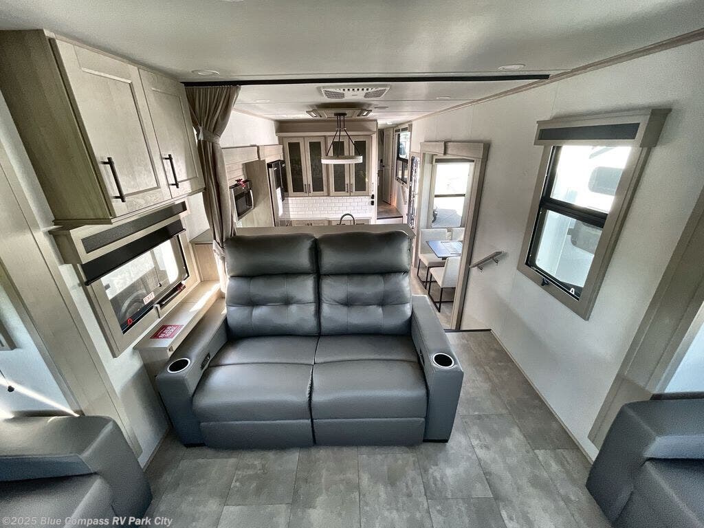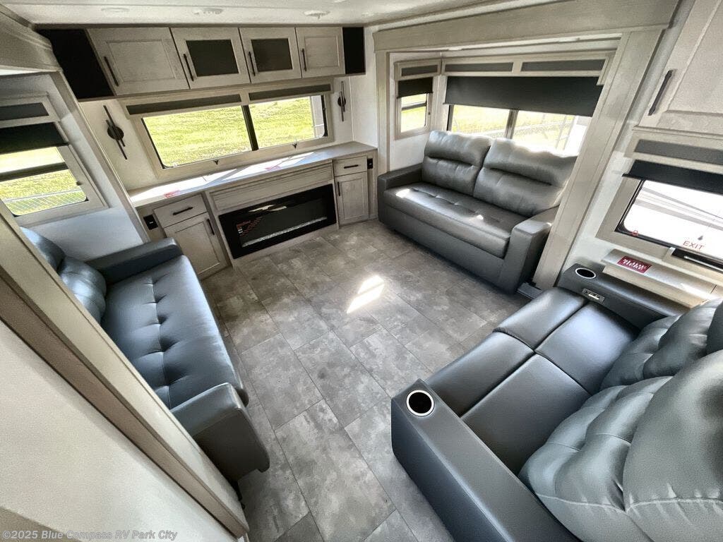 Each minute spent in this spacious fifth wheel will feel just like home! The rear living area includes a rear entertainment center with an LED Smart TV and a fireplace, overhead cabinets, theater seating, plus two tri-fold sofas for your guests to sleep on. You will have the front private bedroom all to yourselves with a queen bed slide out that can be switched out for an optional king bed, and the front closet provides all the space you need to store your belongings. This model includes a spacious full bath plus dual bath sinks for ultimate convenience. The chef of your group will love the middle kitchen with its convenient island including double sinks, a residential cooktop and built-in oven, 20 cu. ft. refrigerator, and free-standing dinette. Head outdoors to find a 16' power awning with LED lights and middle pass through along with rear storage including a sliding tray, and you might want to add the optional pull-out kitchen.
