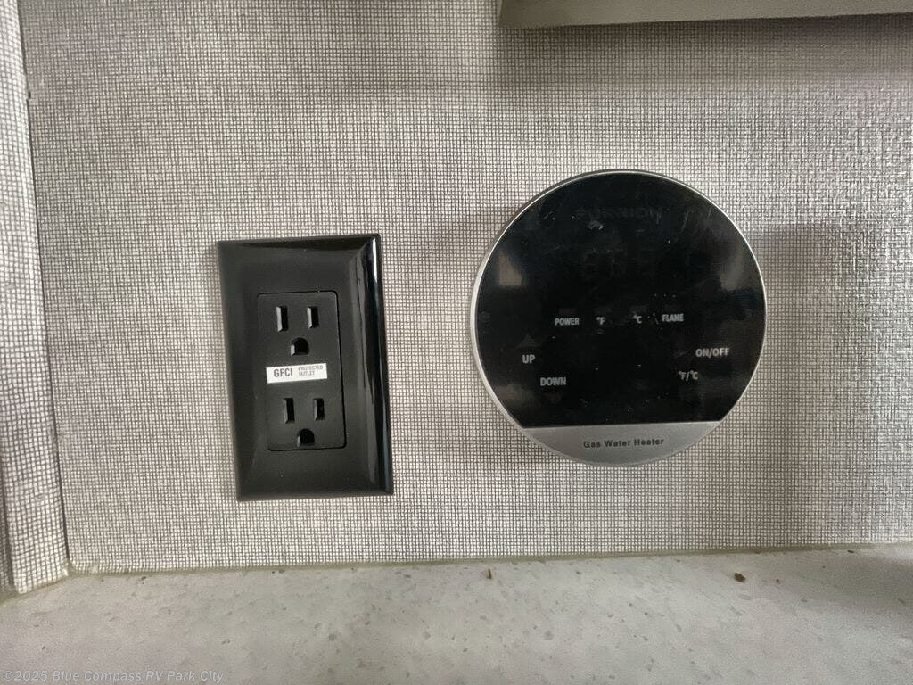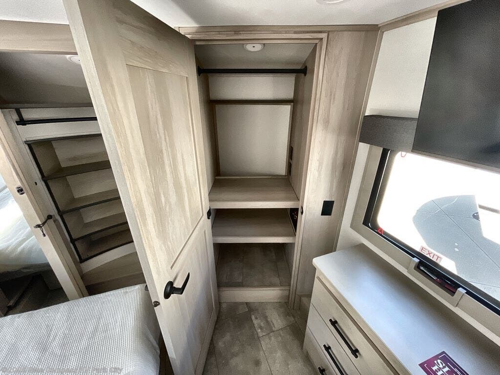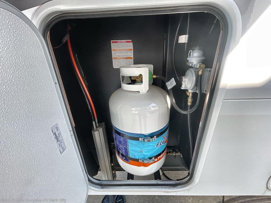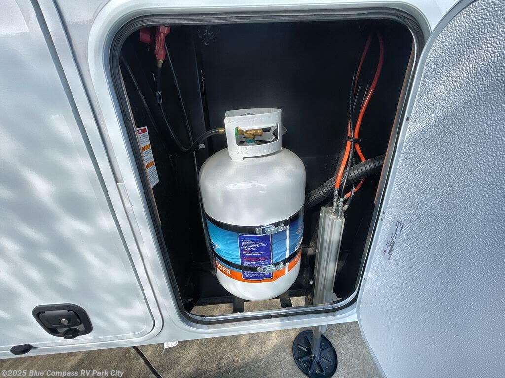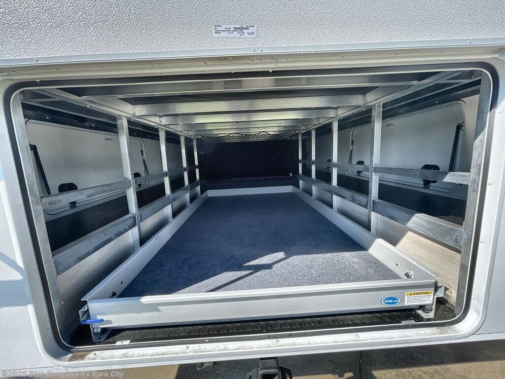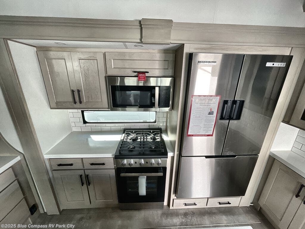 Each minute spent in this spacious fifth wheel will feel just like home! The rear living area includes a rear entertainment center with an LED Smart TV and a fireplace, overhead cabinets, theater seating, plus two tri-fold sofas for your guests to sleep on. You will have the front private bedroom all to yourselves with a queen bed slide out that can be switched out for an optional king bed, and the front closet provides all the space you need to store your belongings. This model includes a spacious full bath plus dual bath sinks for ultimate convenience. The chef of your group will love the middle kitchen with its convenient island including double sinks, a residential cooktop and built-in oven, 20 cu. ft. refrigerator, and free-standing dinette. Head outdoors to find a 16' power awning with LED lights and middle pass through along with rear storage including a sliding tray, and you might want to add the optional pull-out kitchen.